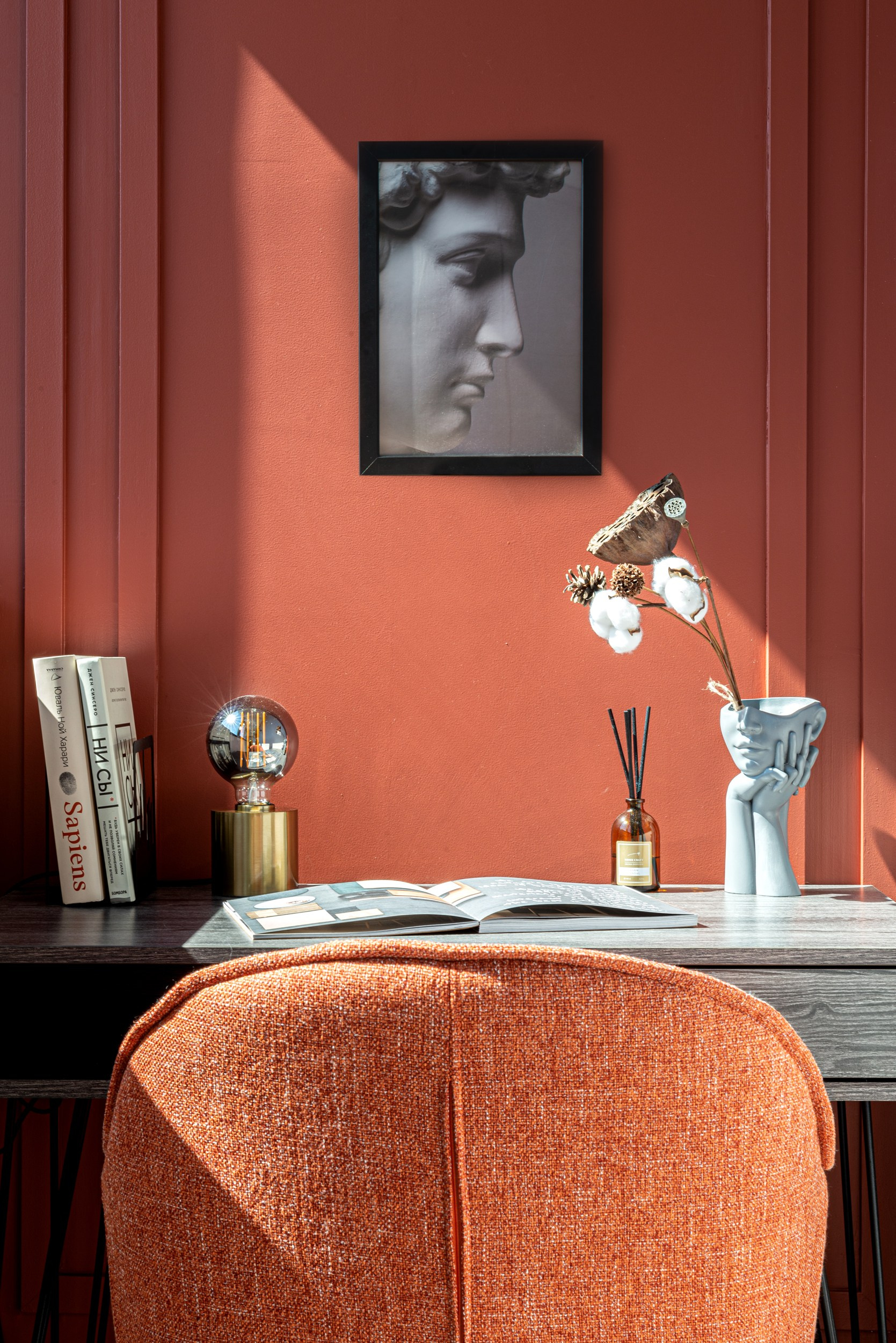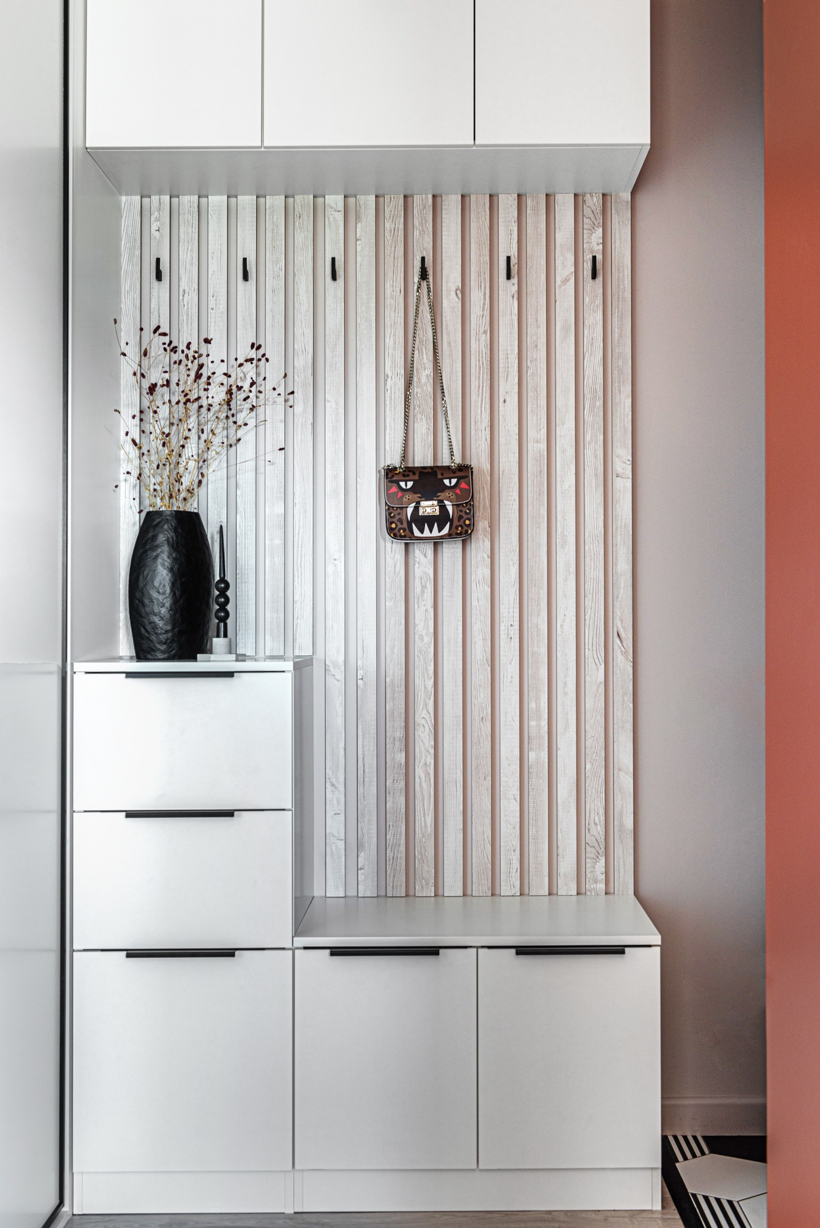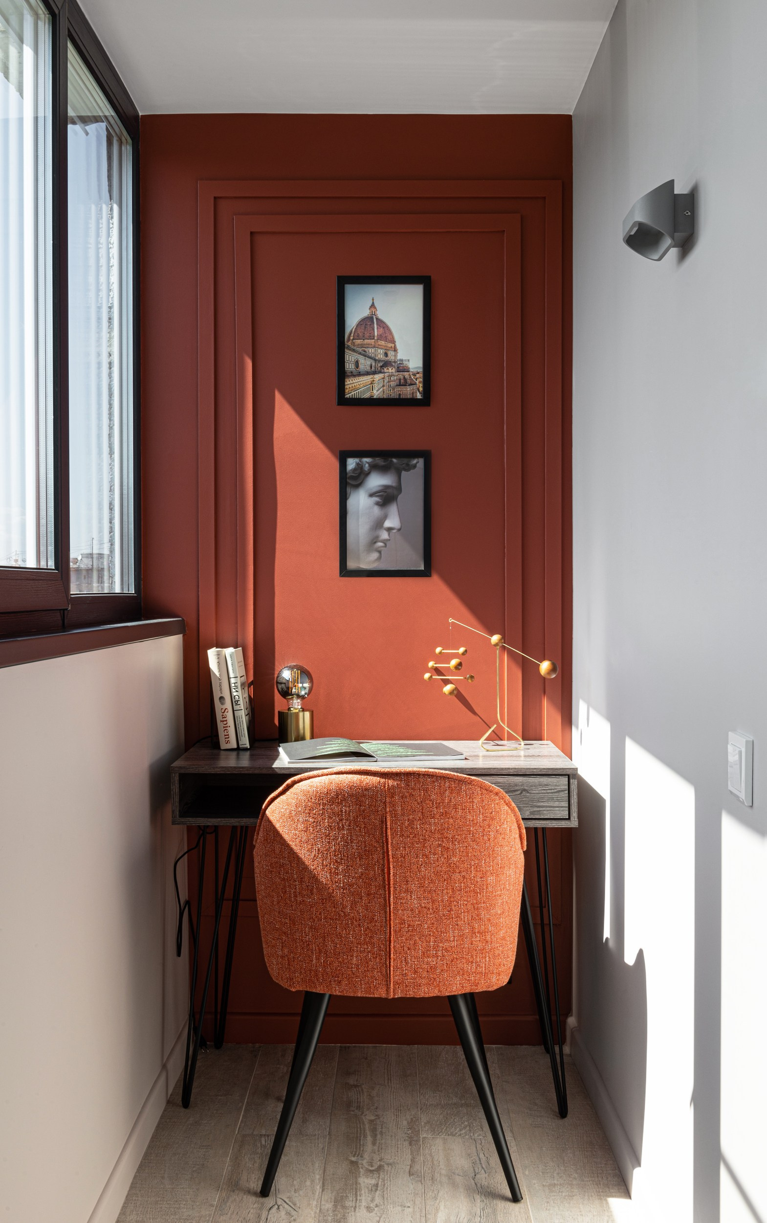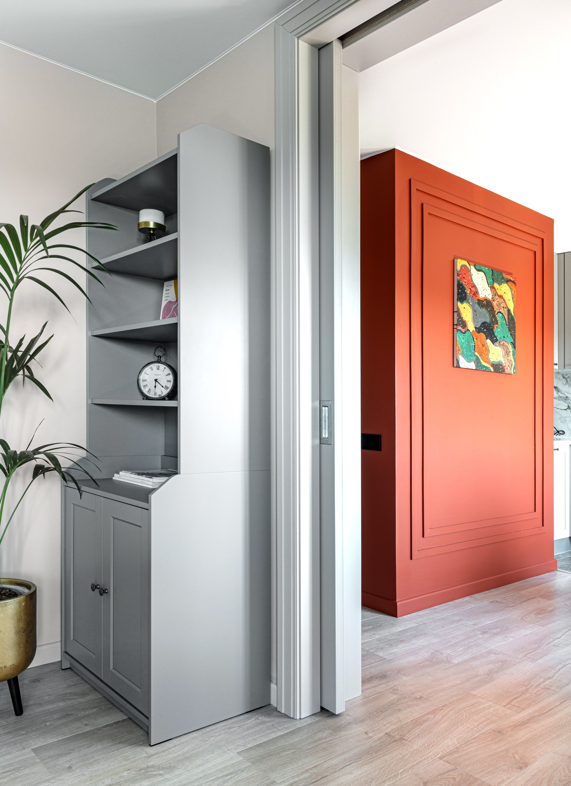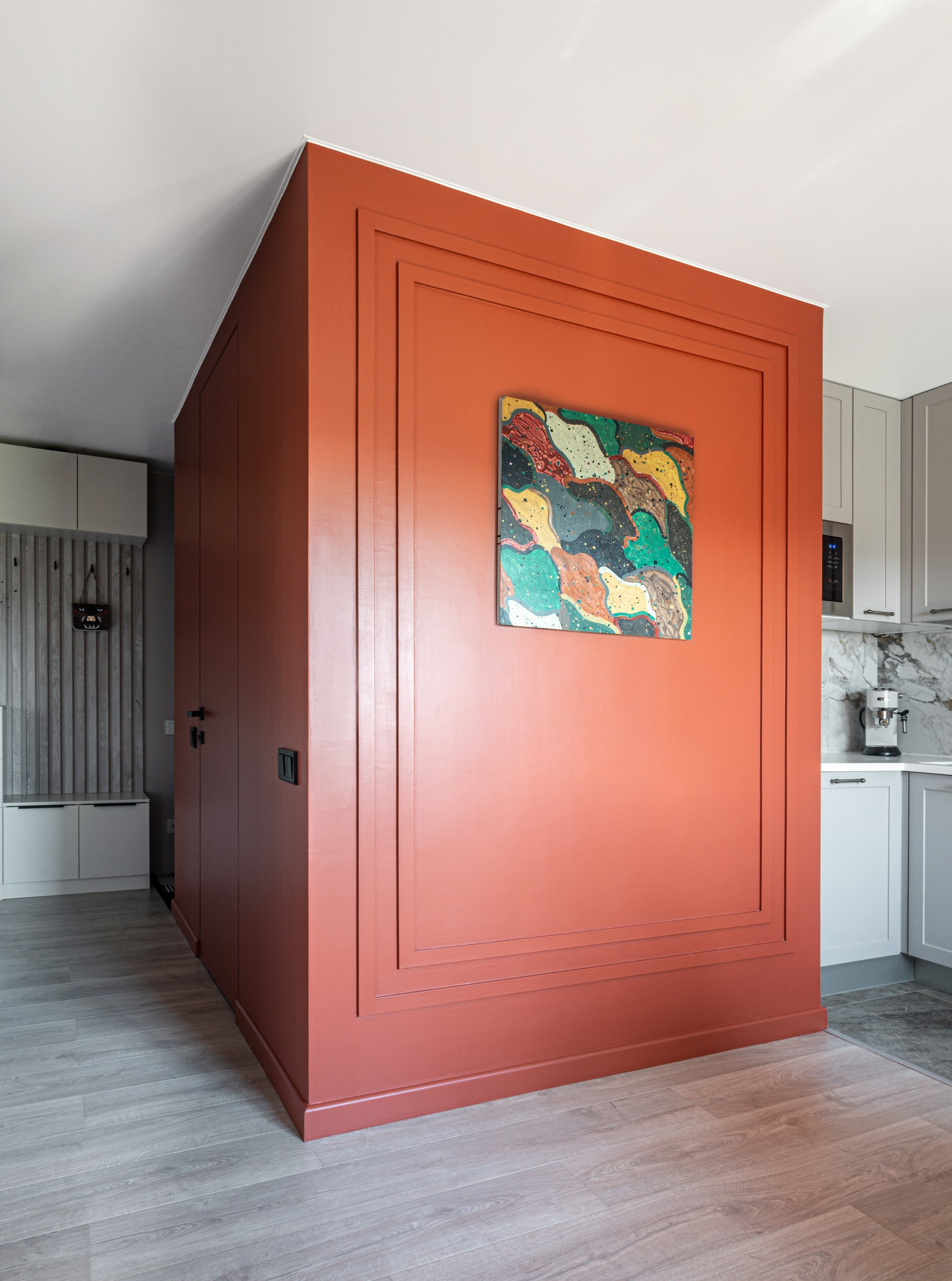 Я предложила сделать в квартире цветной терракотовый куб. Много ярких цветов не хотелось использовать, тк квартира не очень большая, а вот куб — отлично подошел, спрятал санузел и придал квартире изюминку.