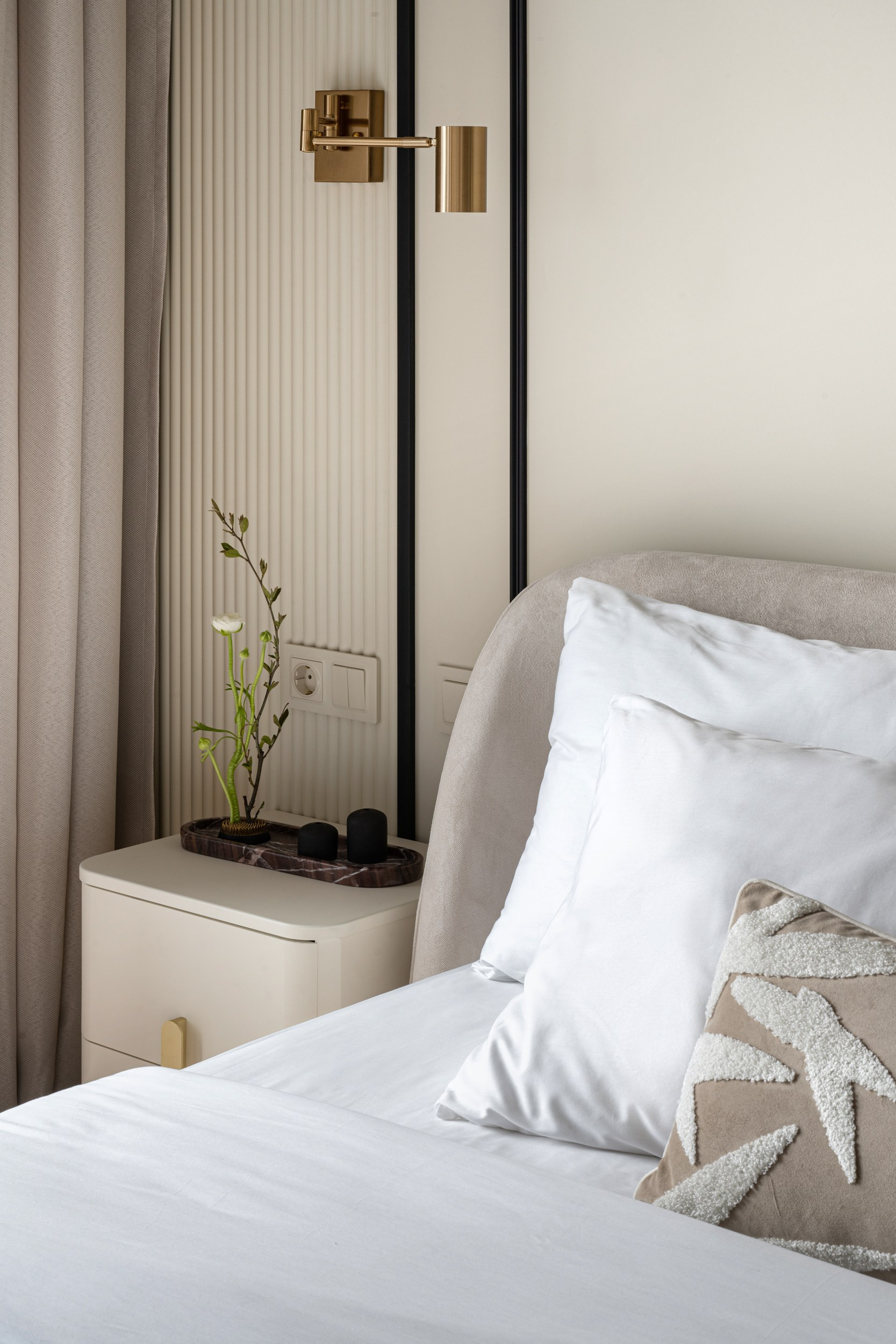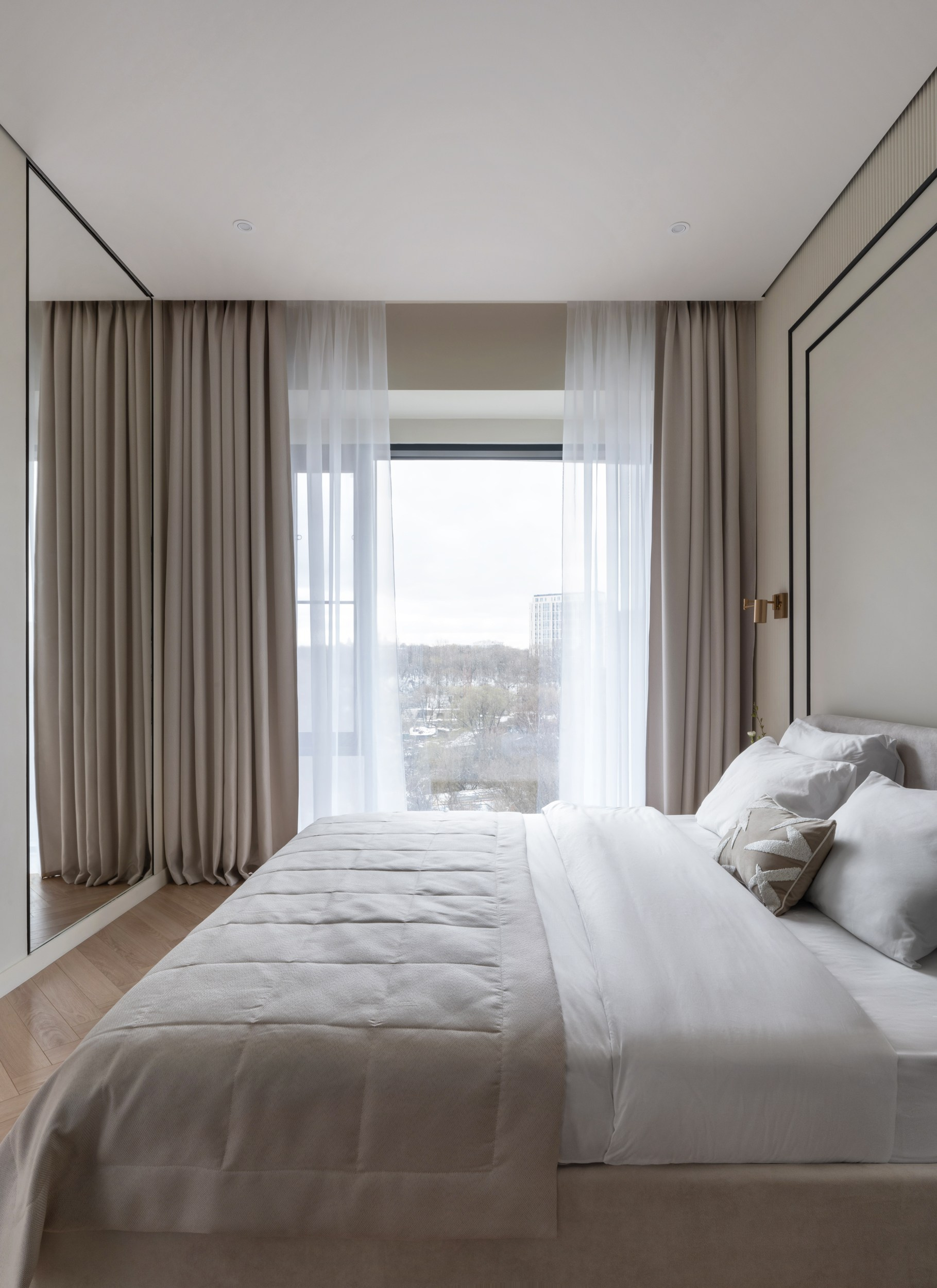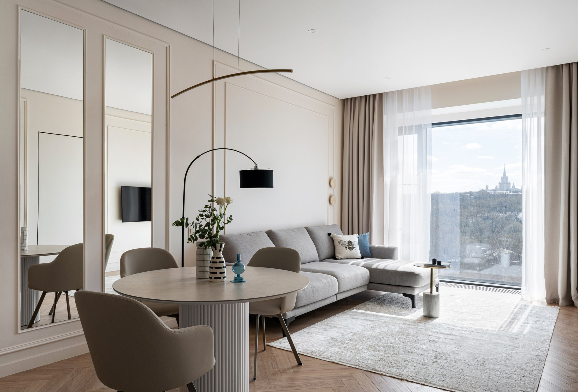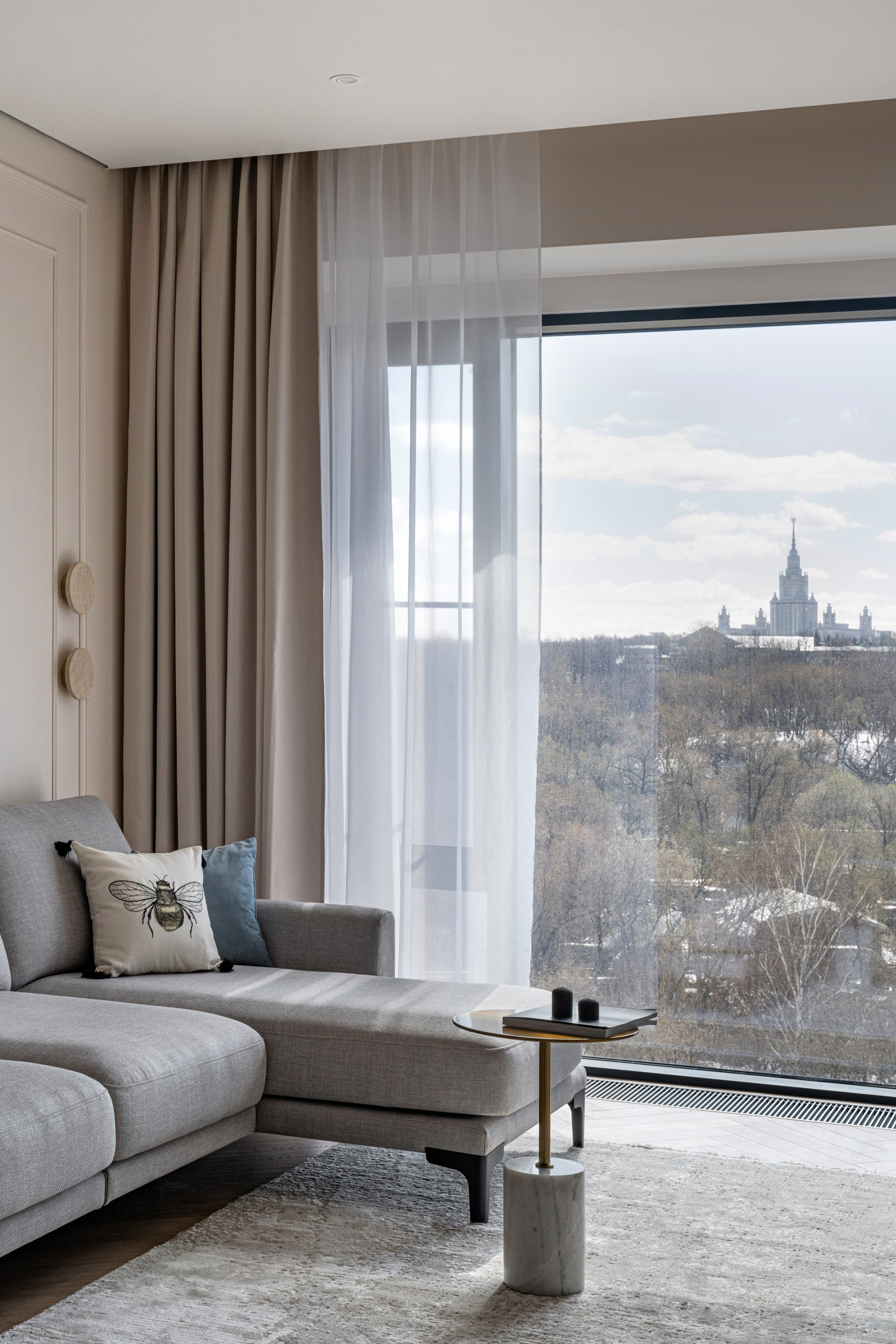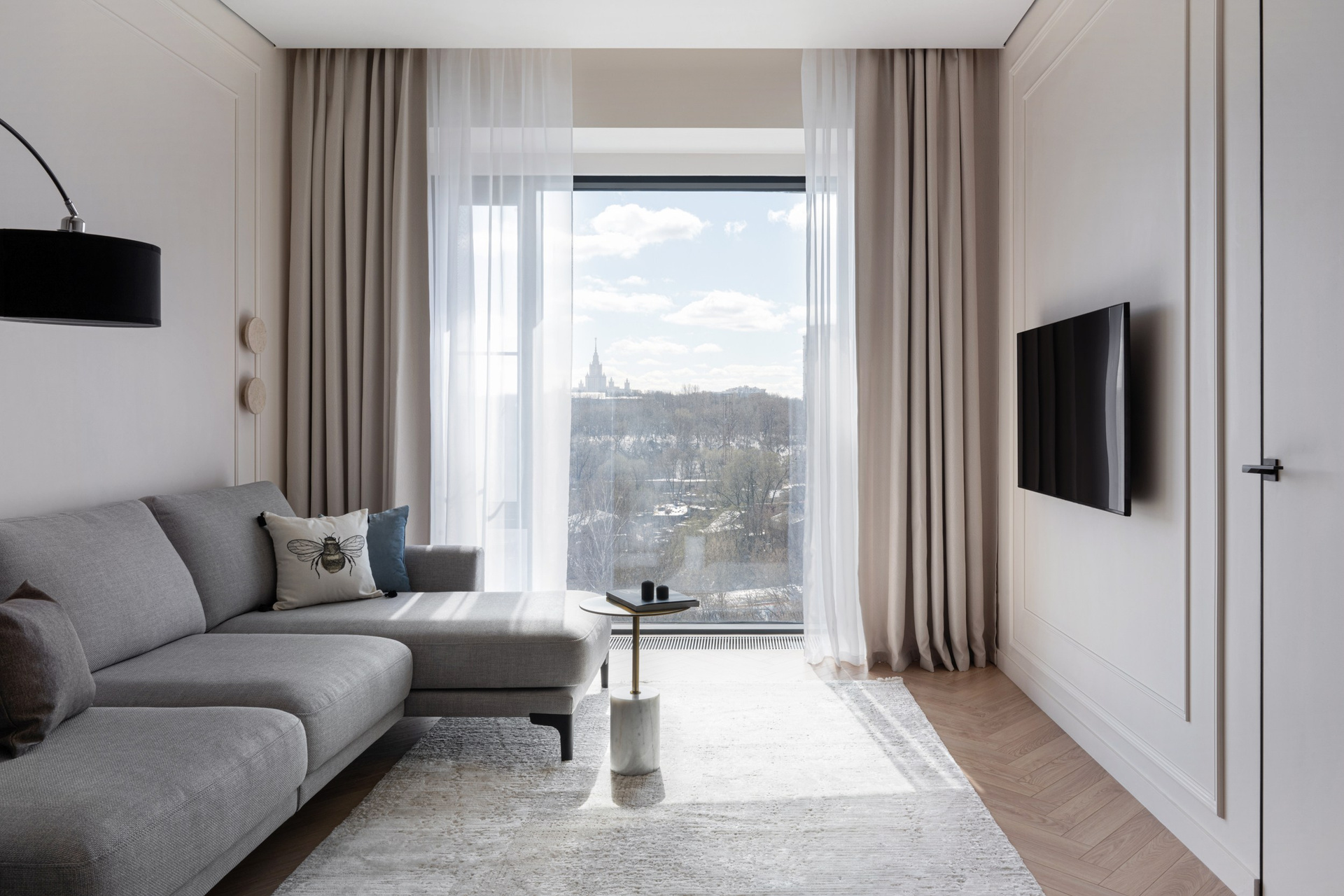 Это квартира под сдачу в премиальном ЖК. Я внедрила здесь все атрибуты, которые ценятся клиентами в данном сегменте: нейтральные цвета с интересными акцентами, отсутствие ярко-выраженных трендов, функциональная планировка, спальня обязательно с гардеробной, просторная кухня-гостиная, много мест для хранения. Ну, и, конечно, шикарный вид на МГУ, хотя это и не моя заслуга))). Квартира быстро и очень дорого сдалась.