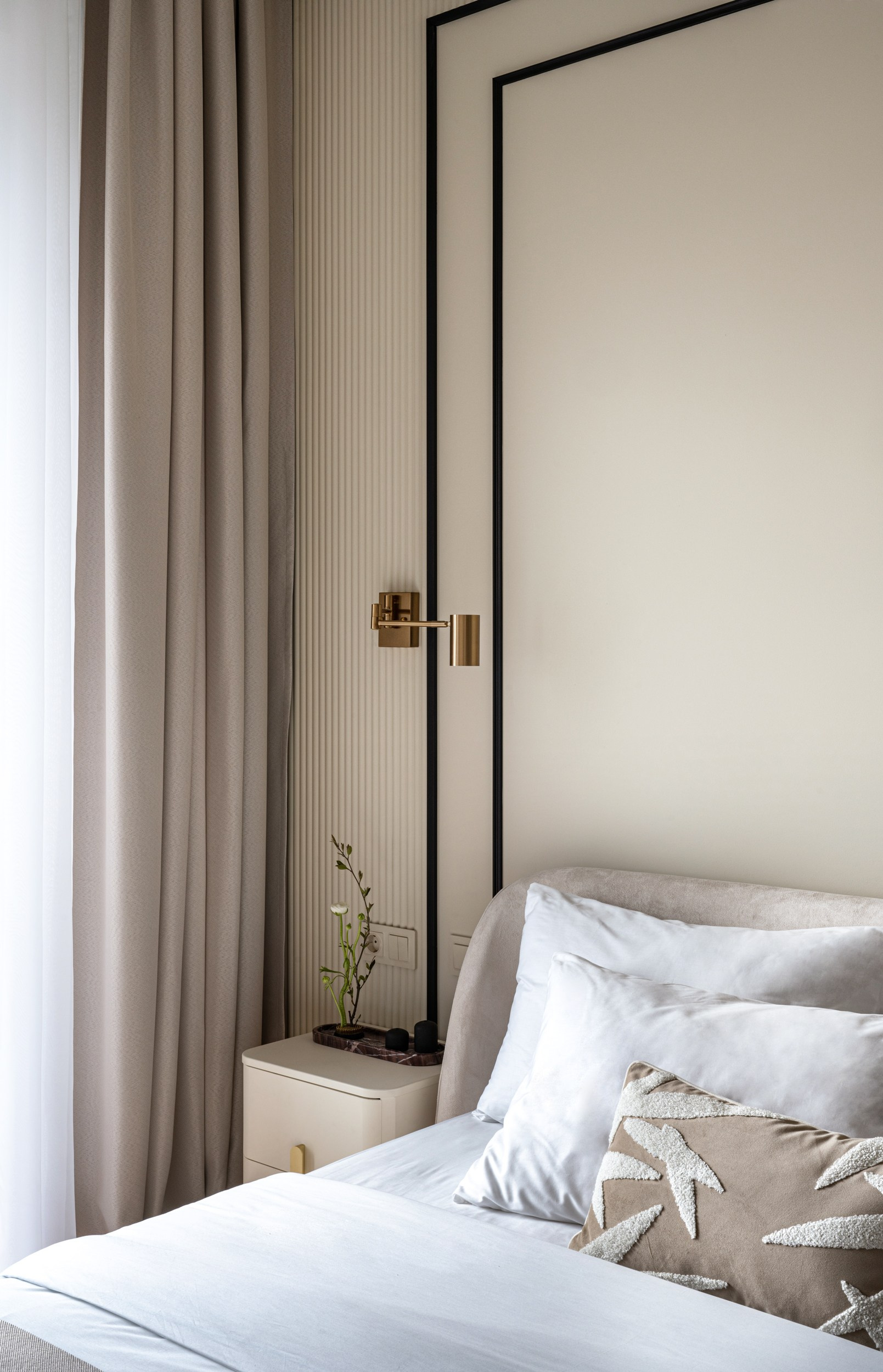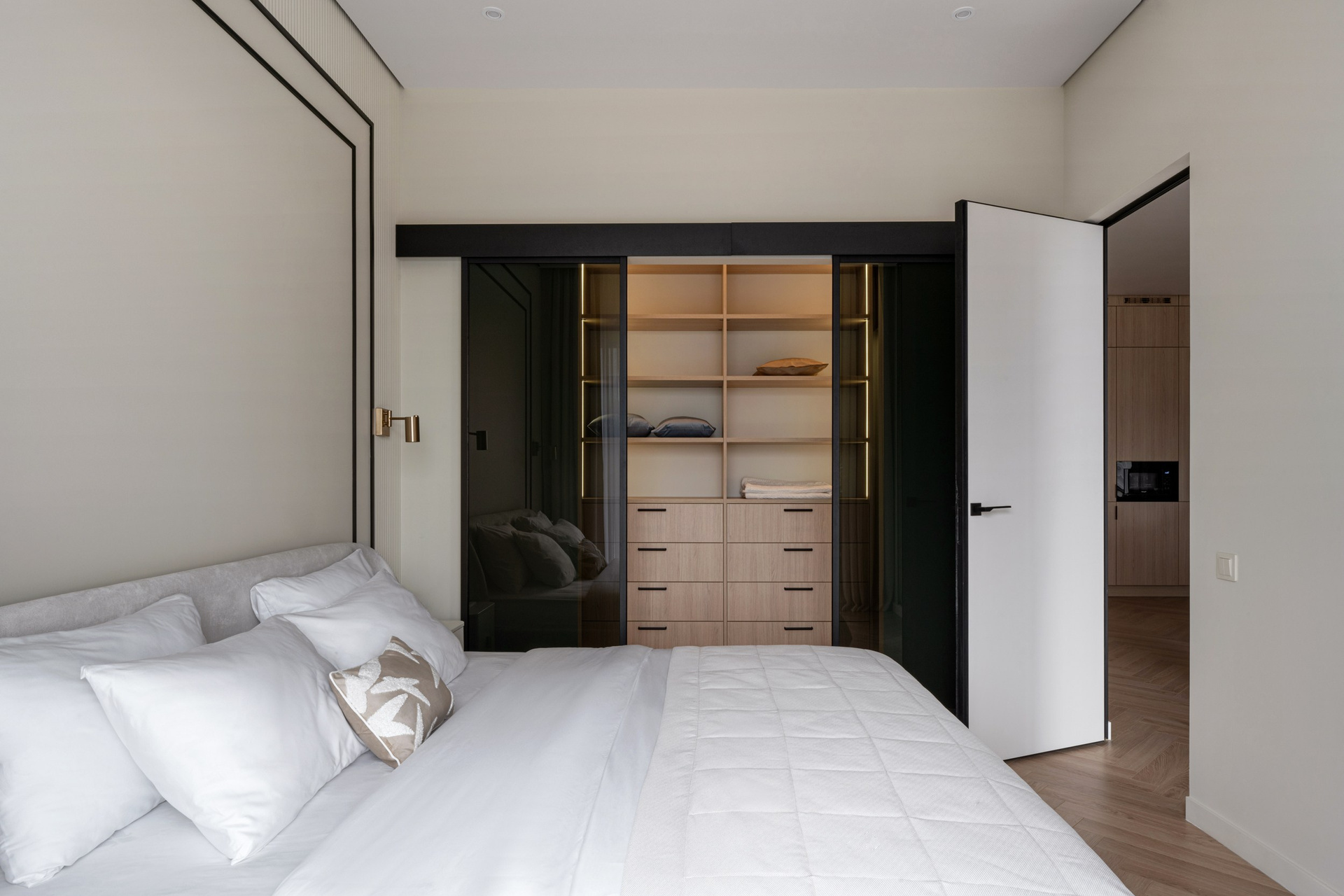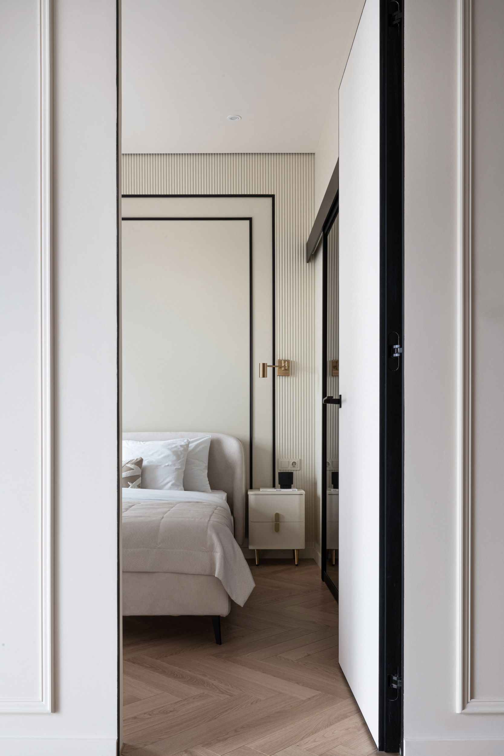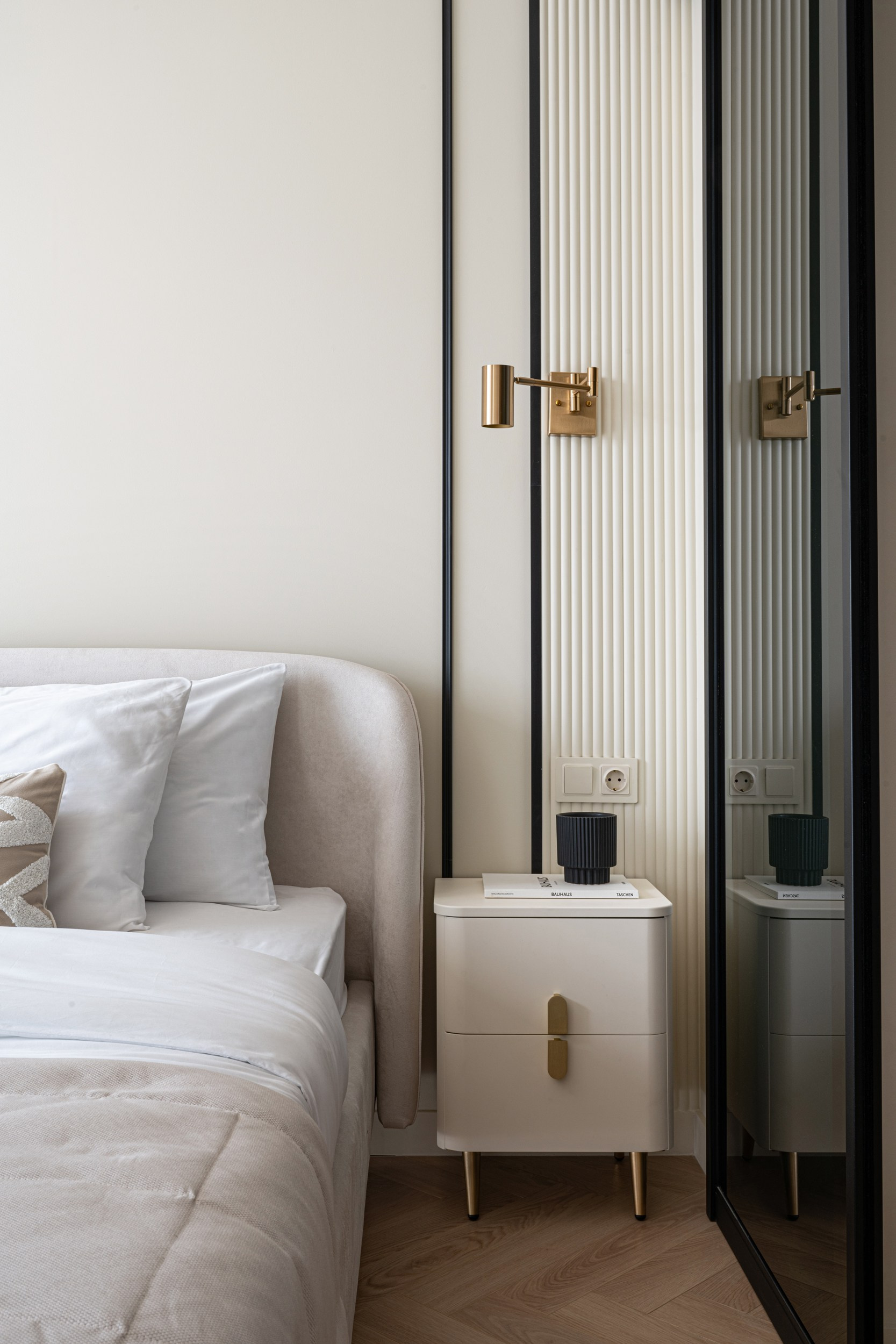 Это квартира под сдачу в премиальном ЖК. Я внедрила здесь все атрибуты, которые ценятся клиентами в данном сегменте: нейтральные цвета с интересными акцентами, отсутствие ярко-выраженных трендов, функциональная планировка, спальня обязательно с гардеробной, просторная кухня-гостиная, много мест для хранения. Ну, и, конечно, шикарный вид на МГУ, хотя это и не моя заслуга))). Квартира быстро и очень дорого сдалась.