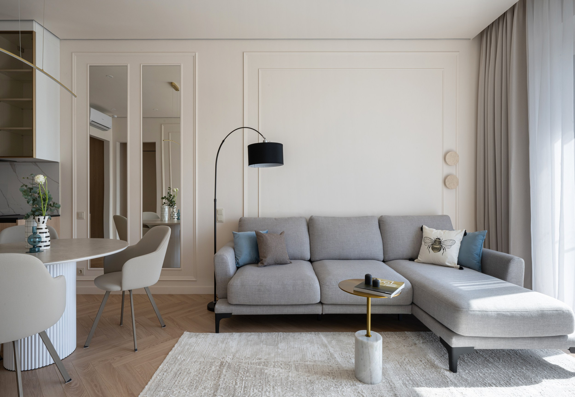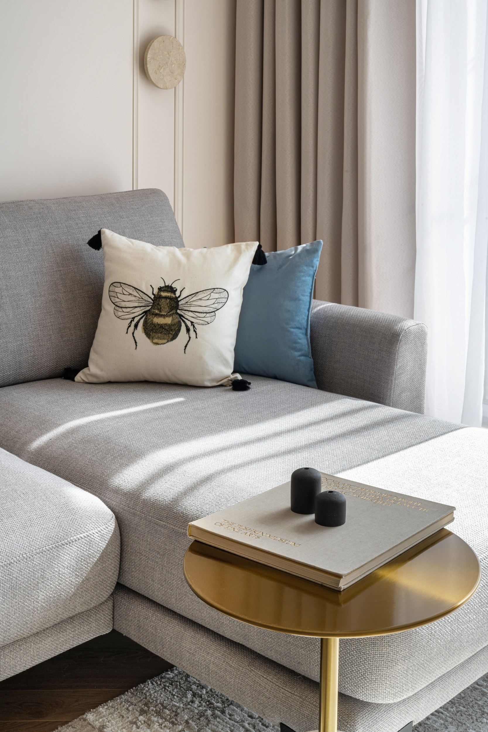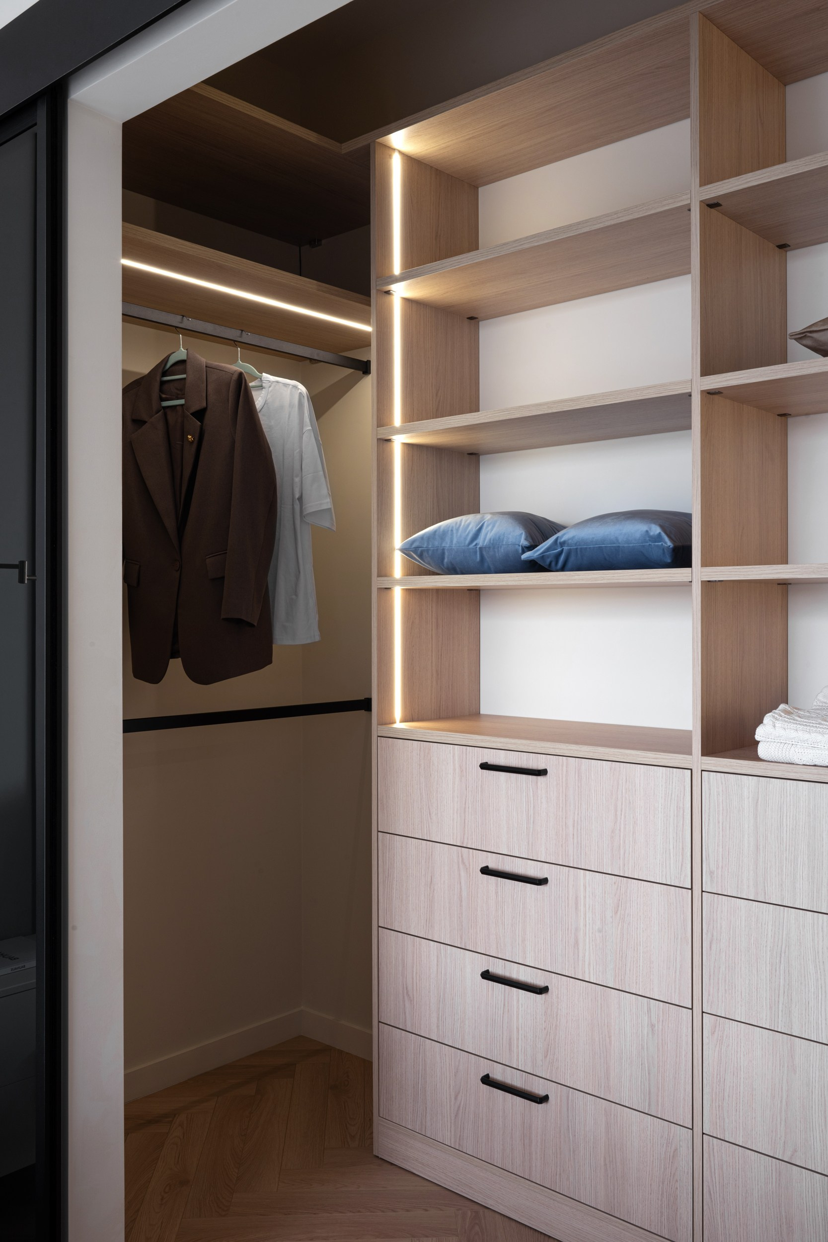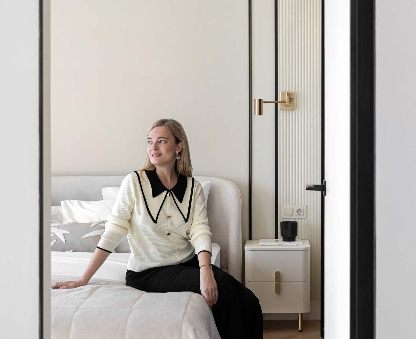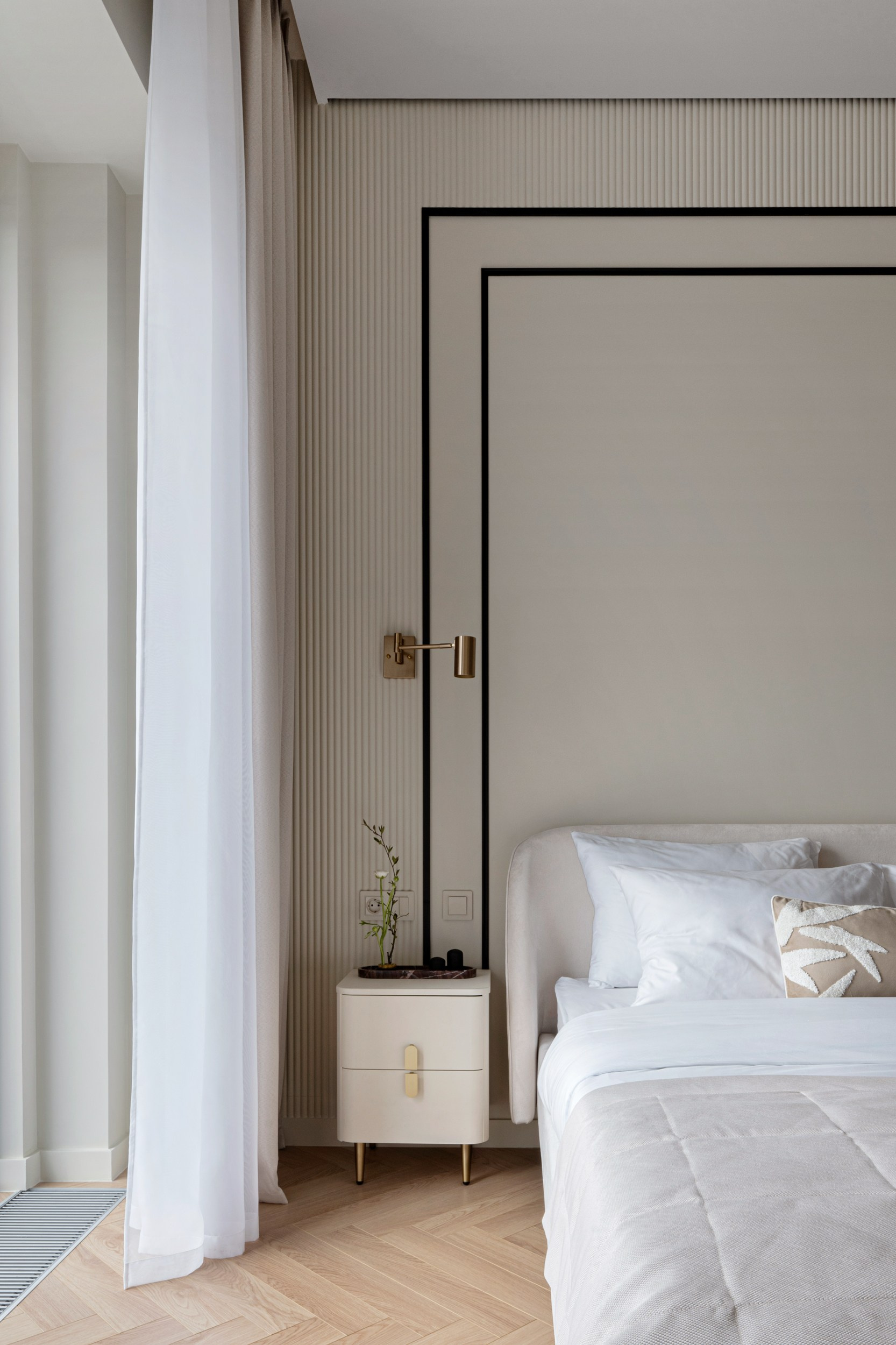 Это квартира под сдачу в премиальном ЖК. Я внедрила здесь все атрибуты, которые ценятся клиентами в данном сегменте: нейтральные цвета с интересными акцентами, отсутствие ярко-выраженных трендов, функциональная планировка, спальня обязательно с гардеробной, просторная кухня-гостиная, много мест для хранения. Ну, и, конечно, шикарный вид на МГУ, хотя это и не моя заслуга))). Квартира быстро и очень дорого сдалась.
