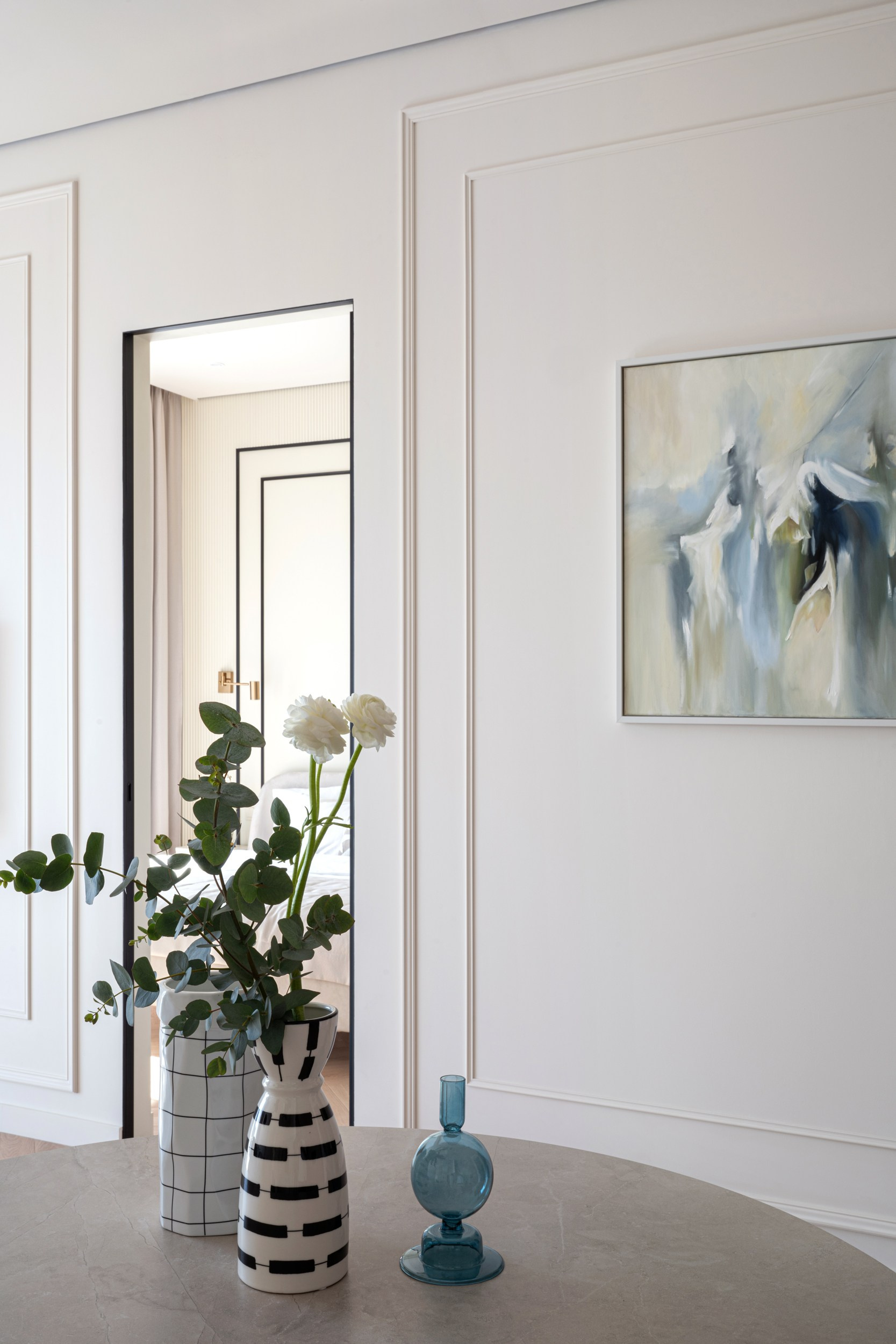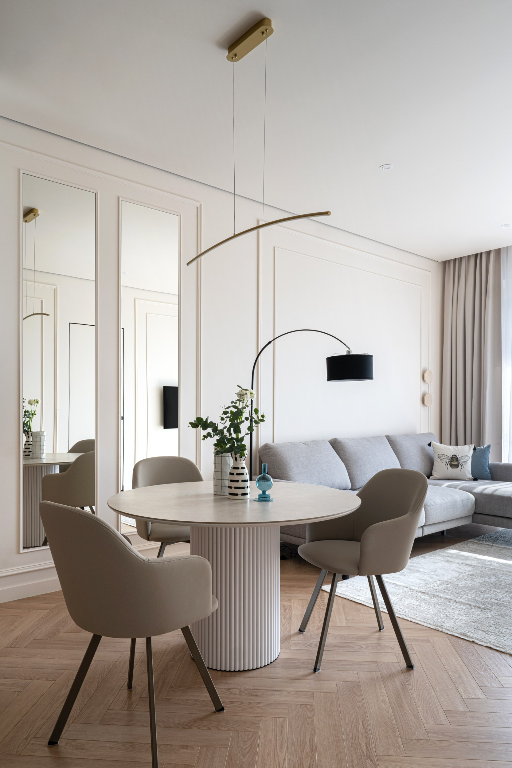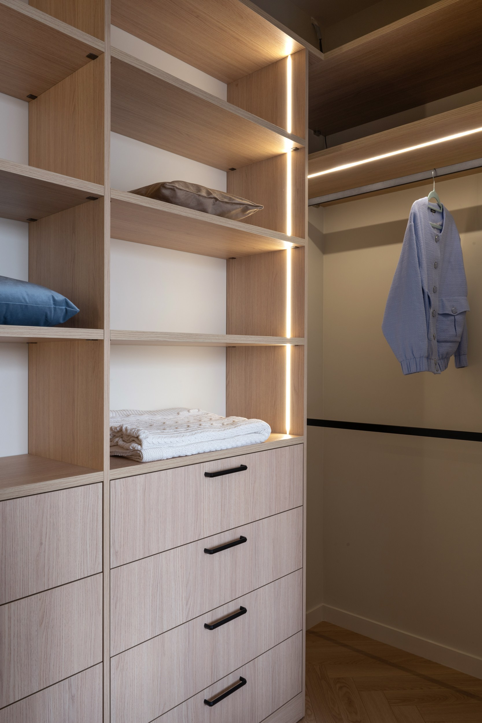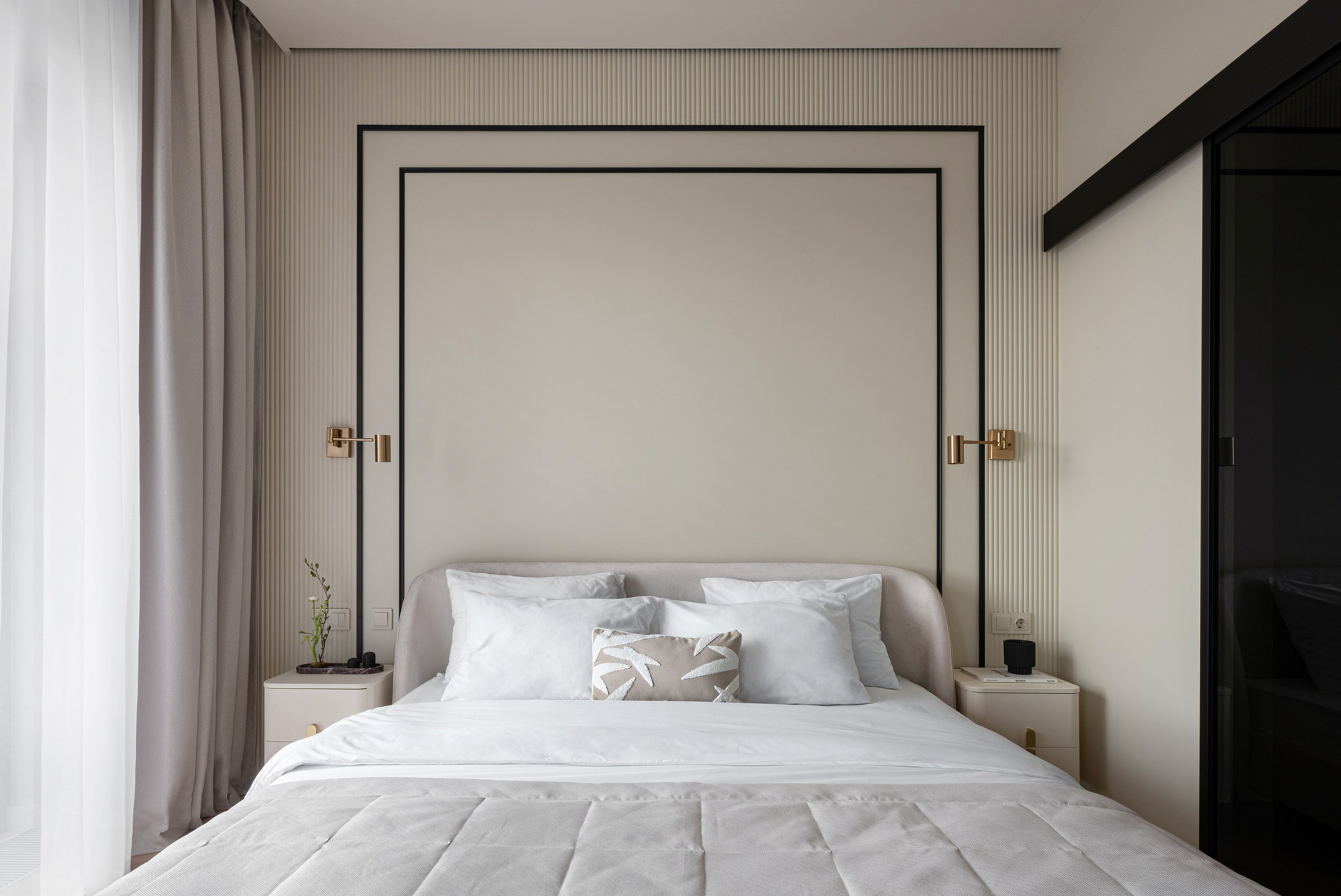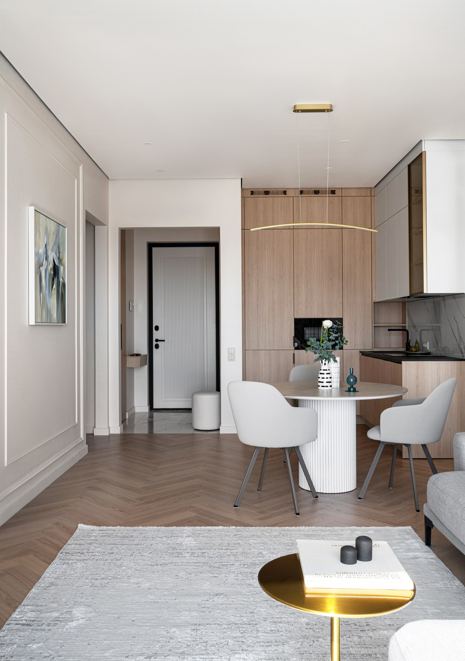 Это квартира под сдачу в премиальном ЖК. Я внедрила здесь все атрибуты, которые ценятся клиентами в данном сегменте: нейтральные цвета с интересными акцентами, отсутствие ярко-выраженных трендов, функциональная планировка, спальня обязательно с гардеробной, просторная кухня-гостиная, много мест для хранения. Ну, и, конечно, шикарный вид на МГУ, хотя это и не моя заслуга))). Квартира быстро и очень дорого сдалась.