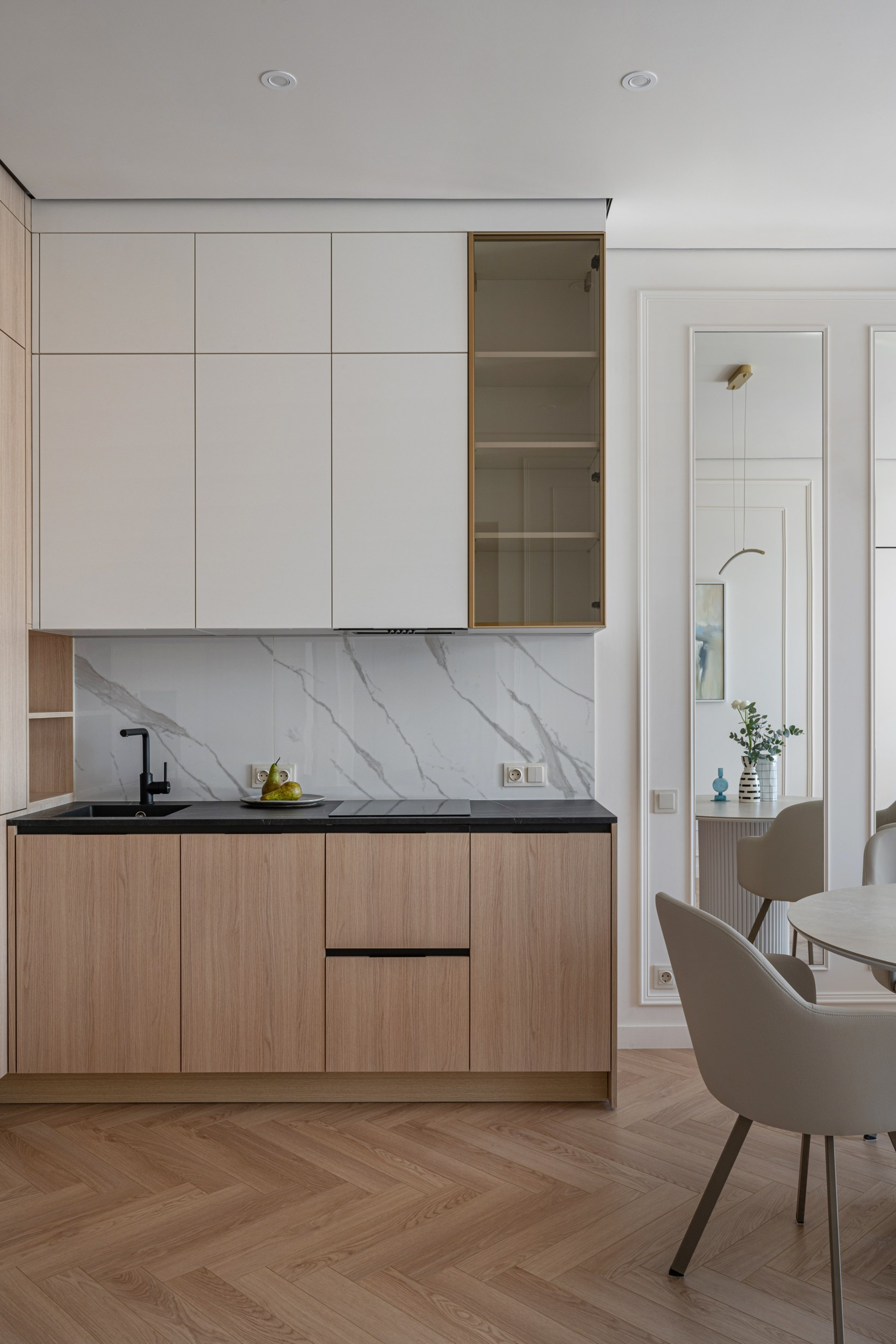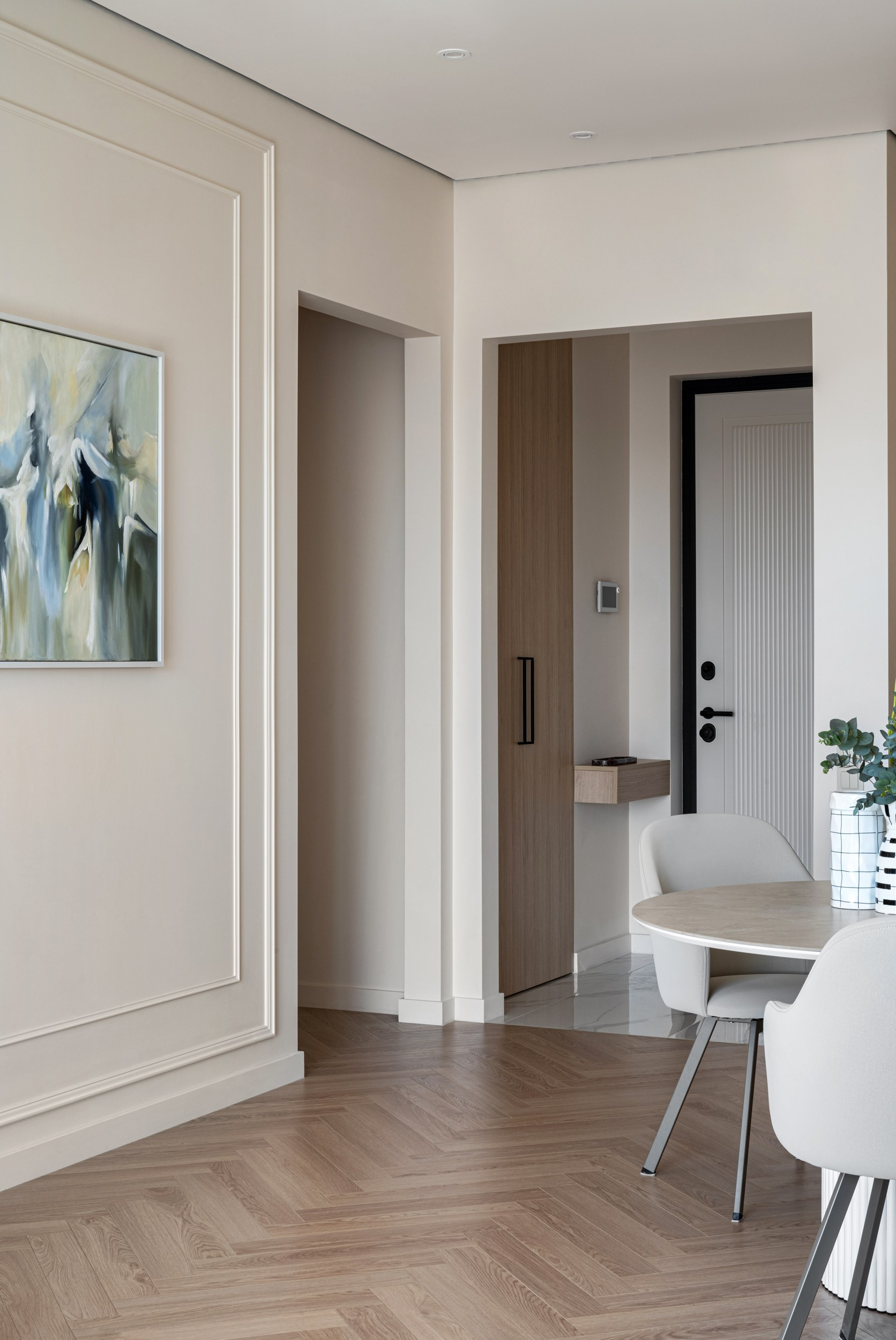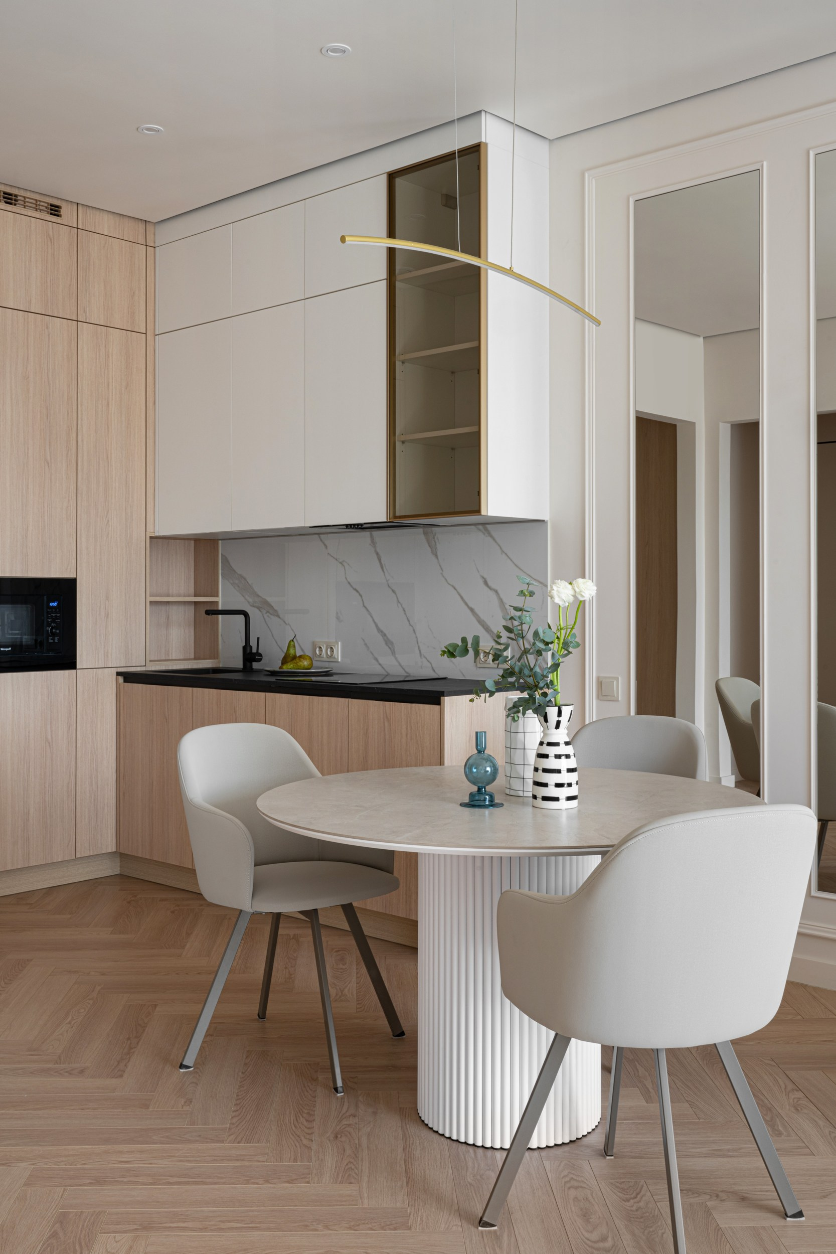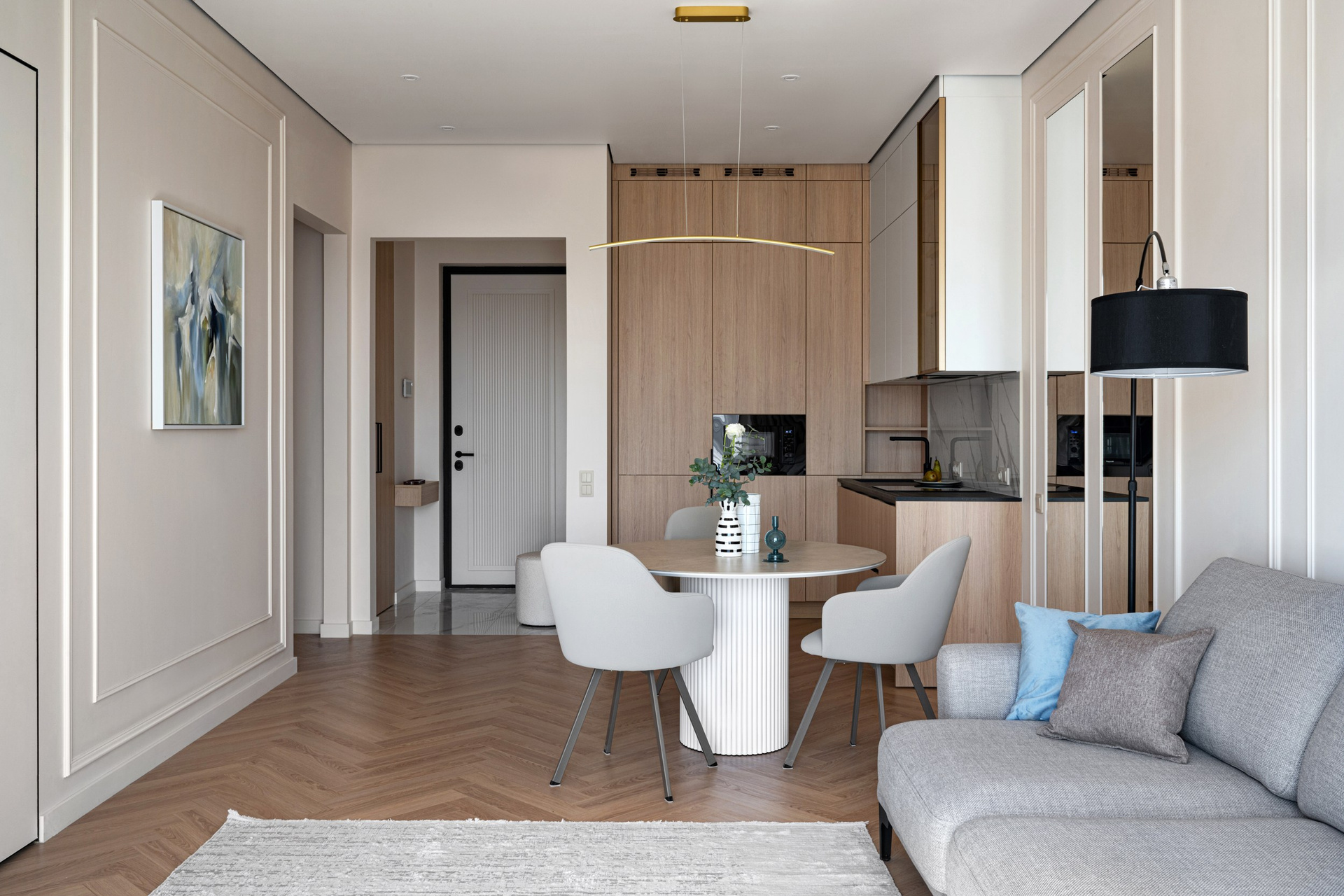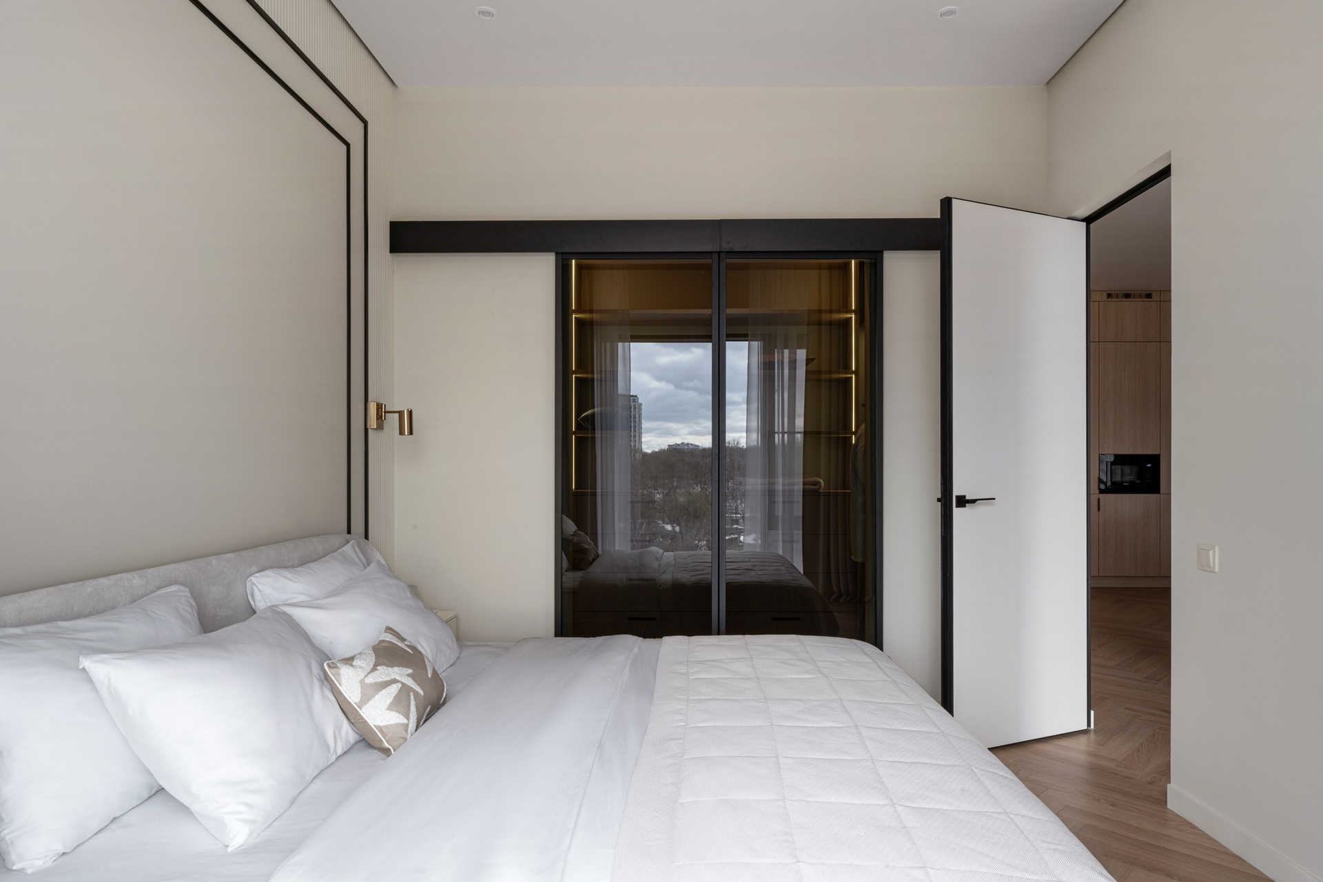 Это квартира под сдачу в премиальном ЖК. Я внедрила здесь все атрибуты, которые ценятся клиентами в данном сегменте: нейтральные цвета с интересными акцентами, отсутствие ярко-выраженных трендов, функциональная планировка, спальня обязательно с гардеробной, просторная кухня-гостиная, много мест для хранения. Ну, и, конечно, шикарный вид на МГУ, хотя это и не моя заслуга))). Квартира быстро и очень дорого сдалась.