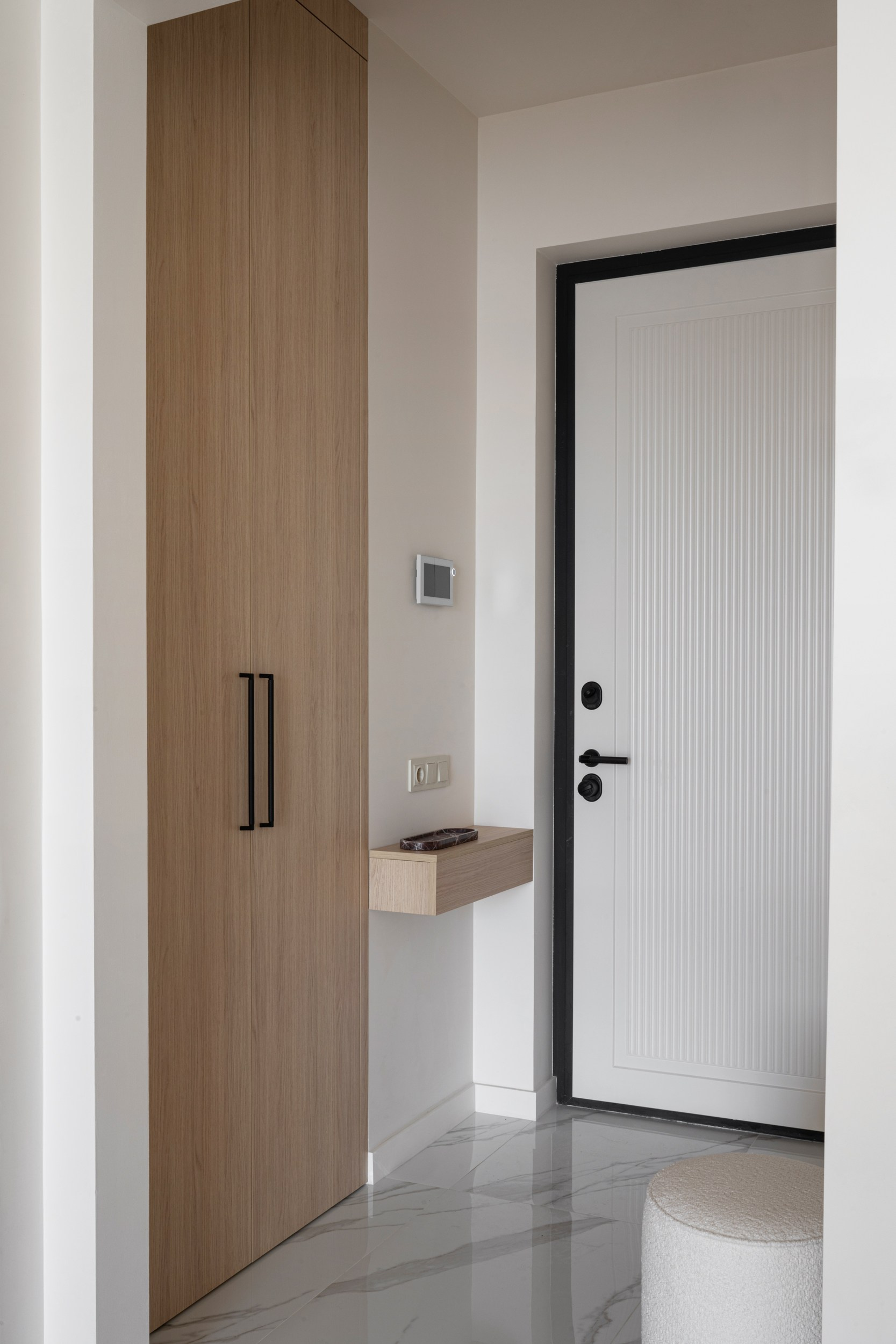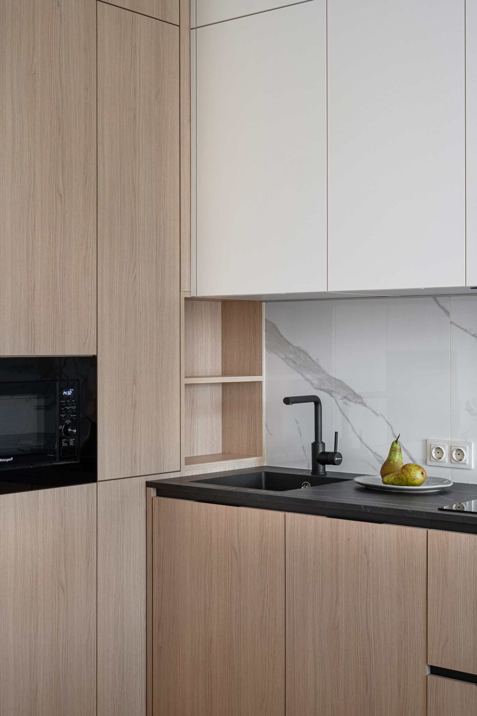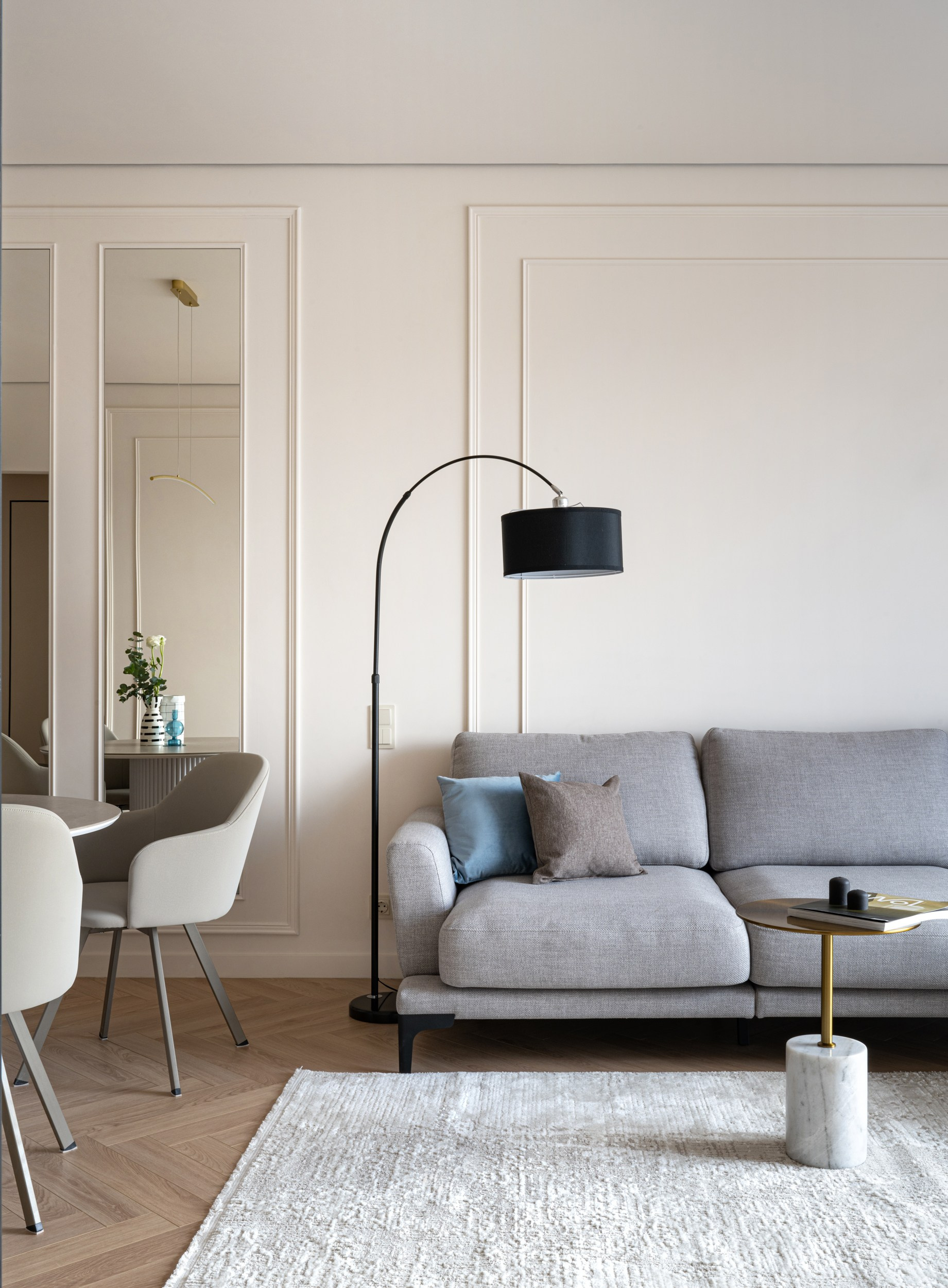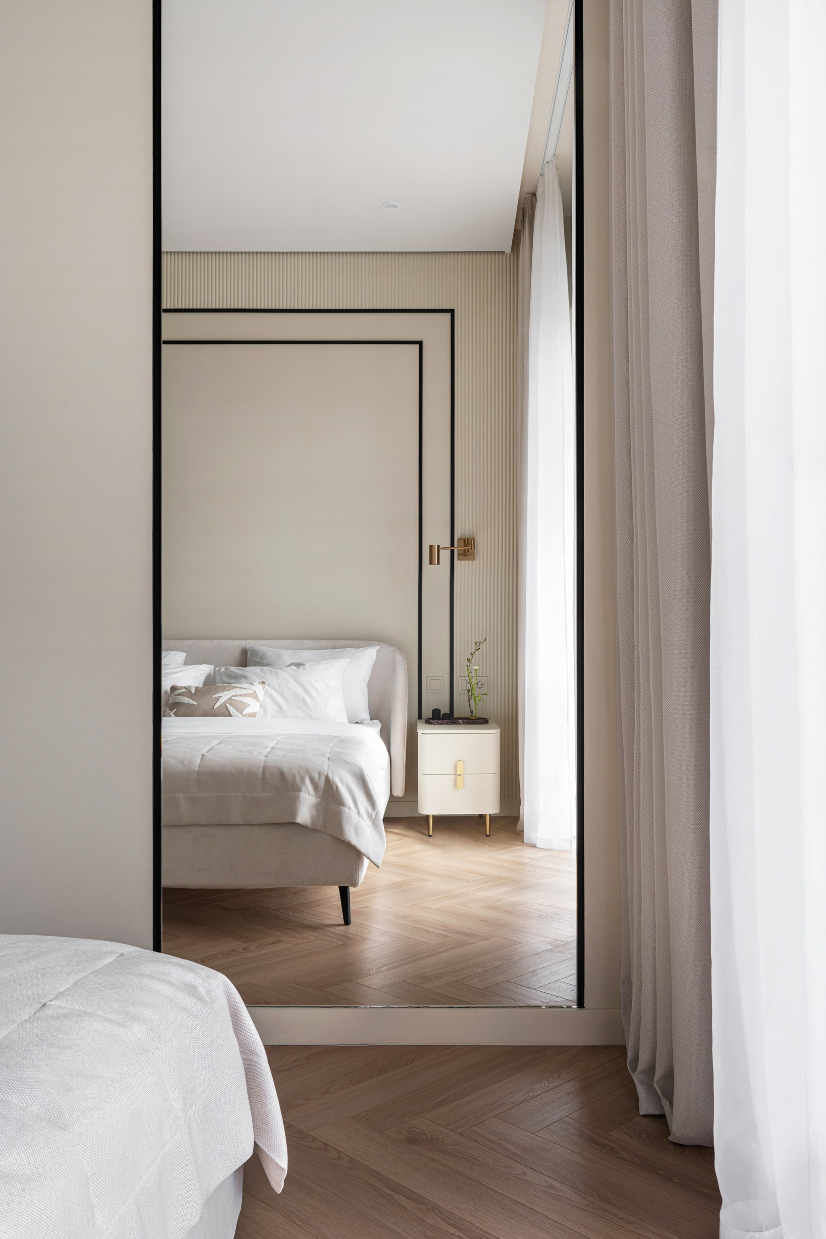 Это квартира под сдачу в премиальном ЖК. Я внедрила здесь все атрибуты, которые ценятся клиентами в данном сегменте: нейтральные цвета с интересными акцентами, отсутствие ярко-выраженных трендов, функциональная планировка, спальня обязательно с гардеробной, просторная кухня-гостиная, много мест для хранения. Ну, и, конечно, шикарный вид на МГУ, хотя это и не моя заслуга))). Квартира быстро и очень дорого сдалась.
