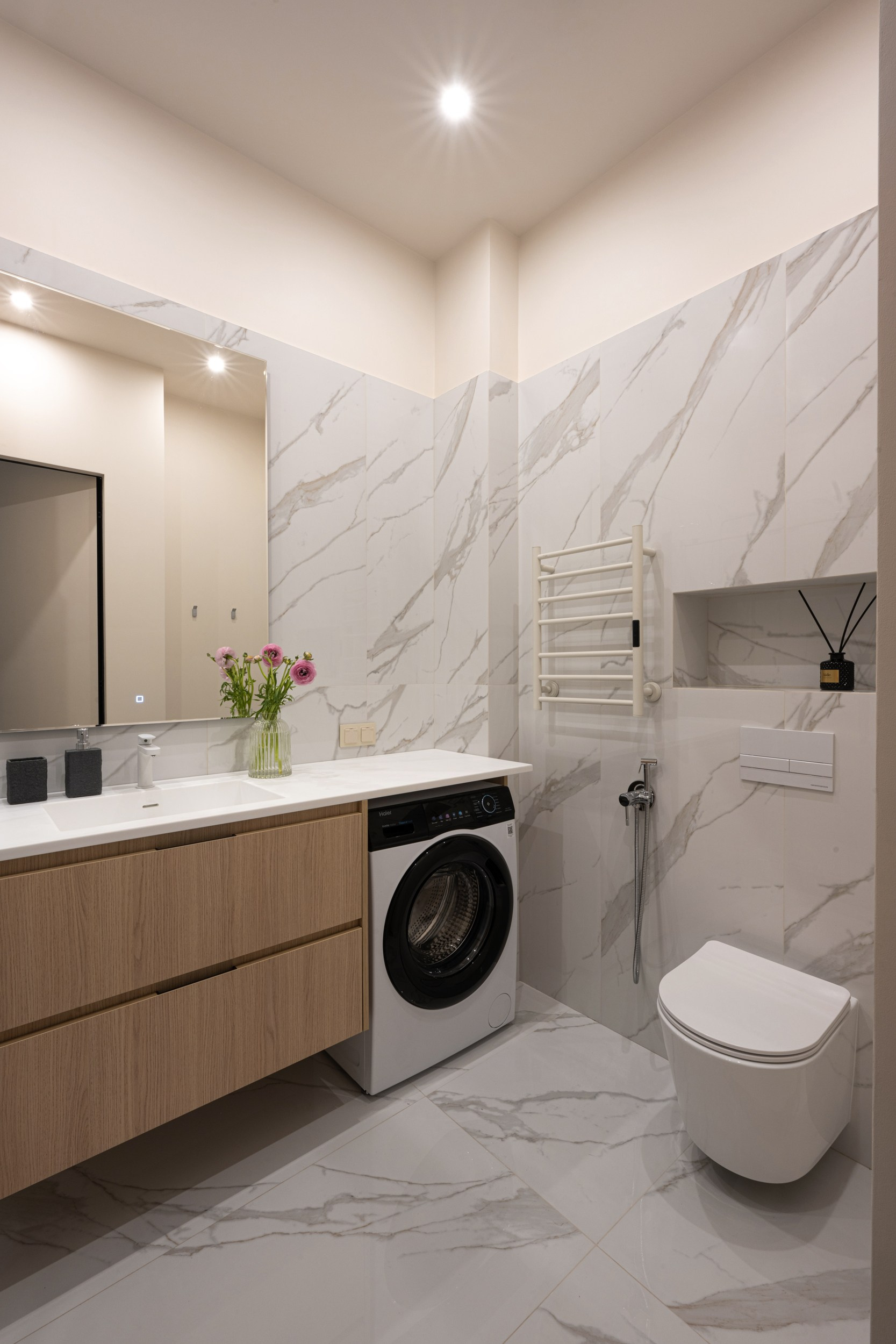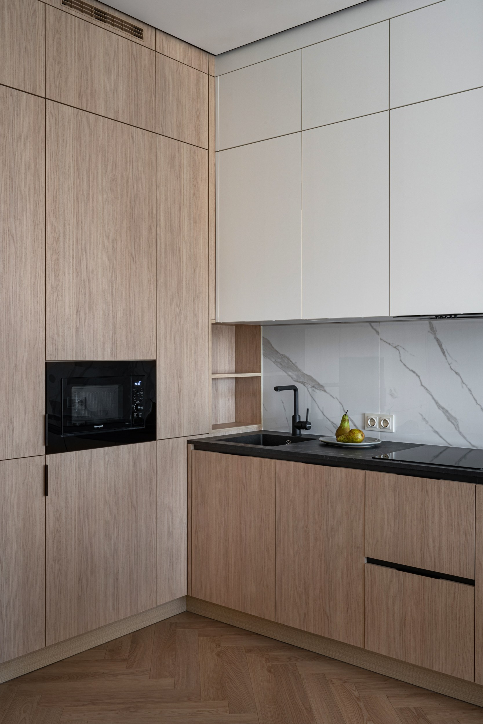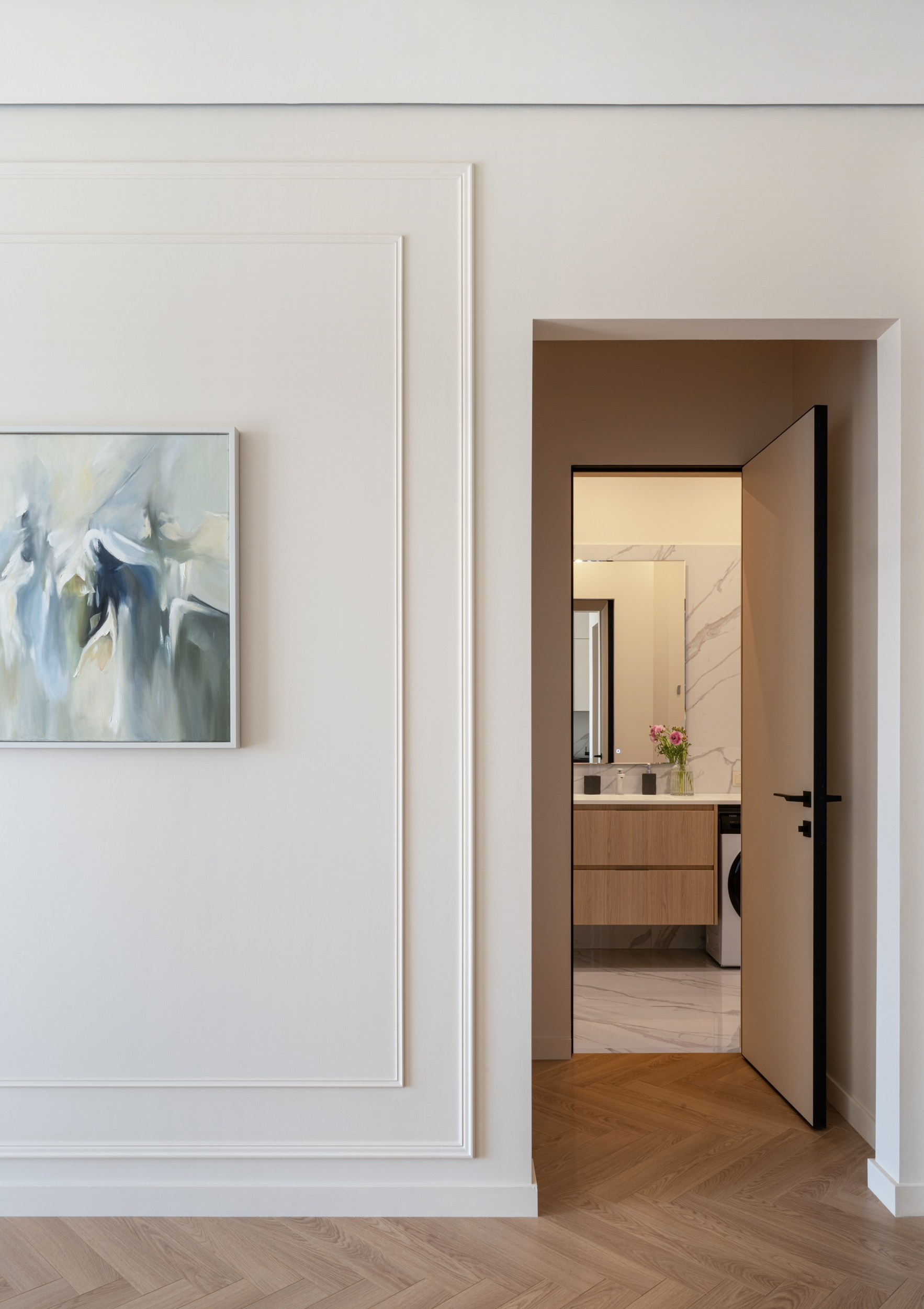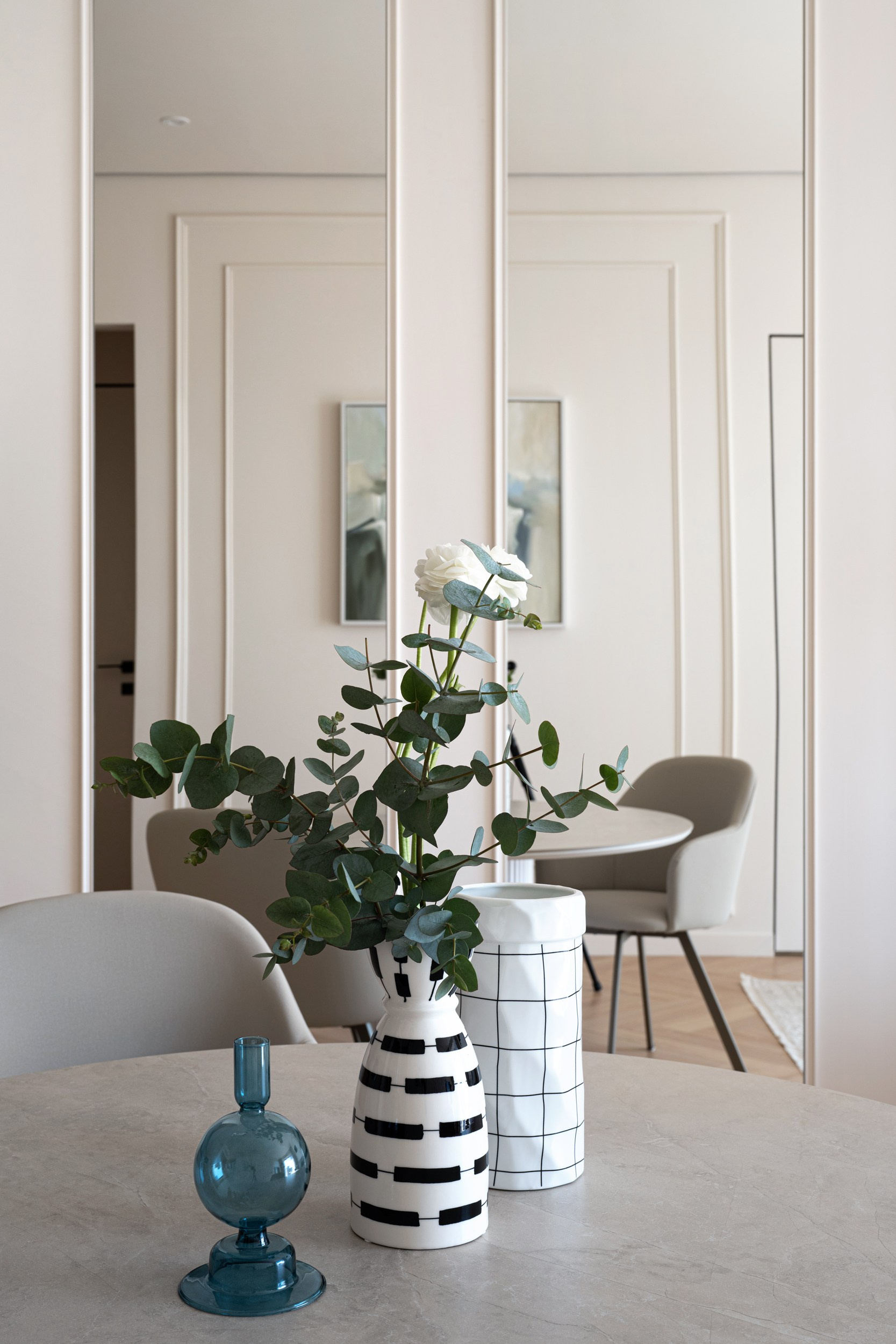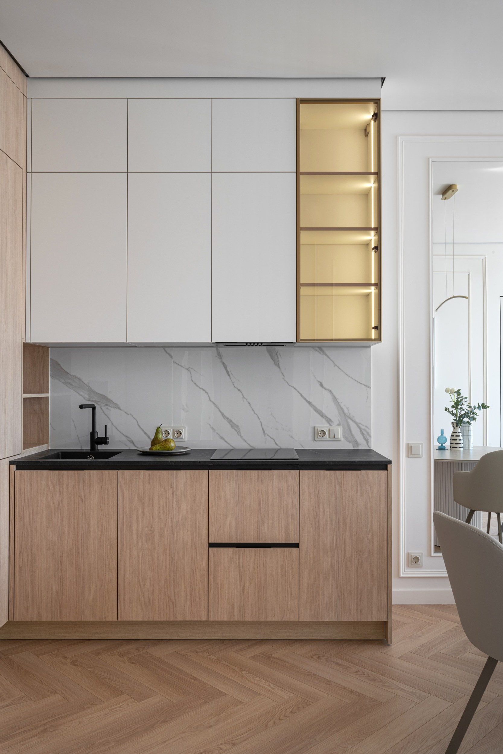Это квартира под сдачу в премиальном ЖК. Я внедрила здесь все атрибуты, которые ценятся клиентами в данном сегменте: нейтральные цвета с интересными акцентами, отсутствие ярко-выраженных трендов, функциональная планировка, спальня обязательно с гардеробной, просторная кухня-гостиная, много мест для хранения. Ну, и, конечно, шикарный вид на МГУ, хотя это и не моя заслуга))). Квартира быстро и очень дорого сдалась.