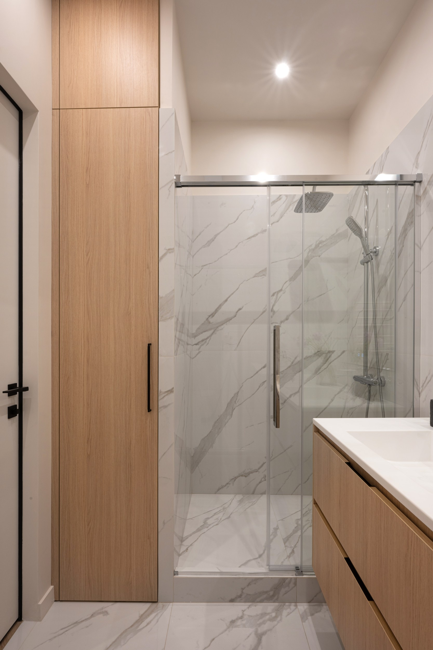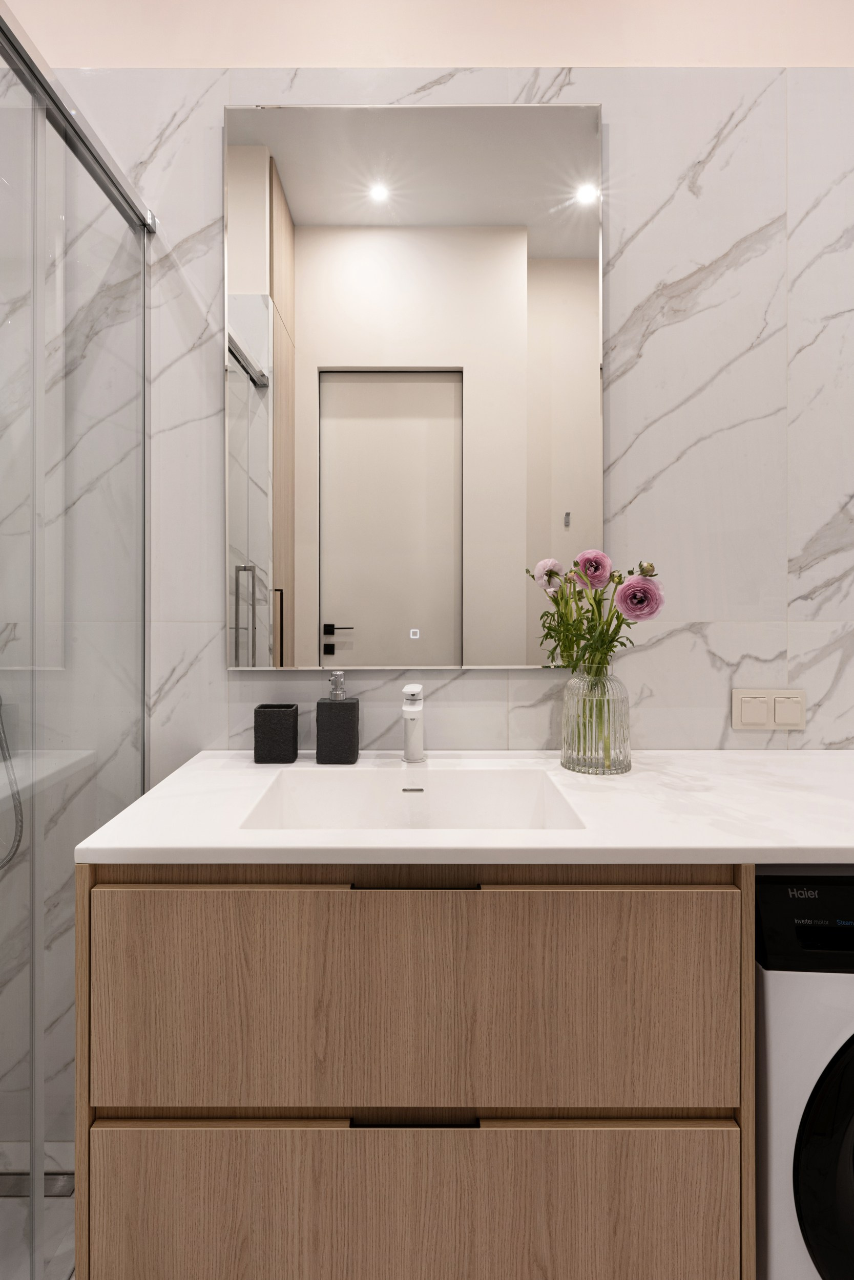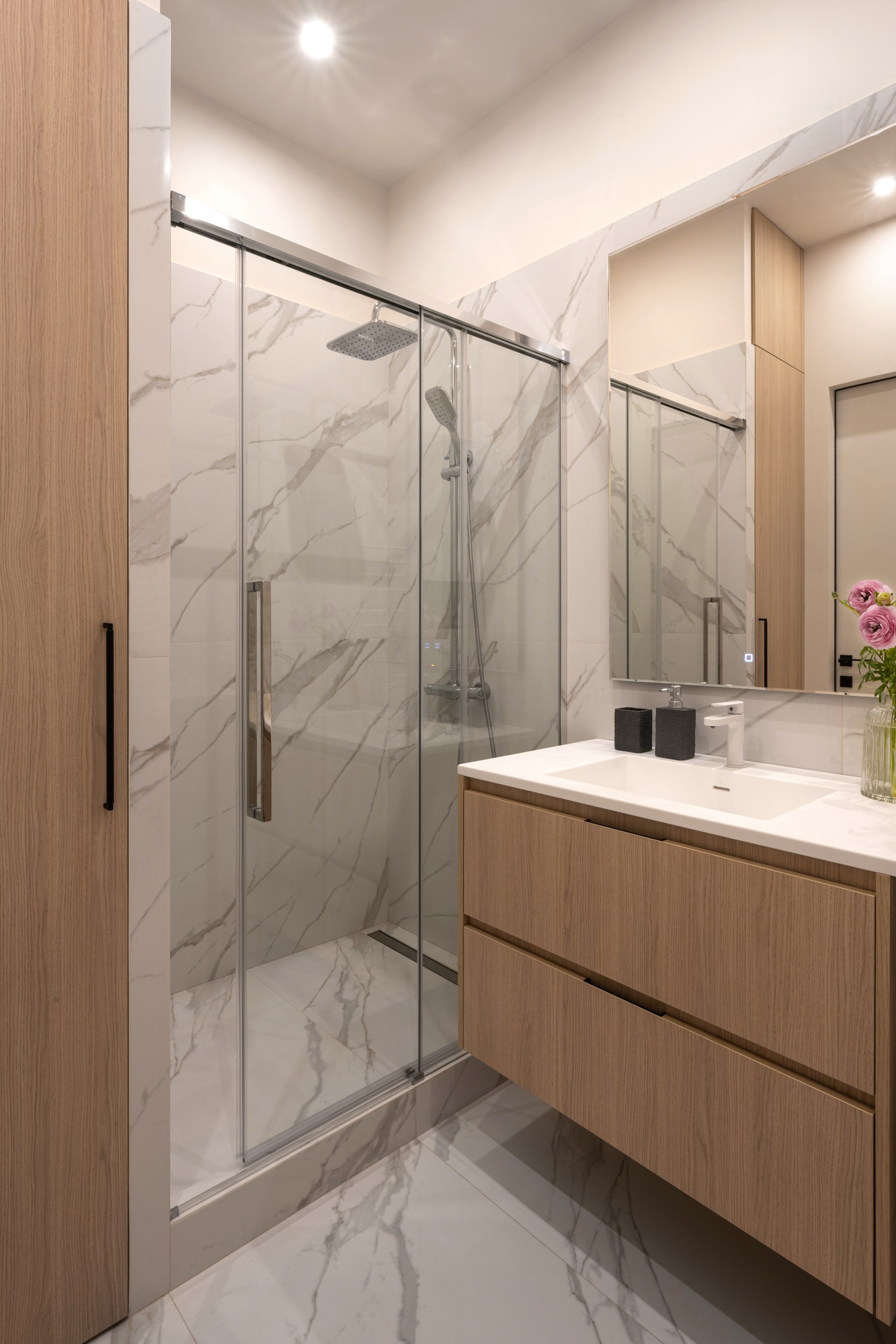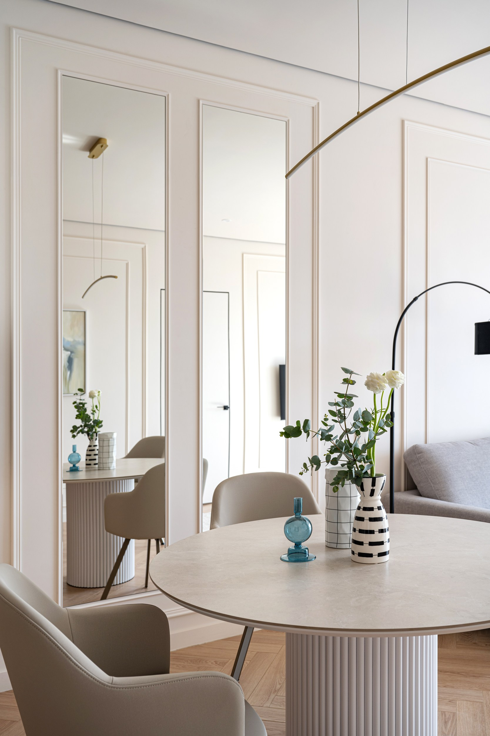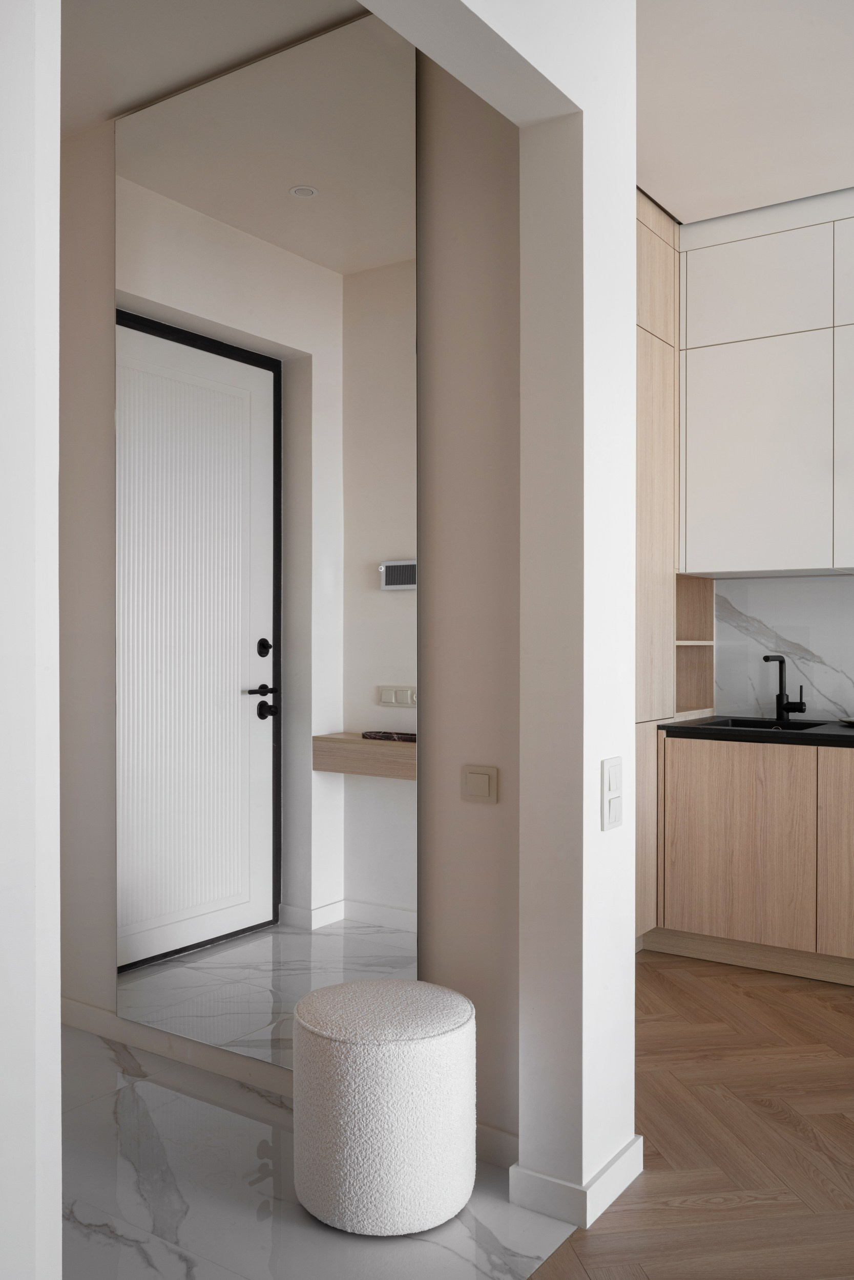 Это квартира под сдачу в премиальном ЖК. Я внедрила здесь все атрибуты, которые ценятся клиентами в данном сегменте: нейтральные цвета с интересными акцентами, отсутствие ярко-выраженных трендов, функциональная планировка, спальня обязательно с гардеробной, просторная кухня-гостиная, много мест для хранения. Ну, и, конечно, шикарный вид на МГУ, хотя это и не моя заслуга))). Квартира быстро и очень дорого сдалась.