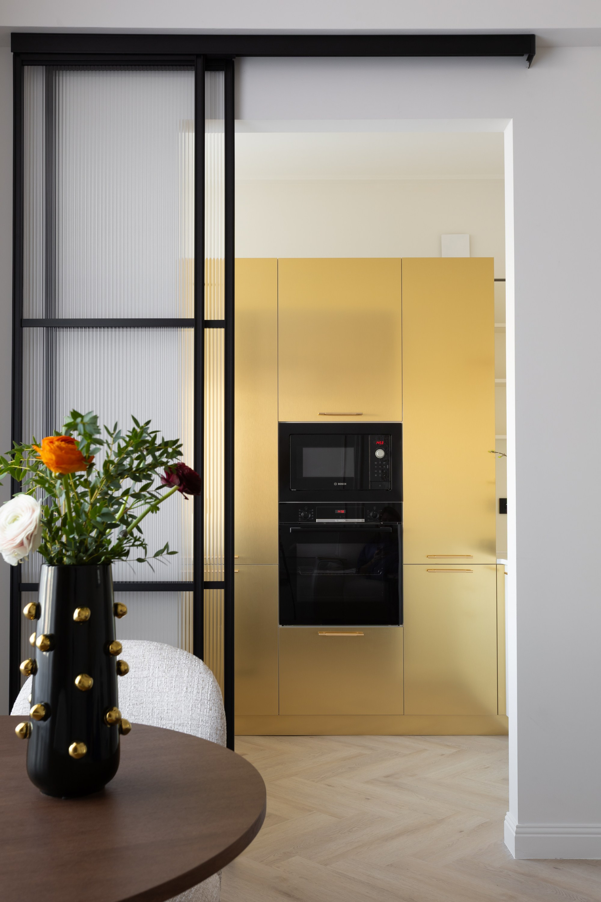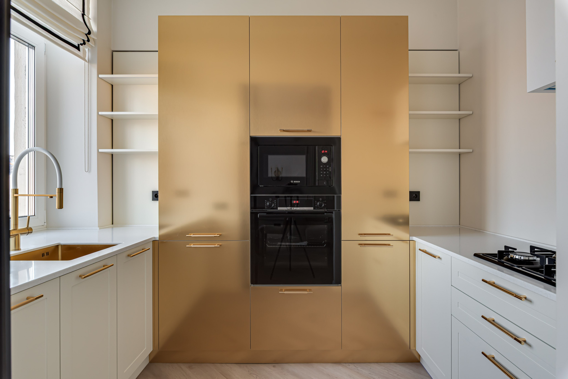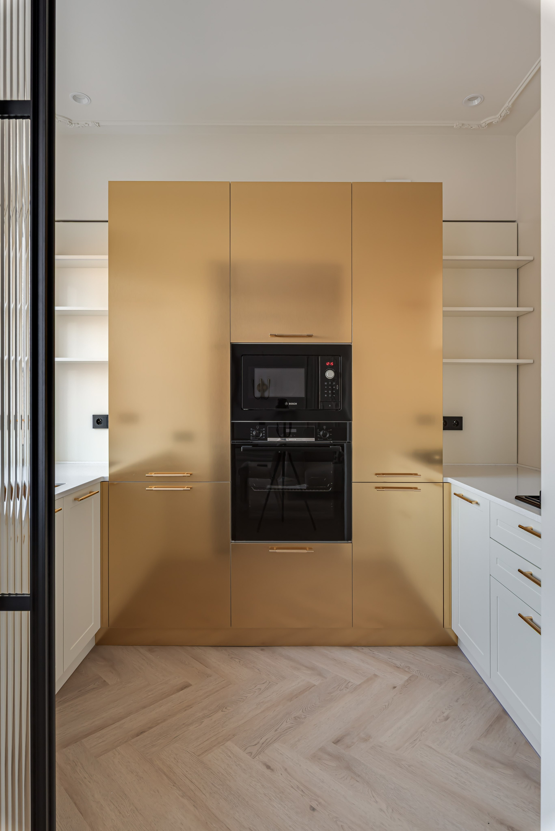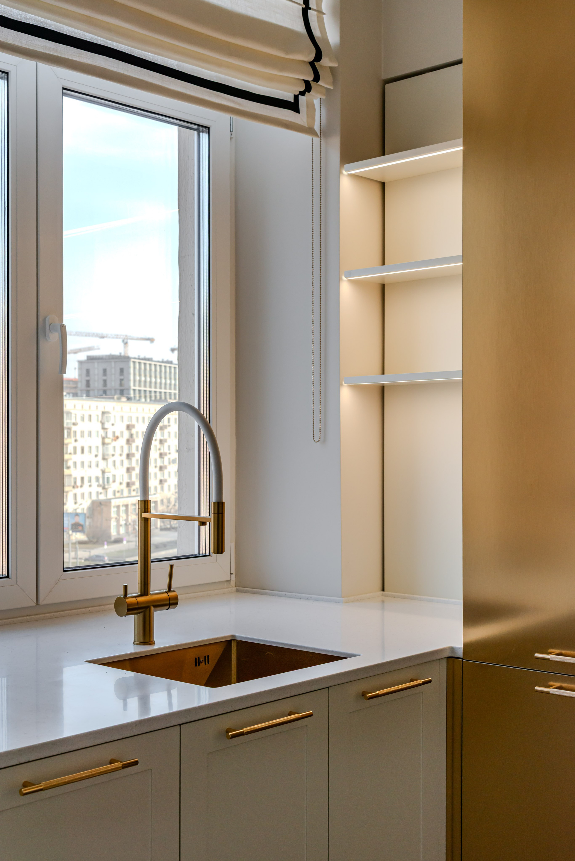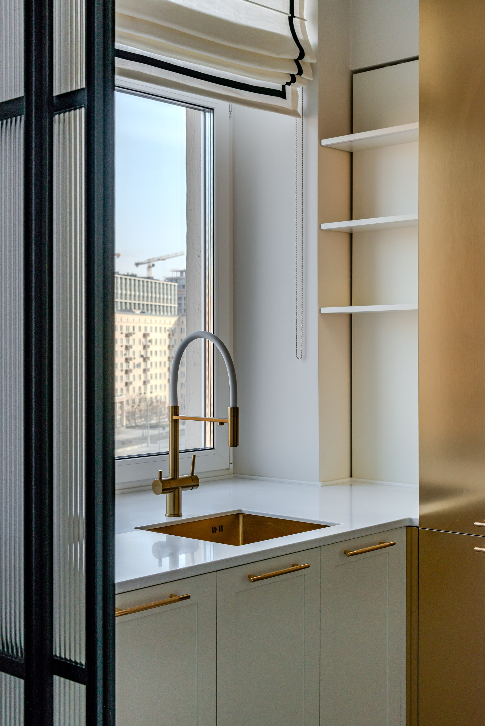 Этот дизайн квартиры был создан мной для вторички на Кутузе по просьбе флипперской компании. Это дом с богатой историей и красивыми видами. Важно было не уронить статус и при этом уложиться в нужный бюджет. И, конечно, придумать какую-то изюминку — ею стала золотая кухня необычной планировки с раковиной у окна, аля «мечта хозяйки». Фото ДО можно посмотреть в конце галереи.