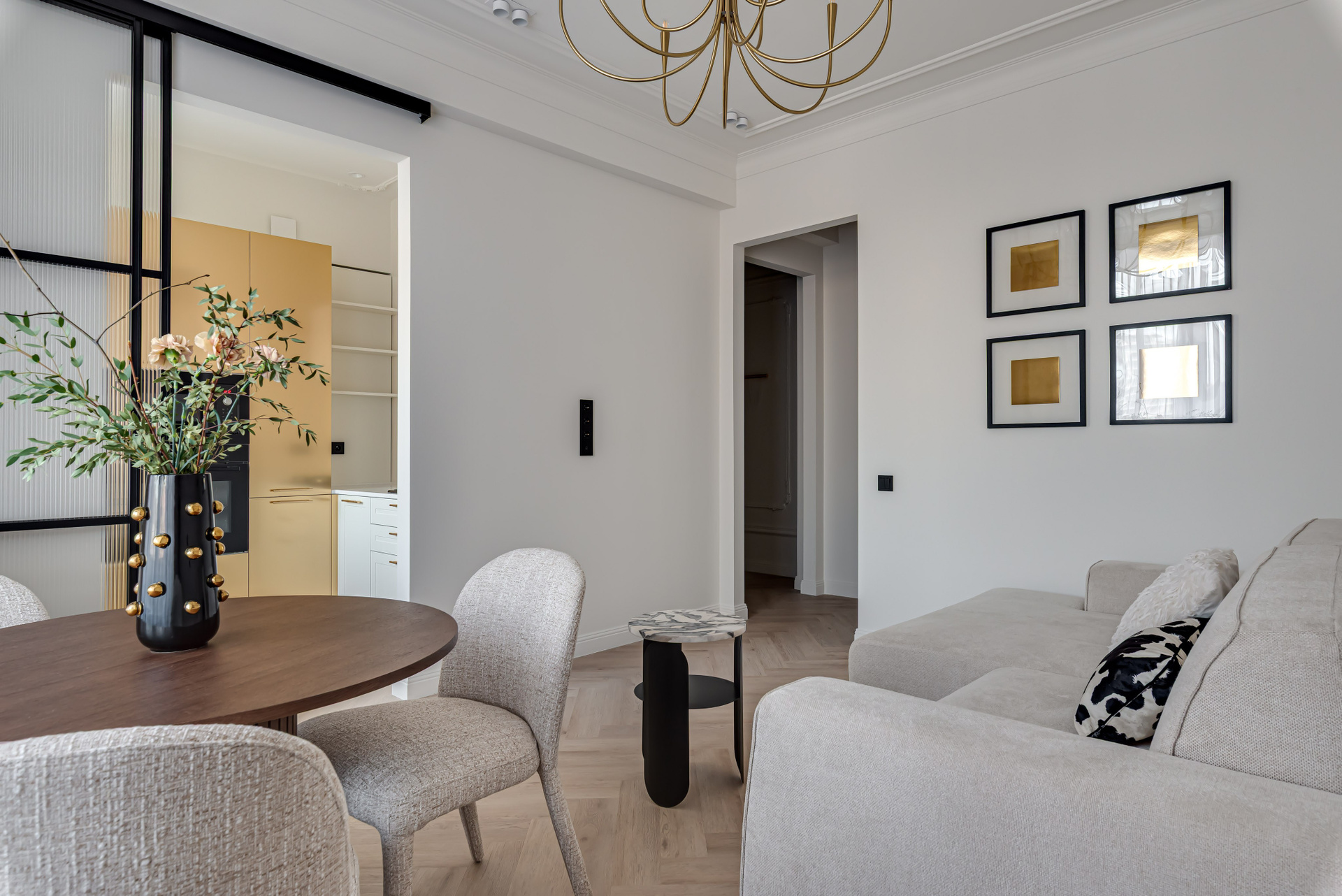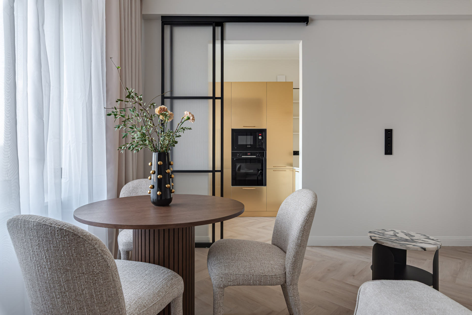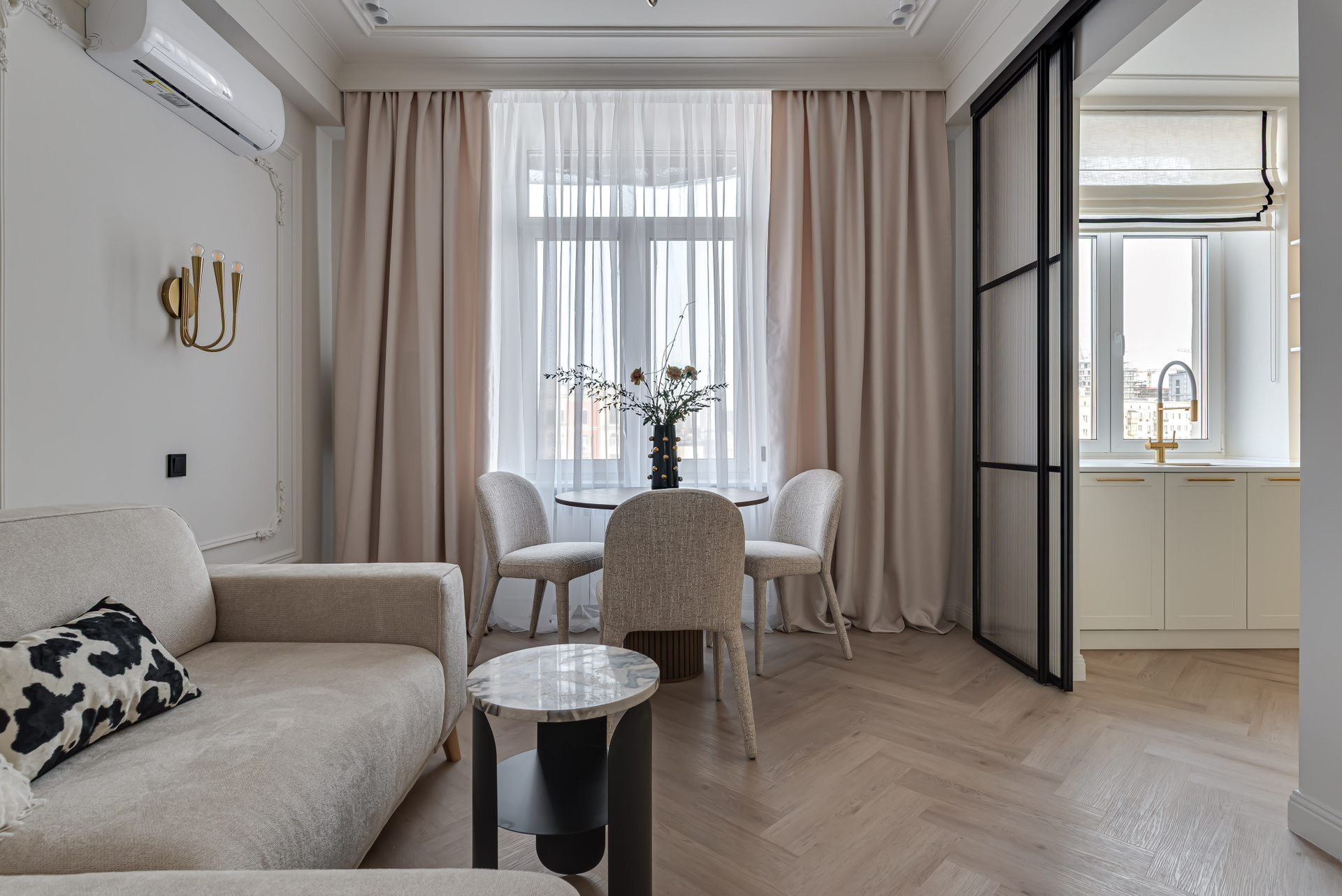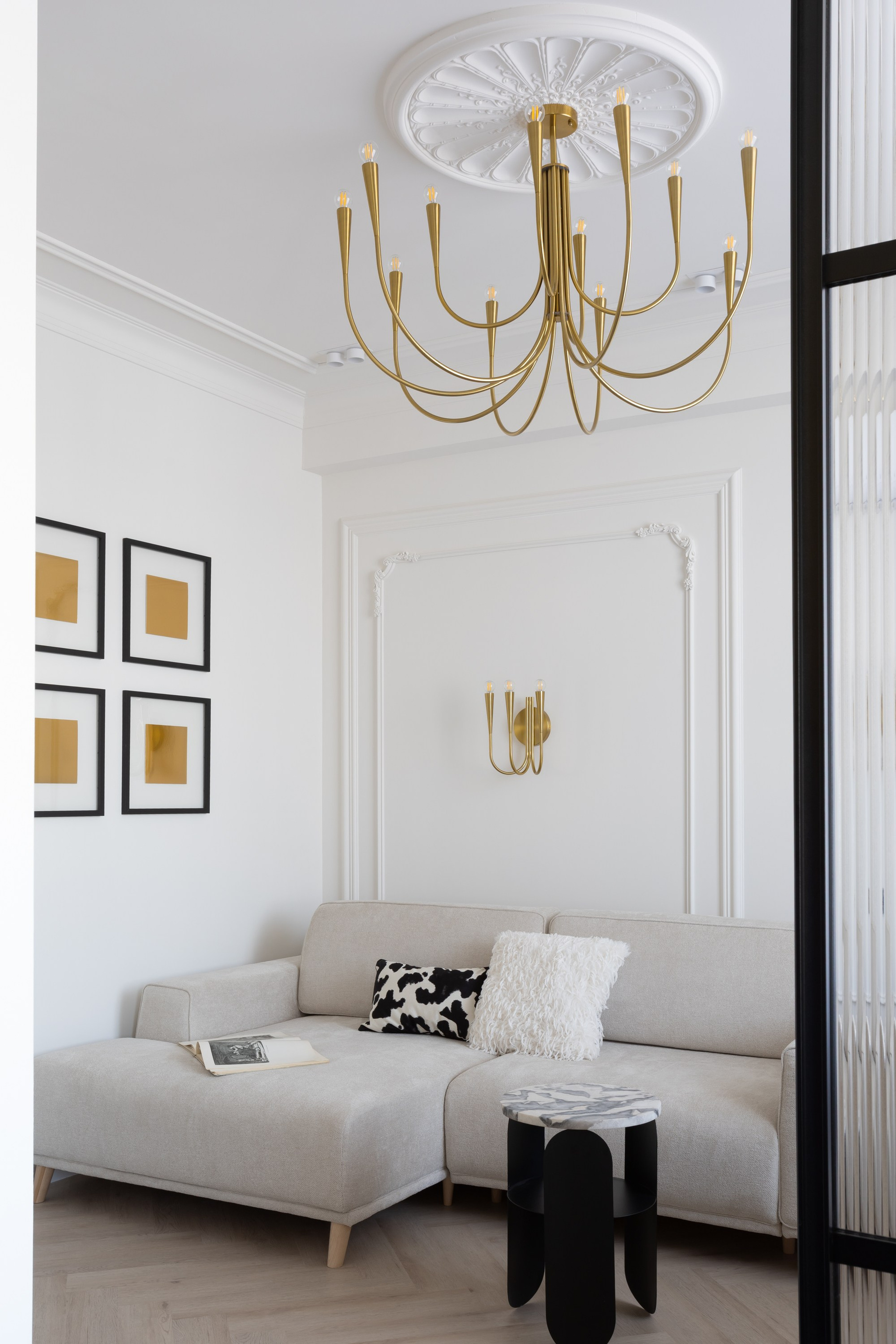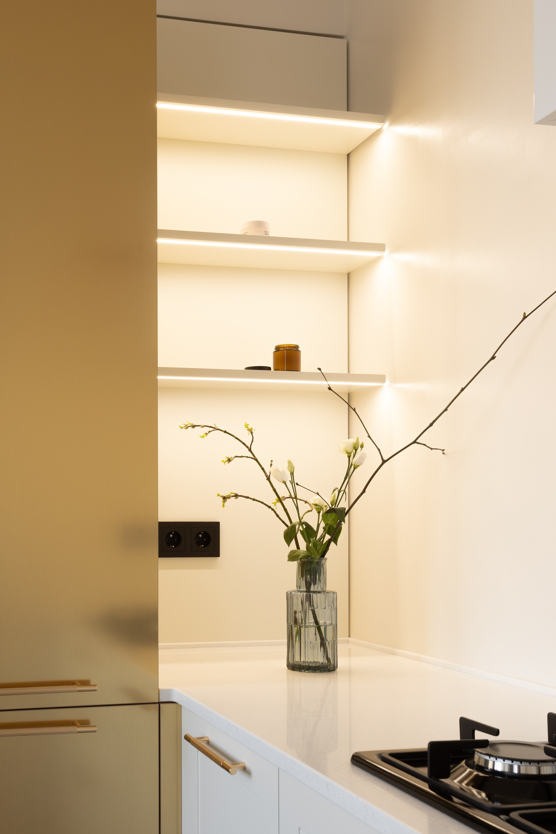 Этот дизайн квартиры был создан мной для вторички на Кутузе по просьбе флипперской компании. Это дом с богатой историей и красивыми видами. Важно было не уронить статус и при этом уложиться в нужный бюджет. И, конечно, придумать какую-то изюминку — ею стала золотая кухня необычной планировки с раковиной у окна, аля «мечта хозяйки». Фото ДО можно посмотреть в конце галереи.