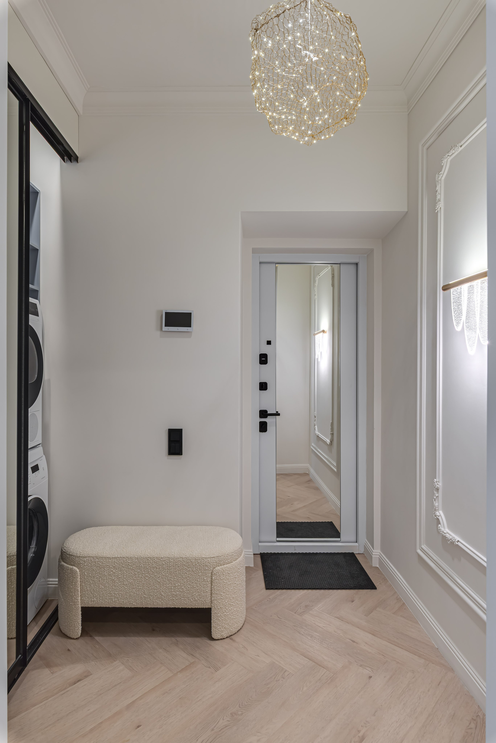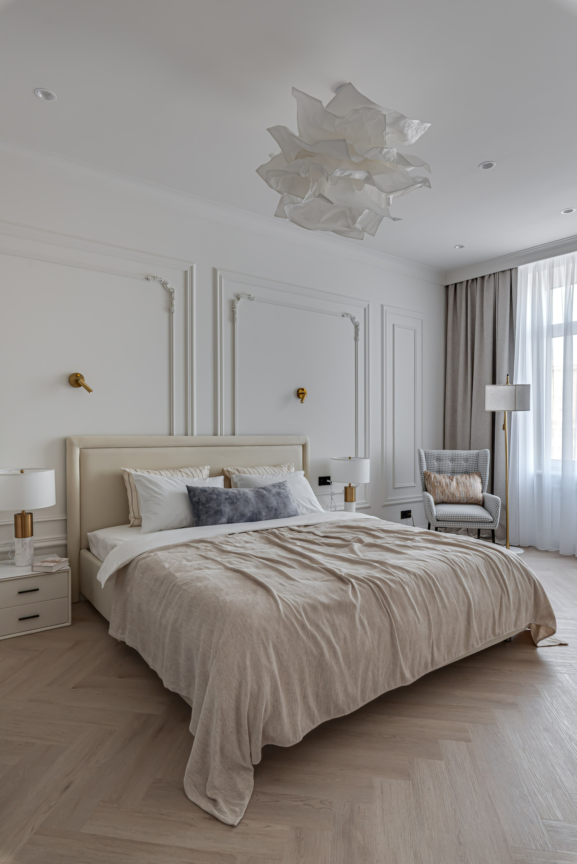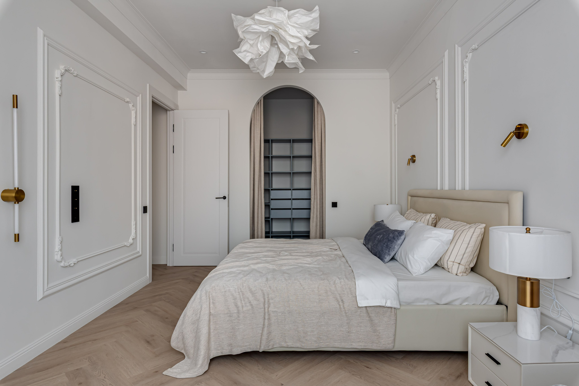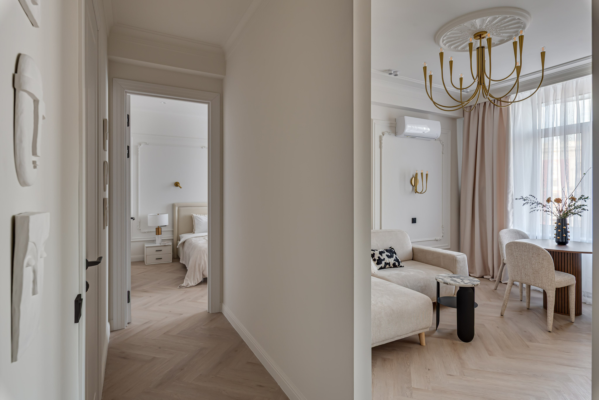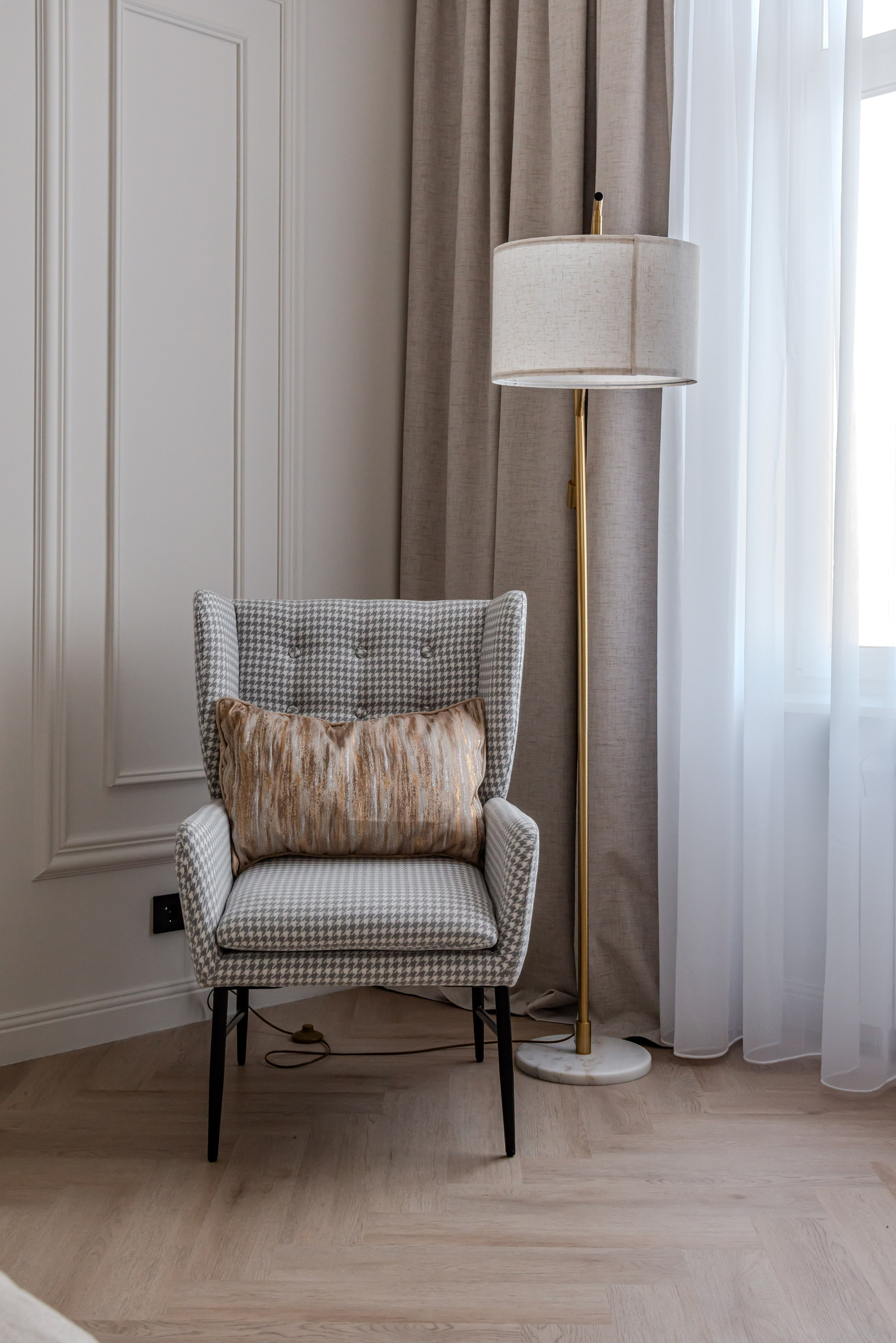 Этот дизайн квартиры был создан мной для вторички на Кутузе по просьбе флипперской компании. Это дом с богатой историей и красивыми видами. Важно было не уронить статус и при этом уложиться в нужный бюджет. И, конечно, придумать какую-то изюминку — ею стала золотая кухня необычной планировки с раковиной у окна, аля «мечта хозяйки». Фото ДО можно посмотреть в конце галереи.