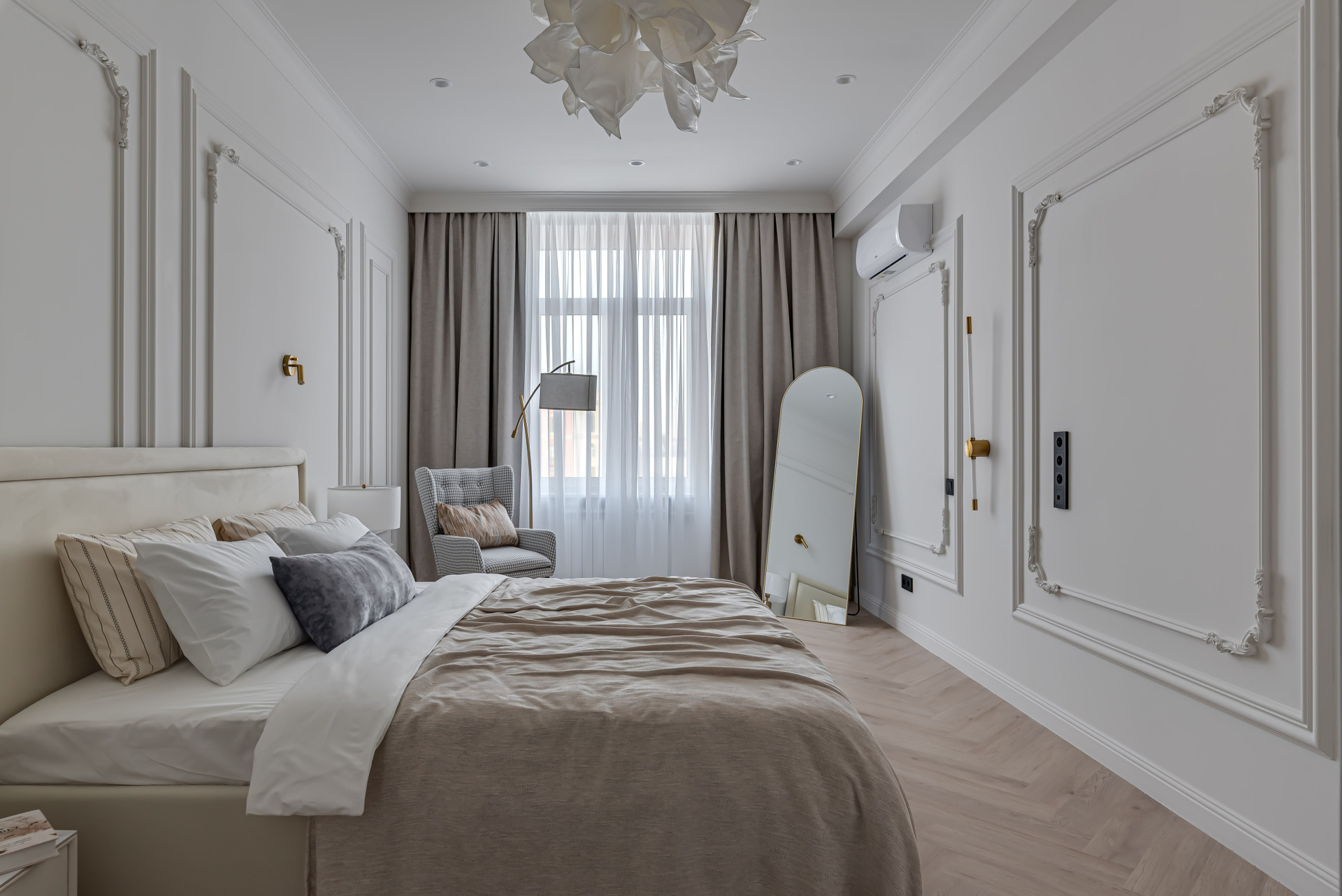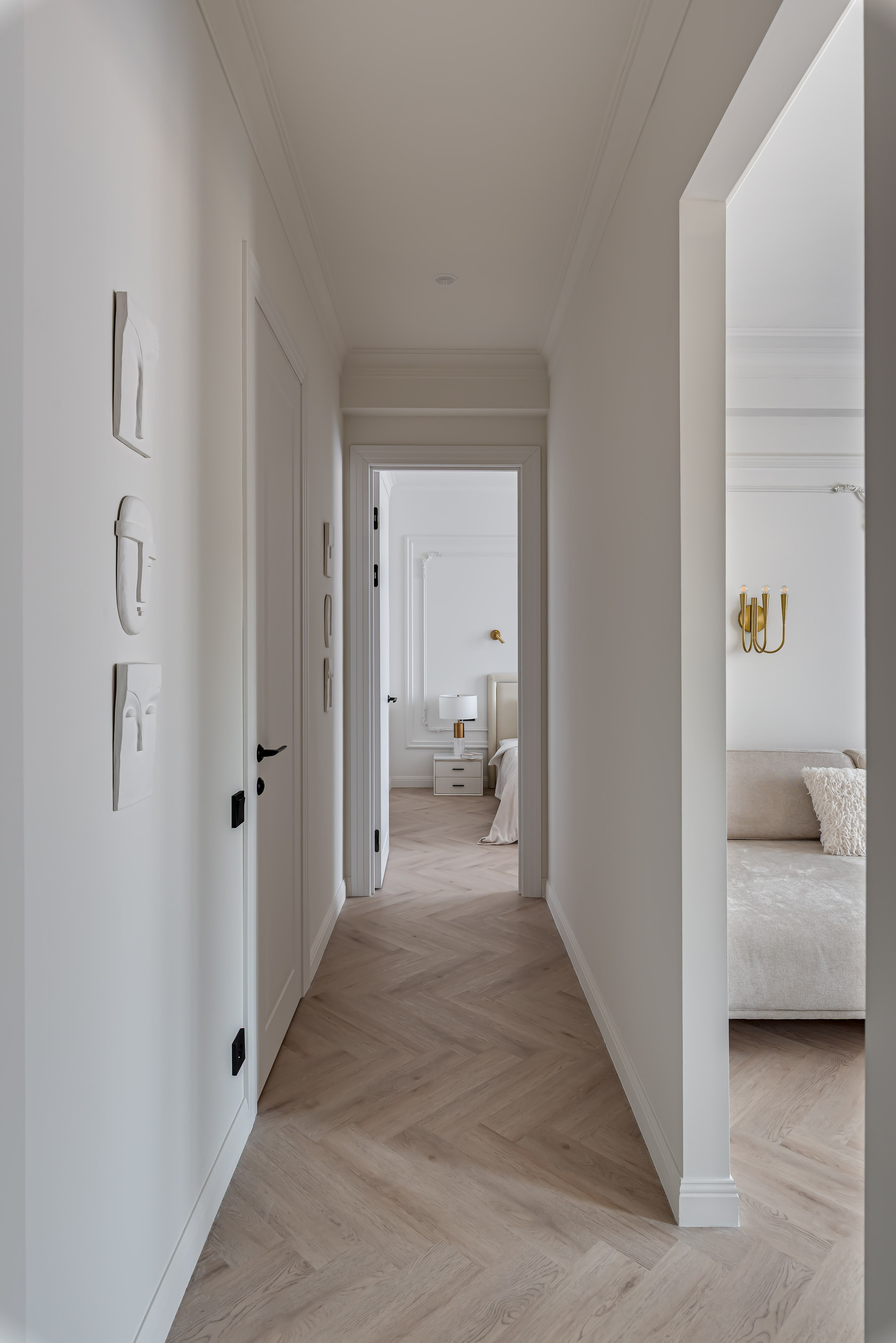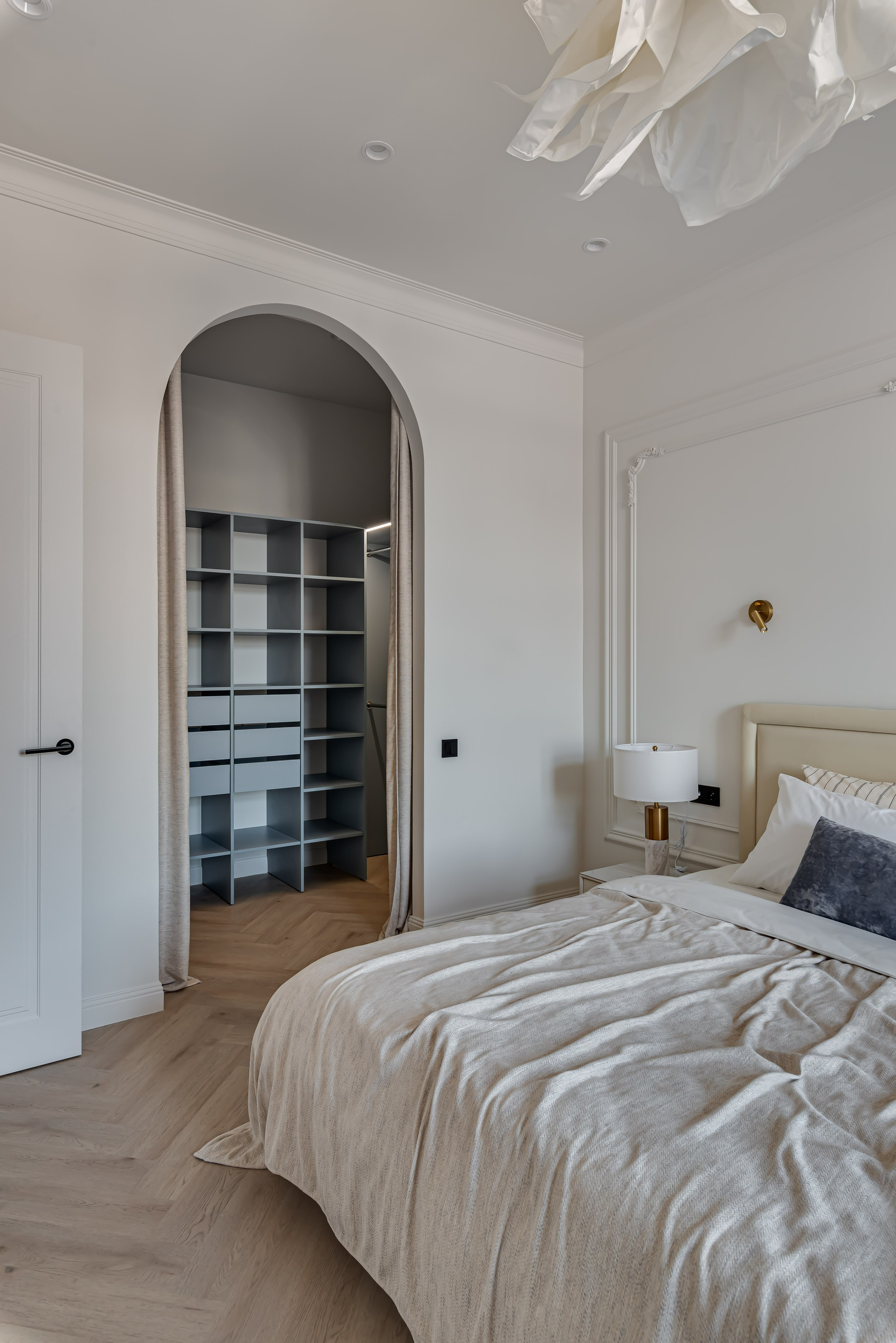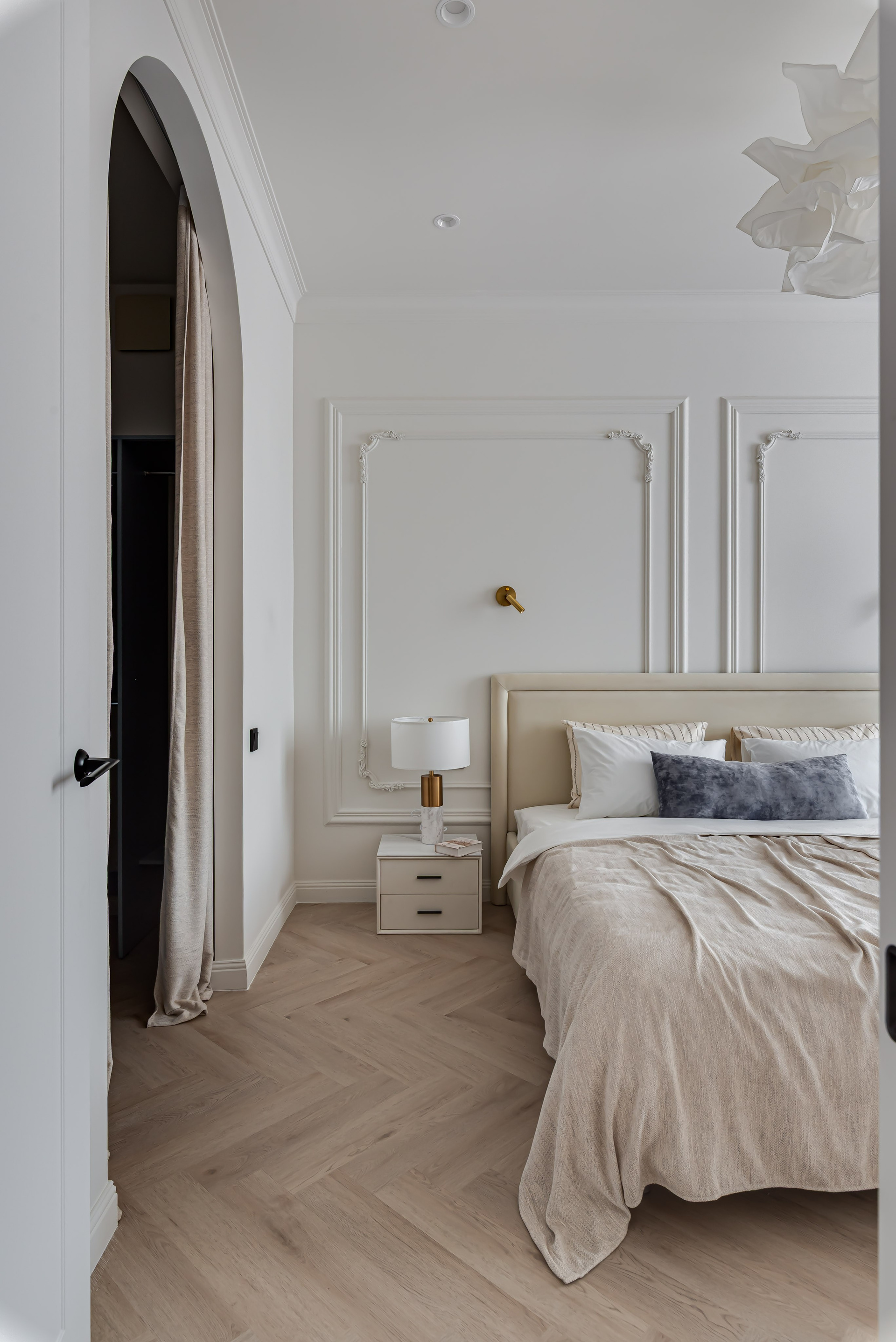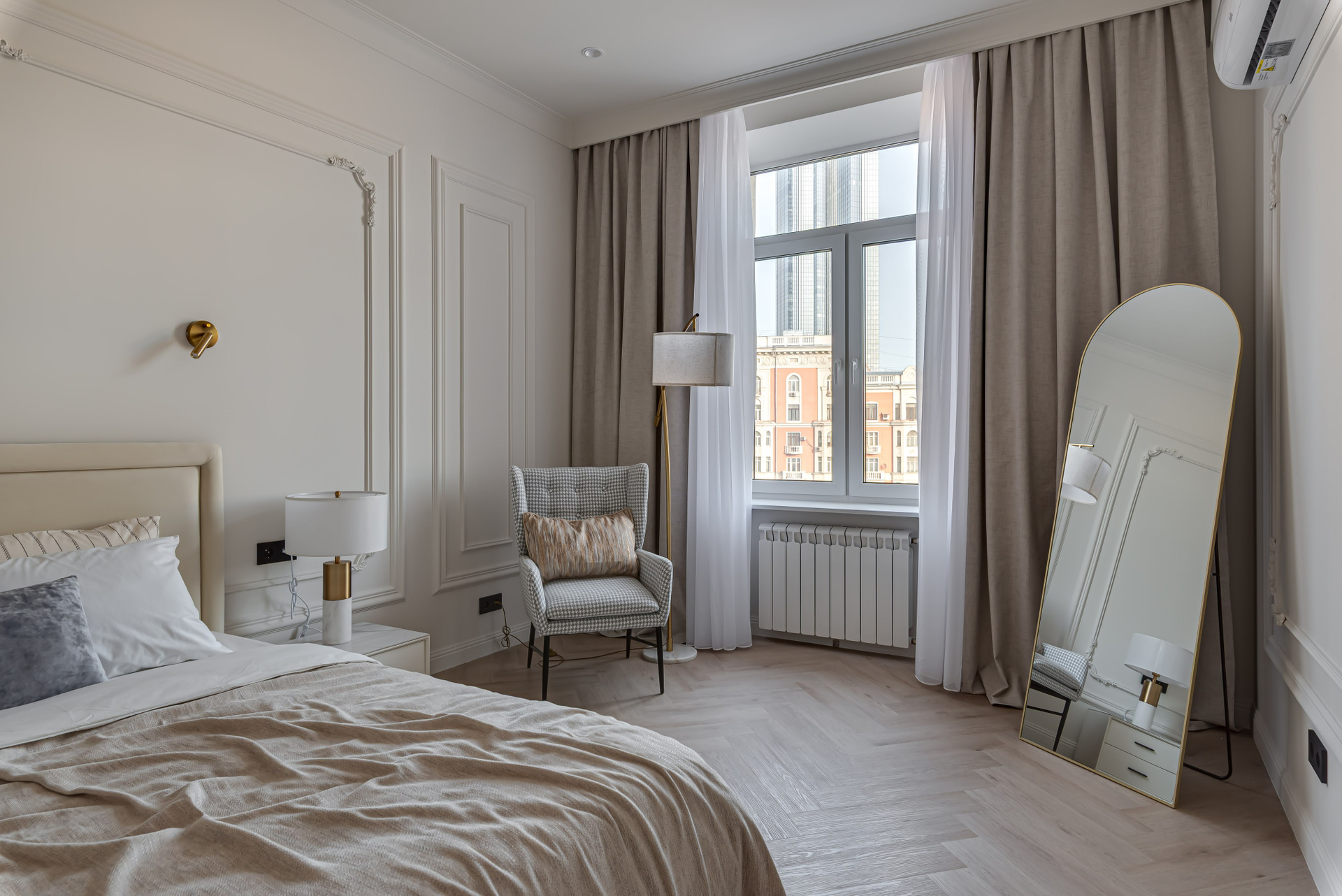 Этот дизайн квартиры был создан мной для вторички на Кутузе по просьбе флипперской компании. Это дом с богатой историей и красивыми видами. Важно было не уронить статус и при этом уложиться в нужный бюджет. И, конечно, придумать какую-то изюминку — ею стала золотая кухня необычной планировки с раковиной у окна, аля «мечта хозяйки». Фото ДО можно посмотреть в конце галереи.