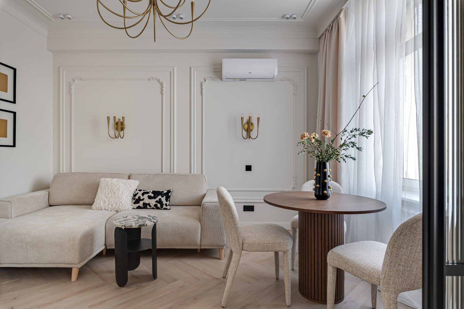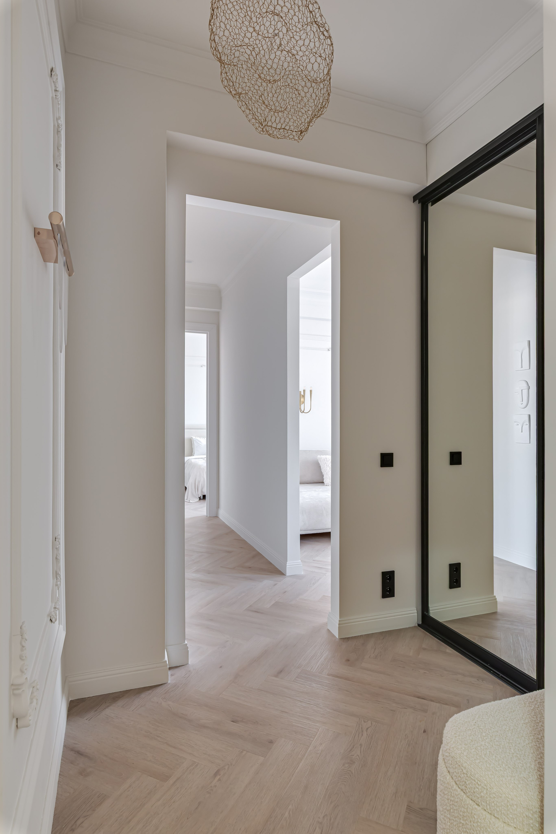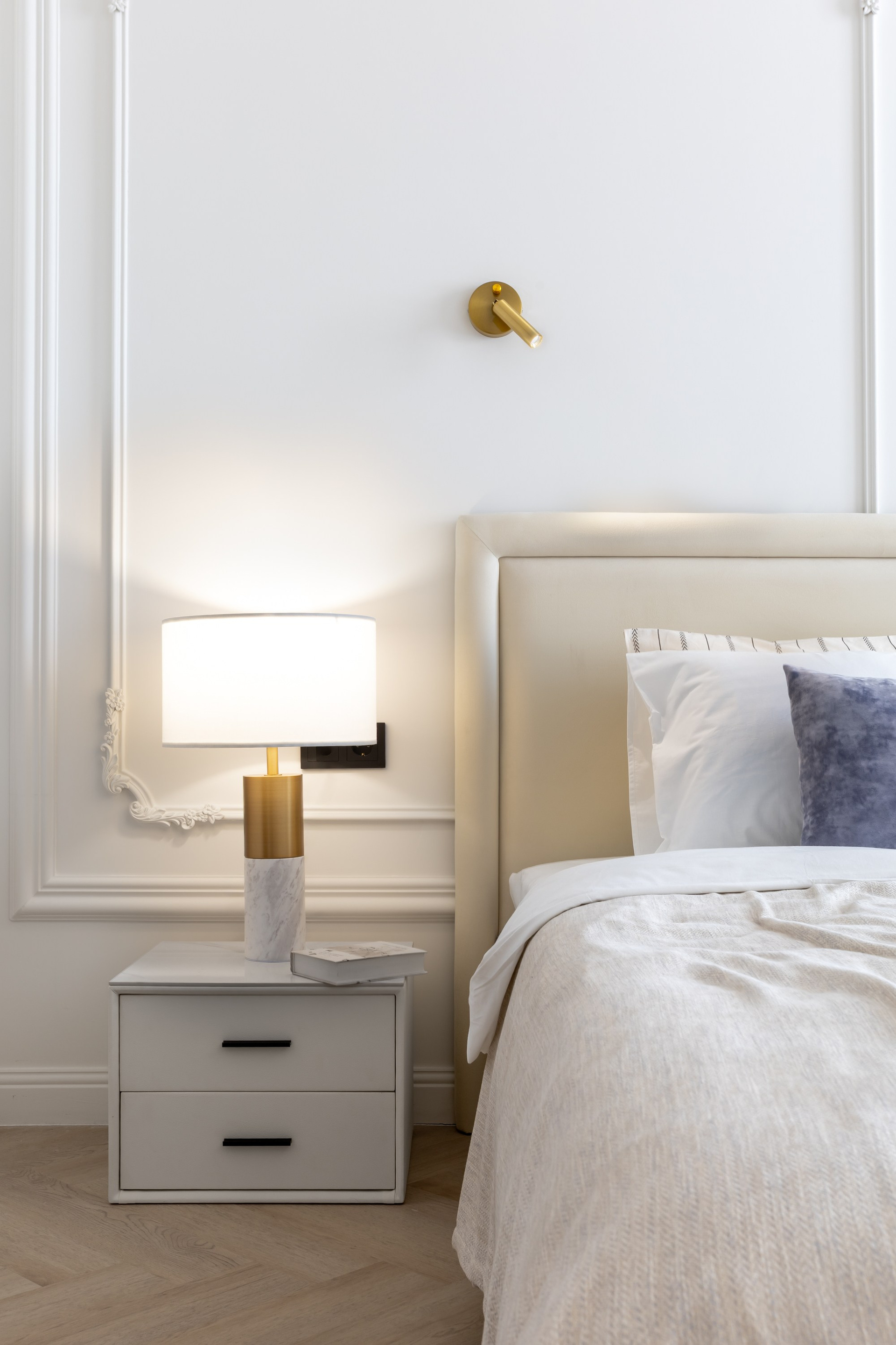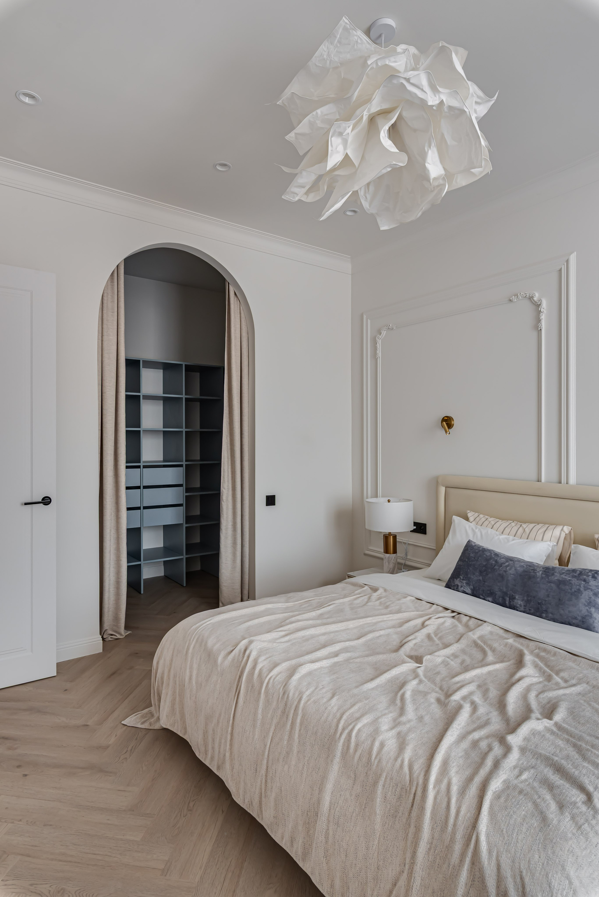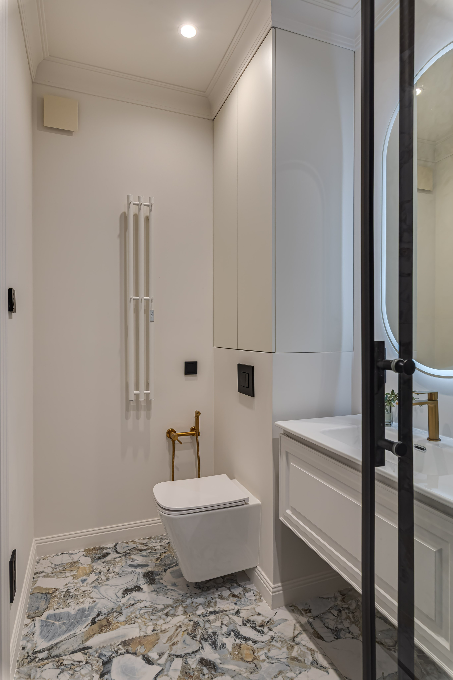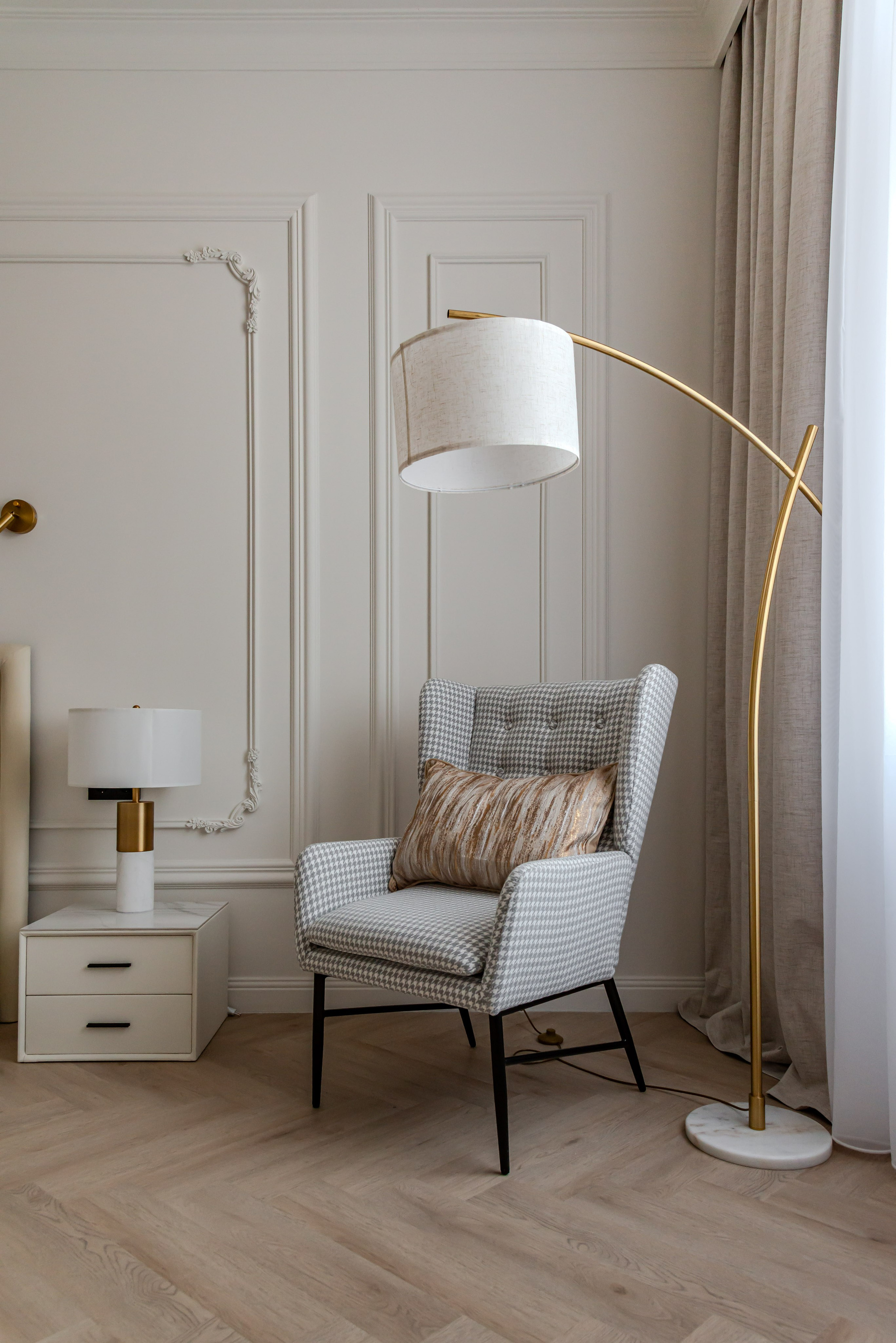 Этот дизайн квартиры был создан мной для вторички на Кутузе по просьбе флипперской компании. Это дом с богатой историей и красивыми видами. Важно было не уронить статус и при этом уложиться в нужный бюджет. И, конечно, придумать какую-то изюминку — ею стала золотая кухня необычной планировки с раковиной у окна, аля «мечта хозяйки». Фото ДО можно посмотреть в конце галереи.