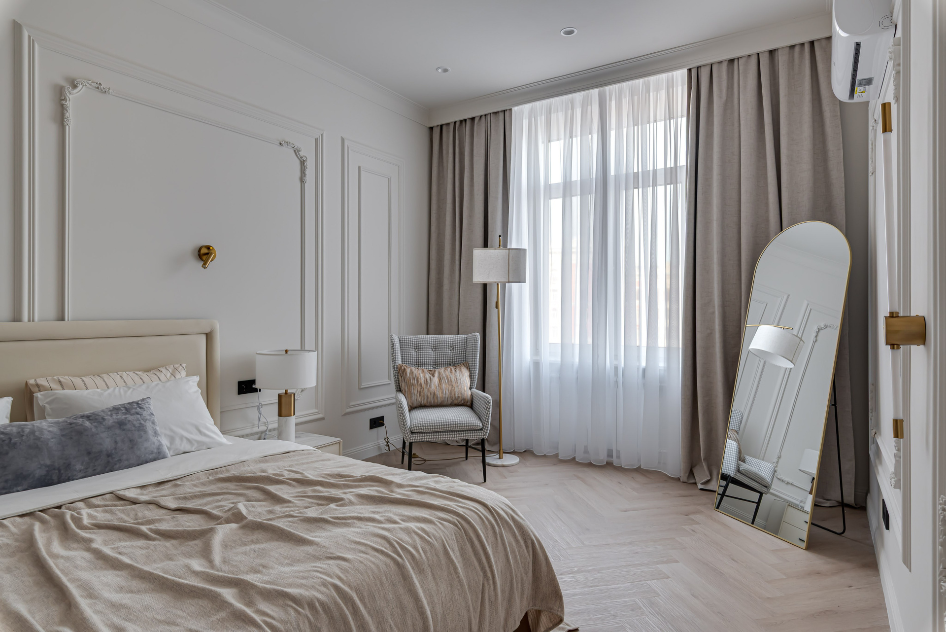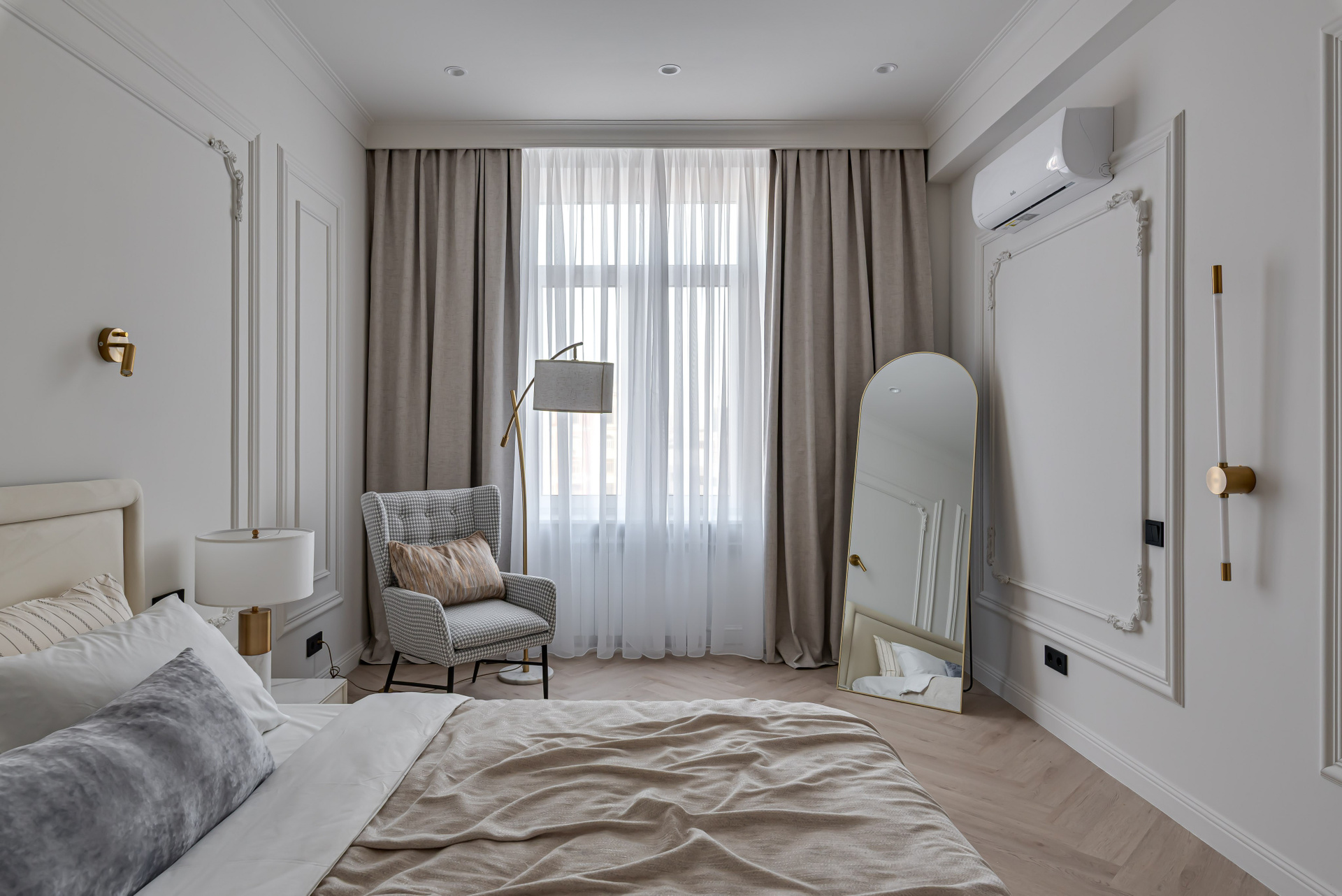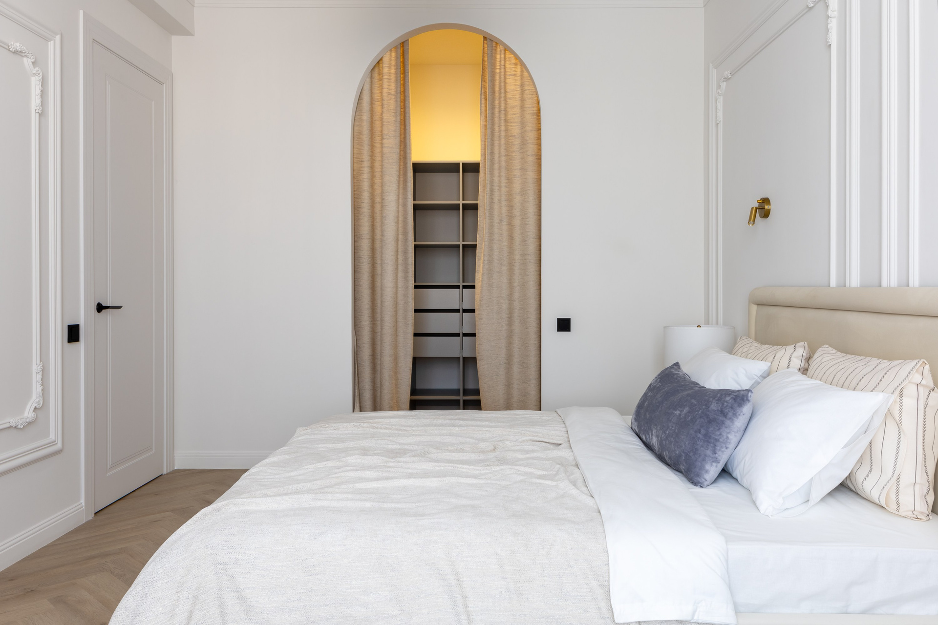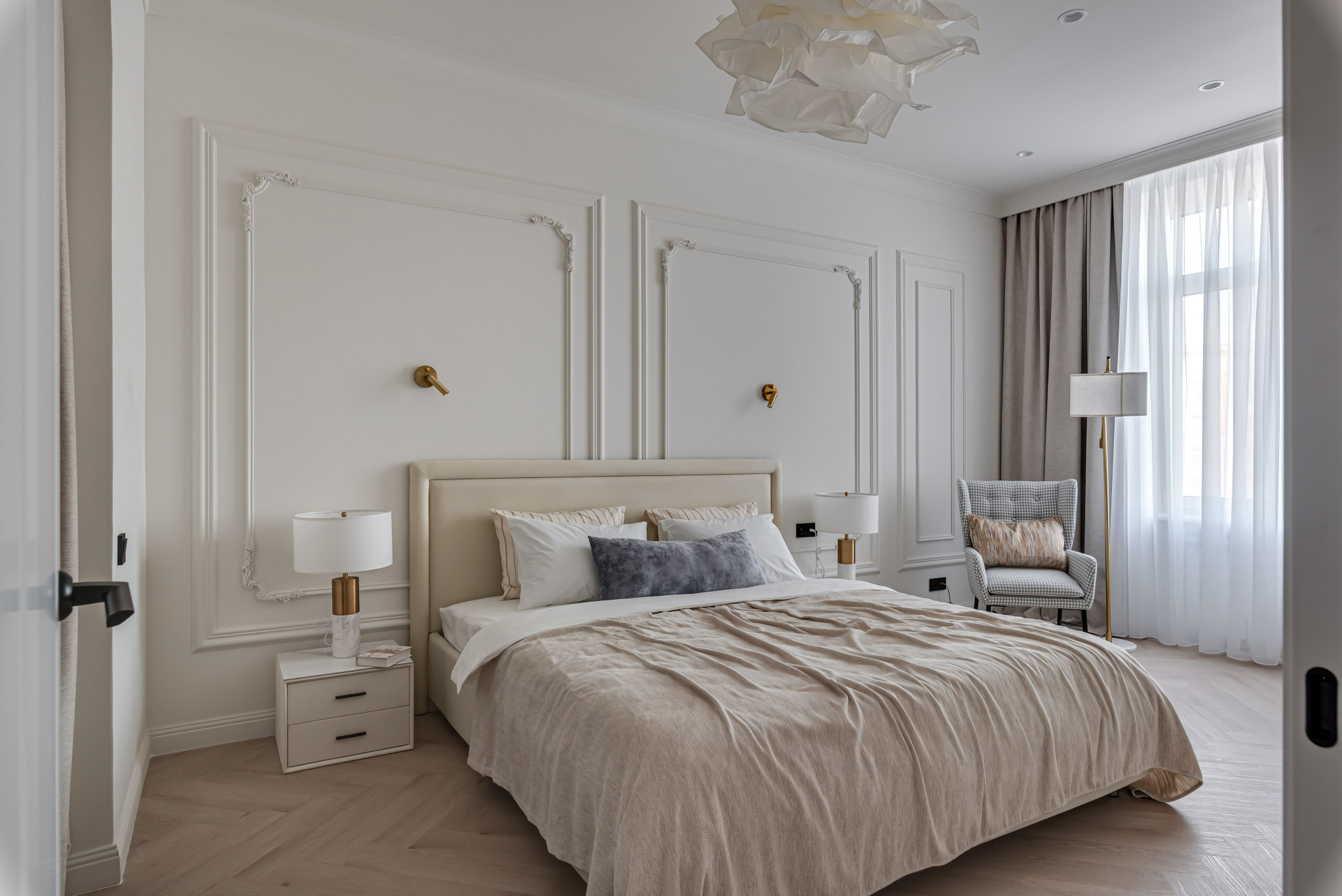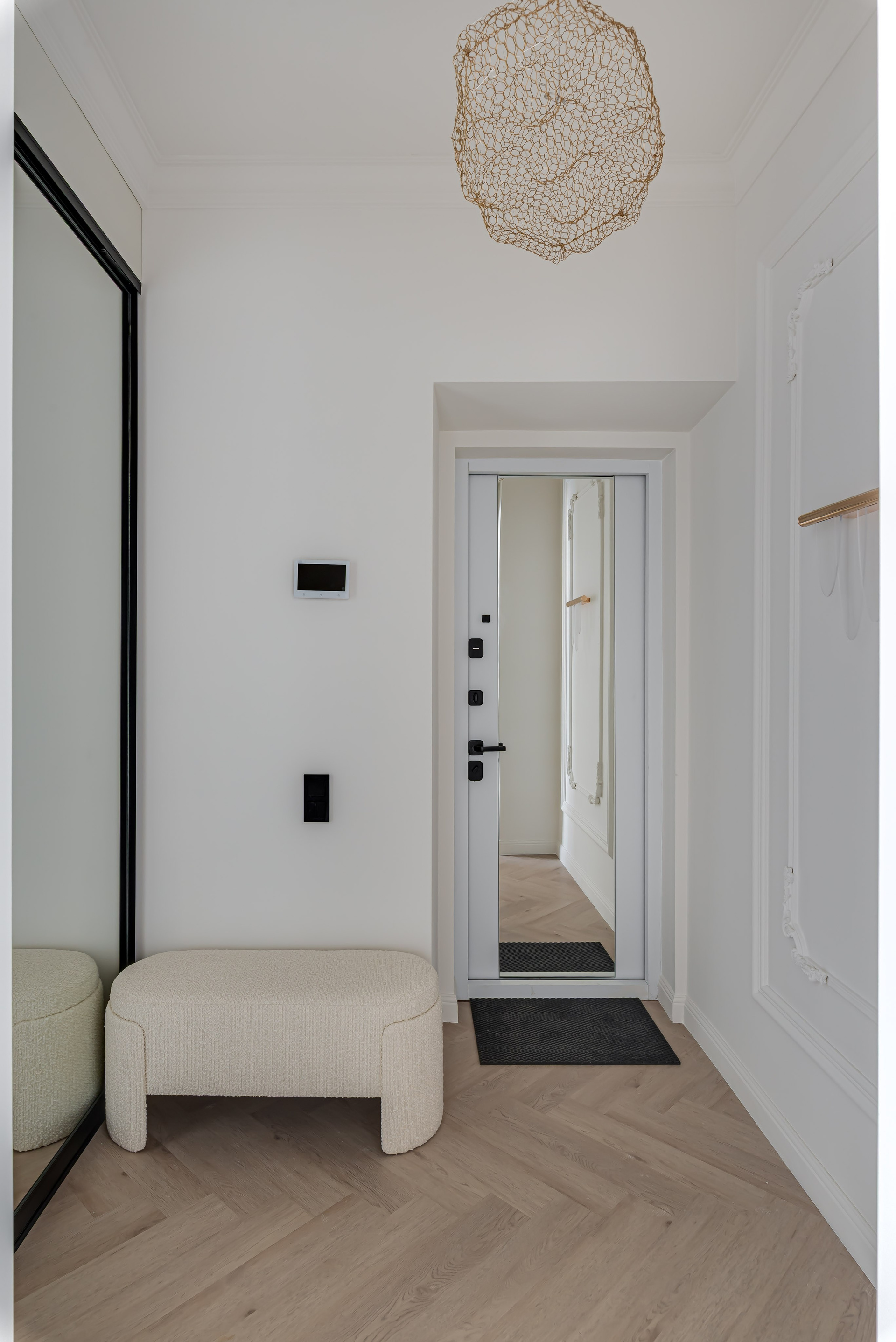 Этот дизайн квартиры был создан мной для вторички на Кутузе по просьбе флипперской компании. Это дом с богатой историей и красивыми видами. Важно было не уронить статус и при этом уложиться в нужный бюджет. И, конечно, придумать какую-то изюминку — ею стала золотая кухня необычной планировки с раковиной у окна, аля «мечта хозяйки». Фото ДО можно посмотреть в конце галереи.
