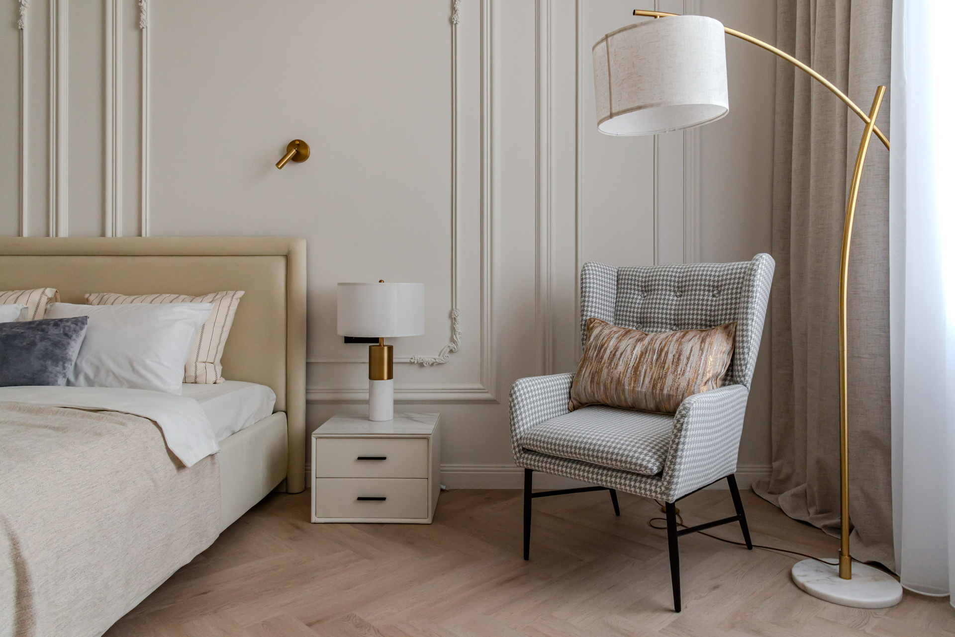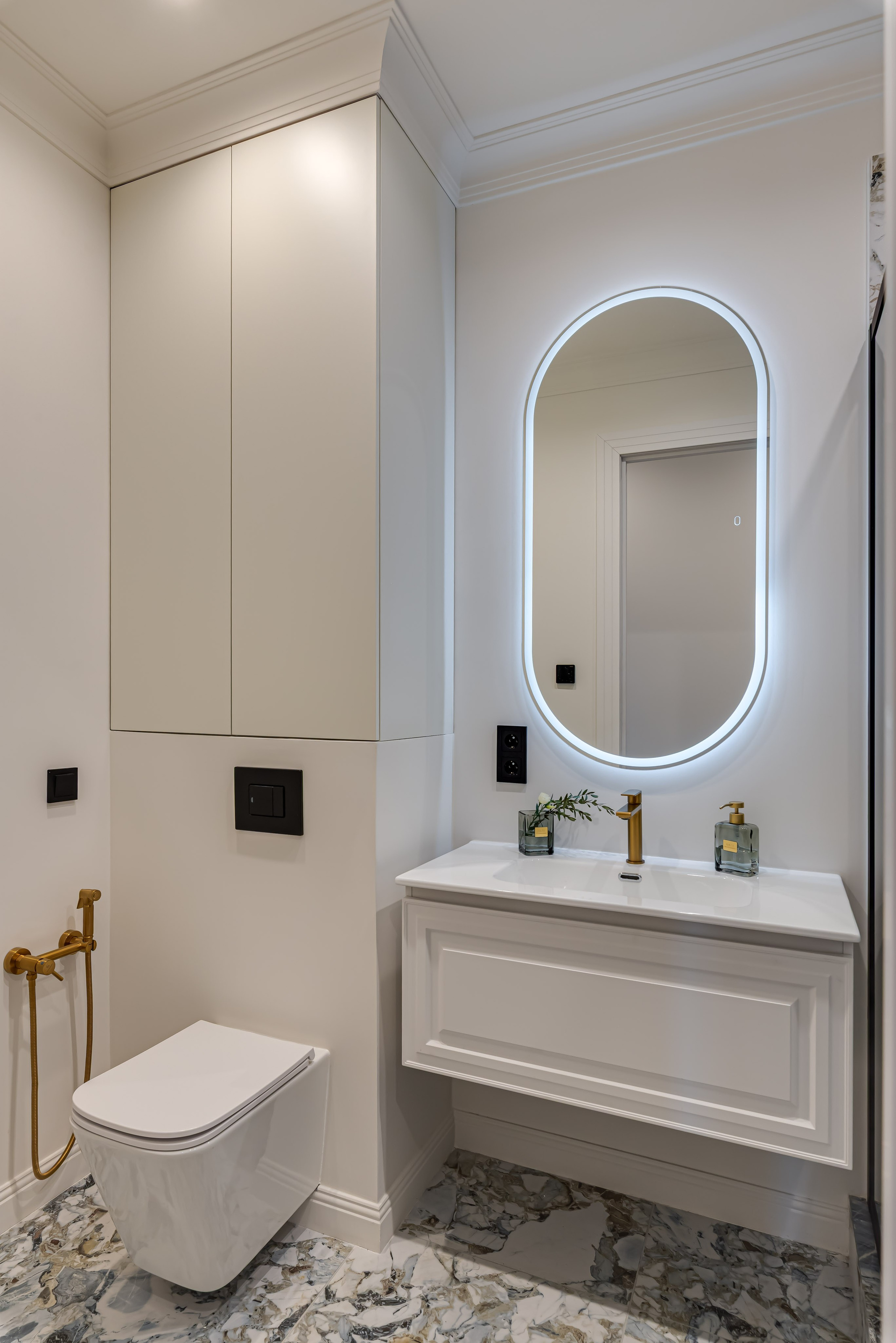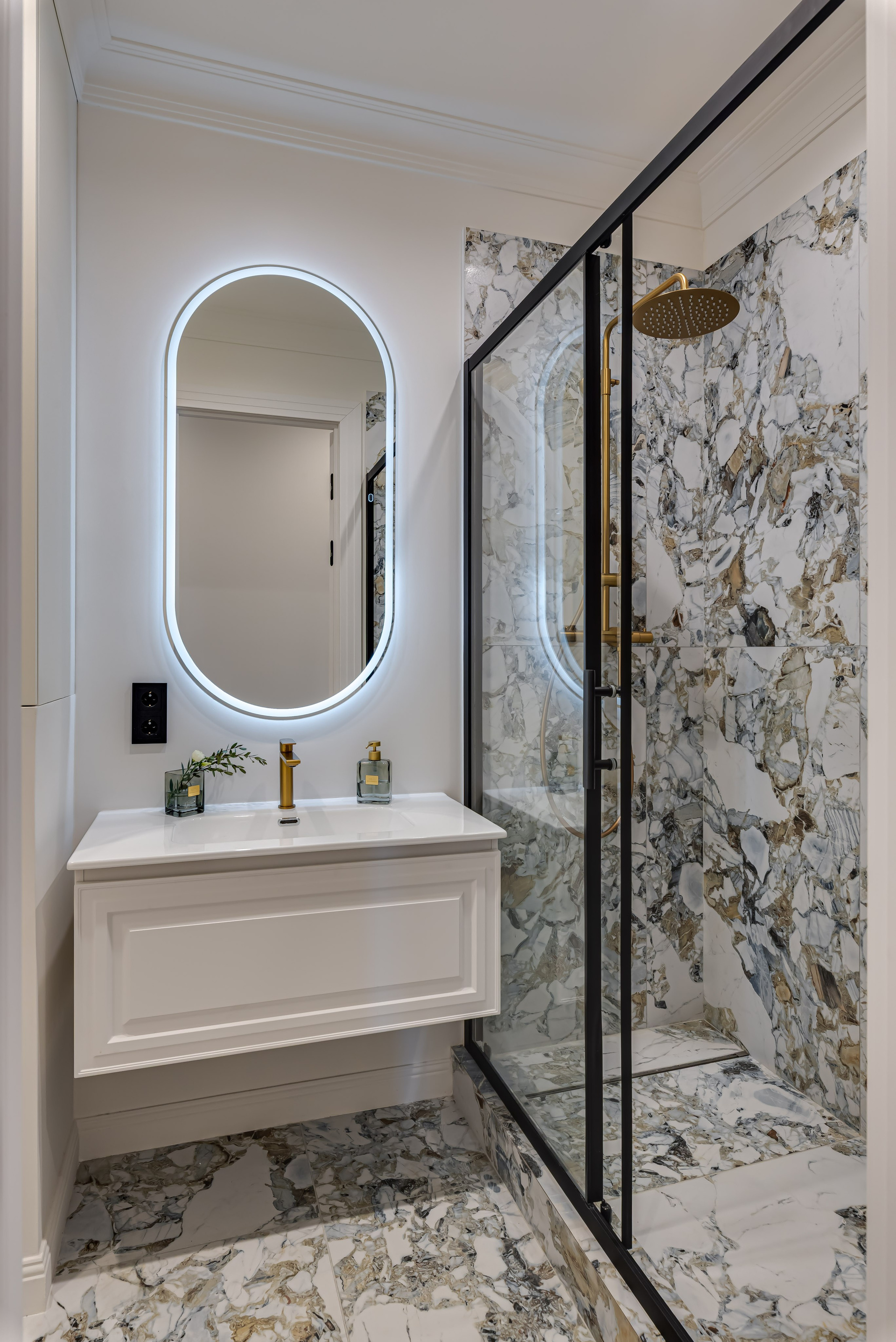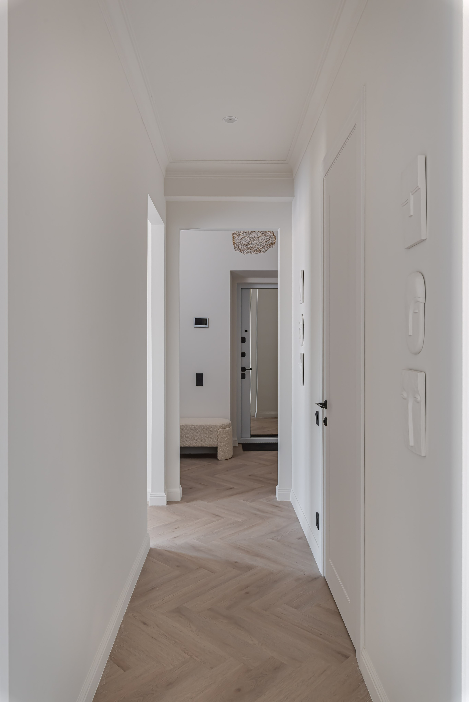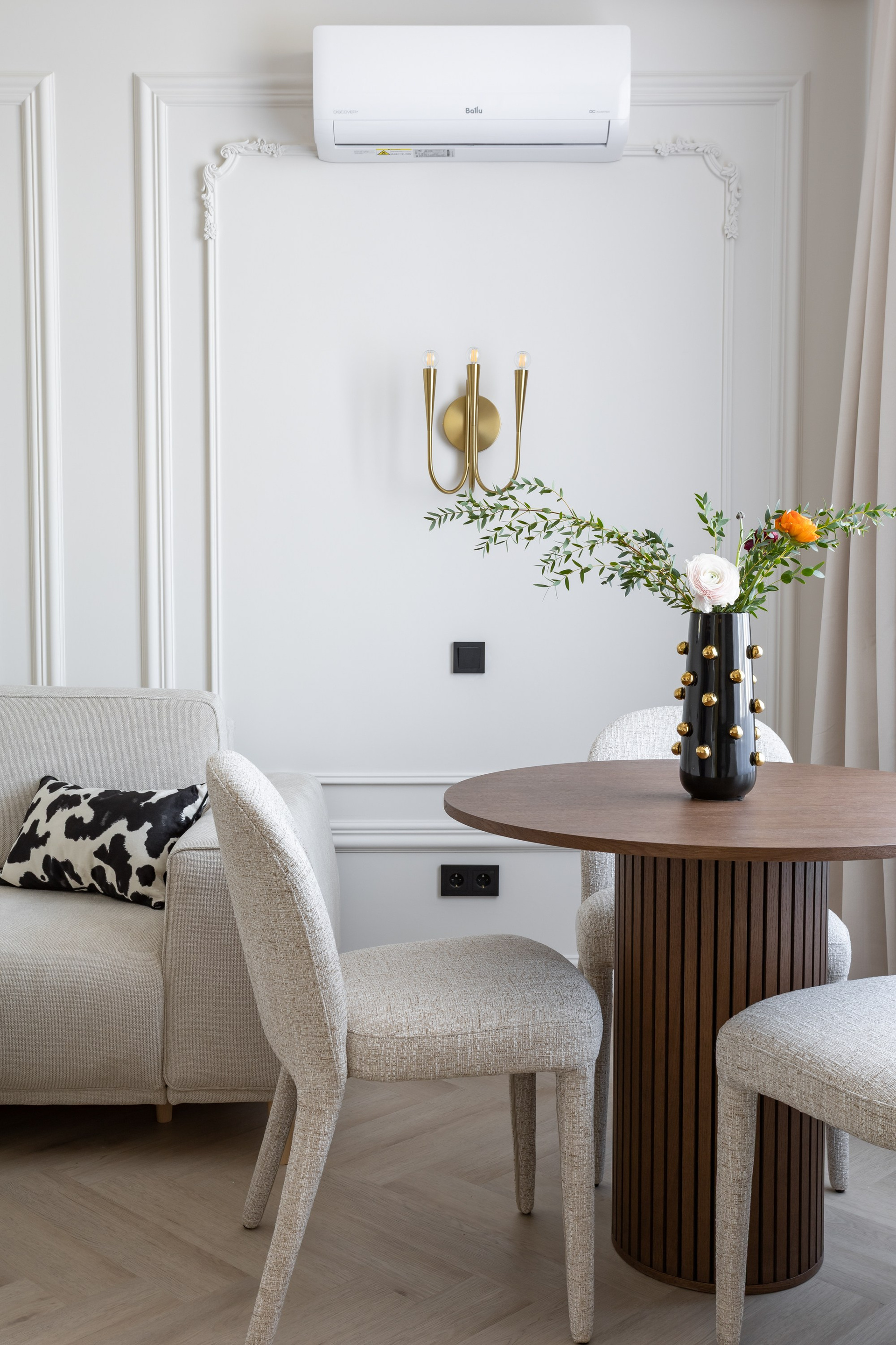 Этот дизайн квартиры был создан мной для вторички на Кутузе по просьбе флипперской компании. Это дом с богатой историей и красивыми видами. Важно было не уронить статус и при этом уложиться в нужный бюджет. И, конечно, придумать какую-то изюминку — ею стала золотая кухня необычной планировки с раковиной у окна, аля «мечта хозяйки». Фото ДО можно посмотреть в конце галереи.