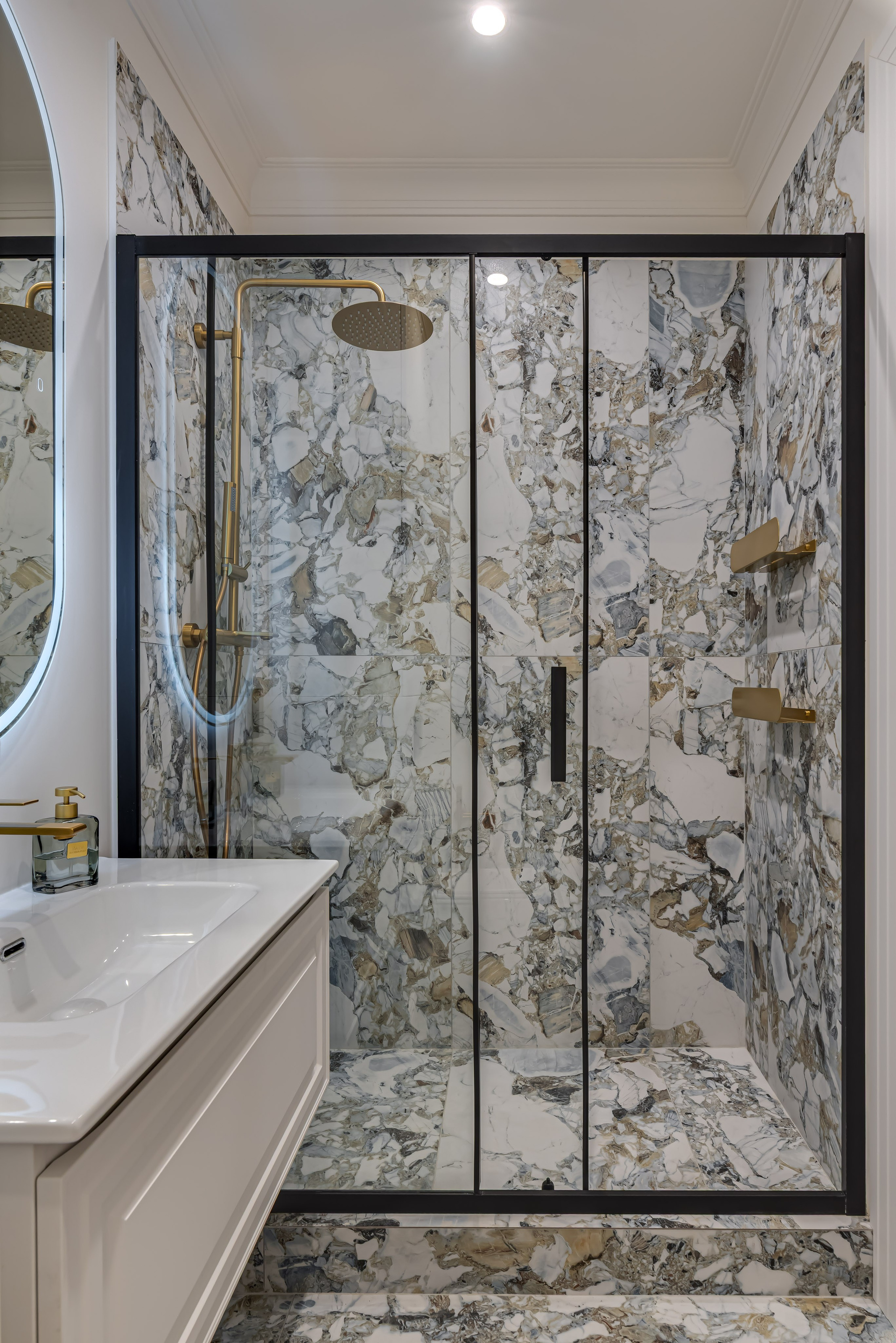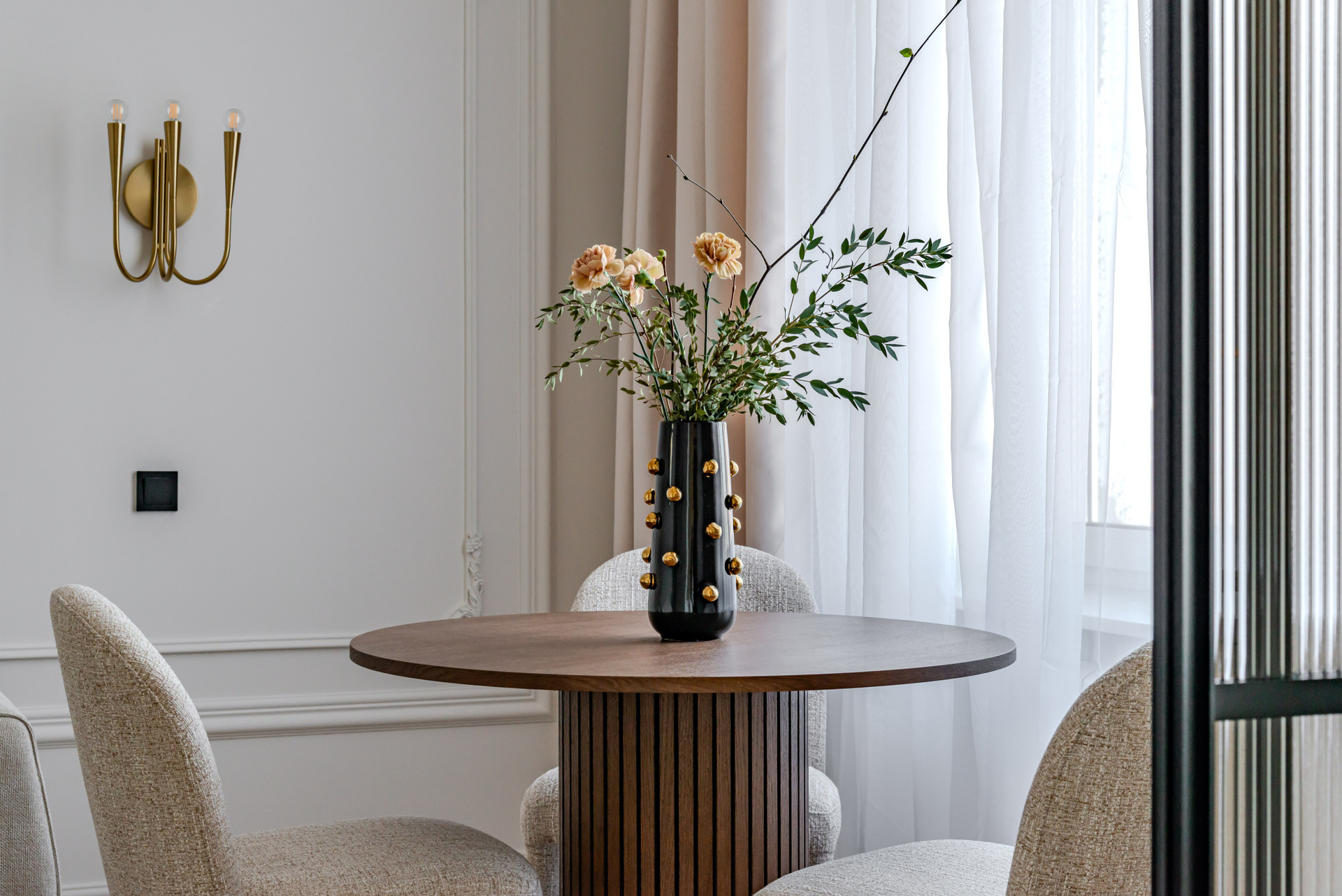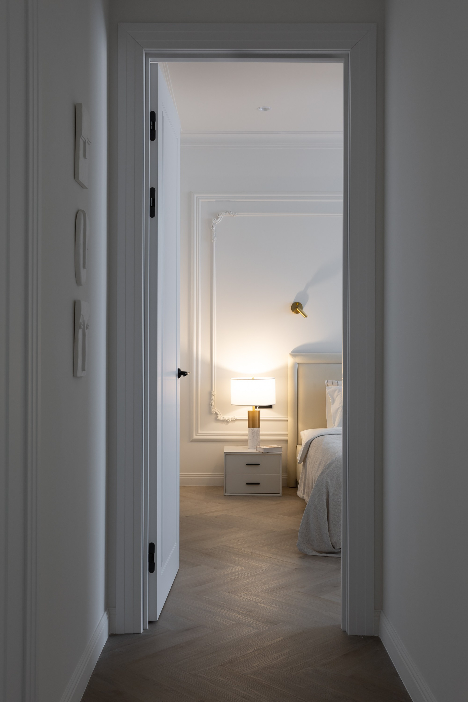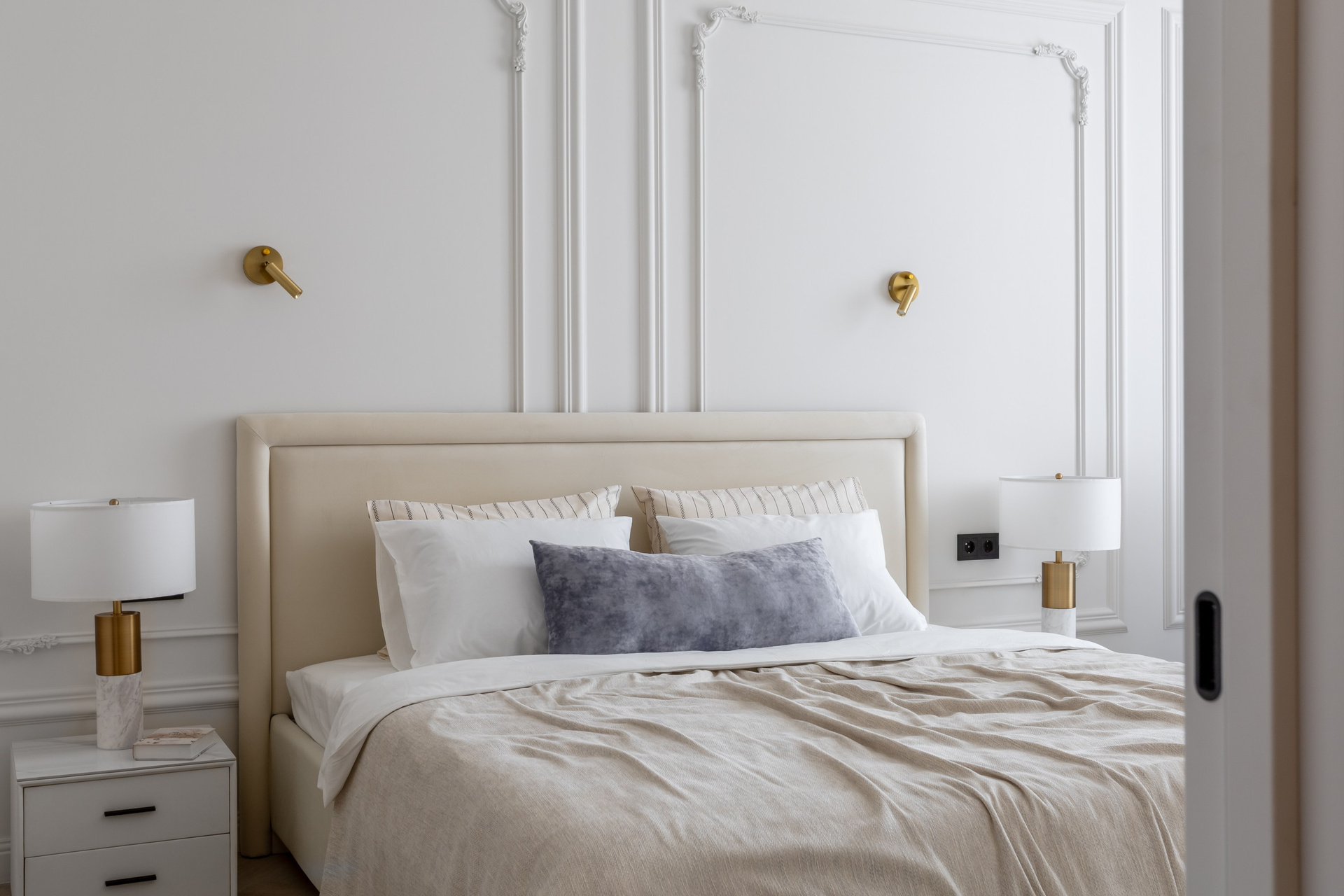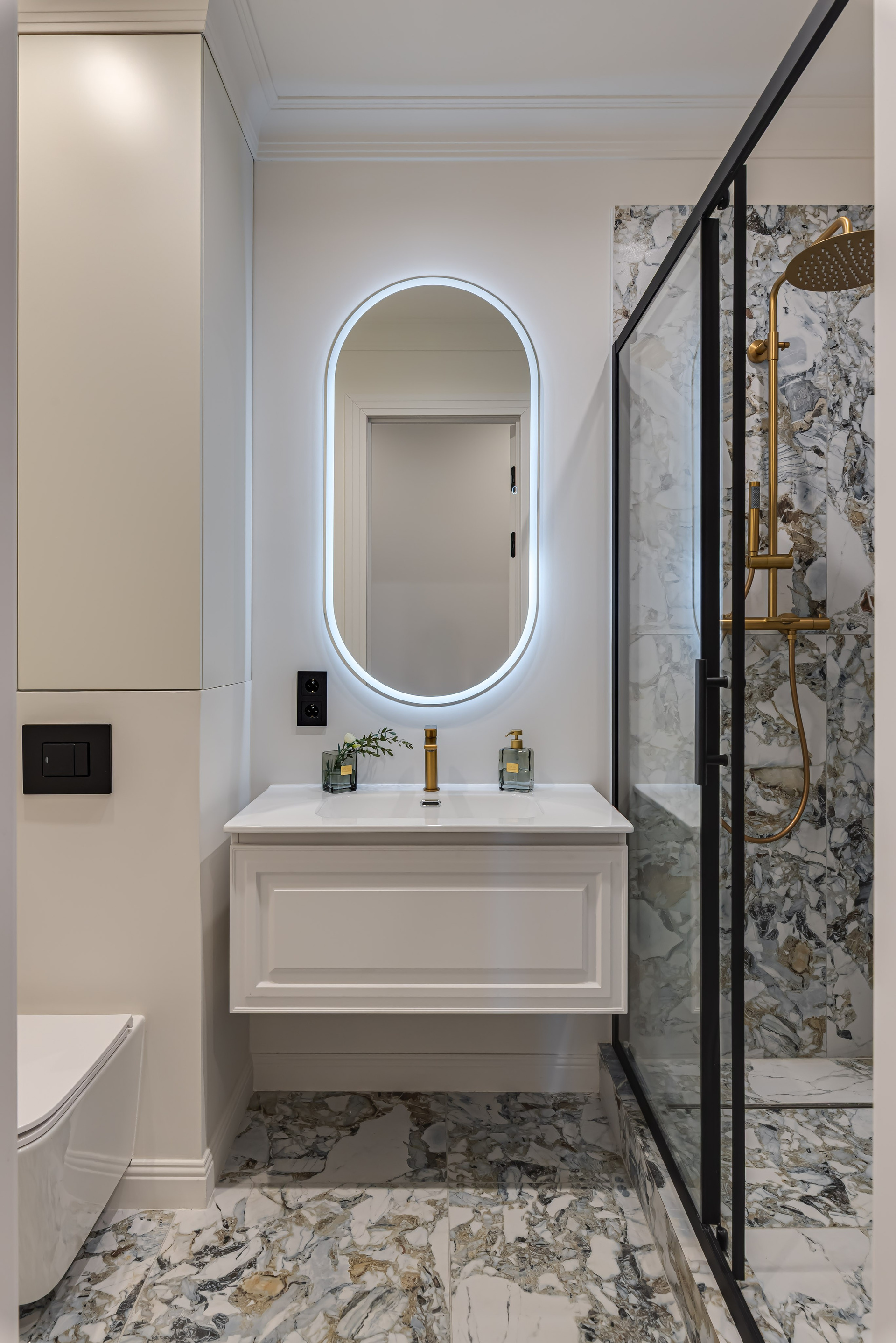 Этот дизайн квартиры был создан мной для вторички на Кутузе по просьбе флипперской компании. Это дом с богатой историей и красивыми видами. Важно было не уронить статус и при этом уложиться в нужный бюджет. И, конечно, придумать какую-то изюминку — ею стала золотая кухня необычной планировки с раковиной у окна, аля «мечта хозяйки». Фото ДО можно посмотреть в конце галереи.