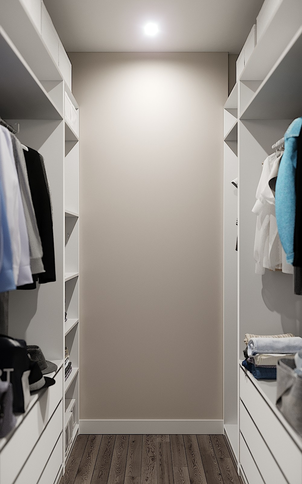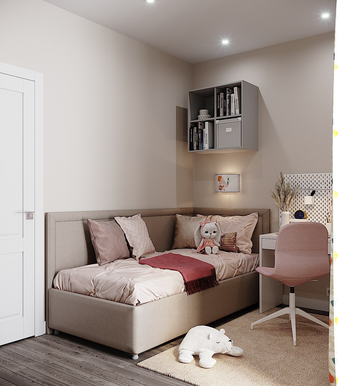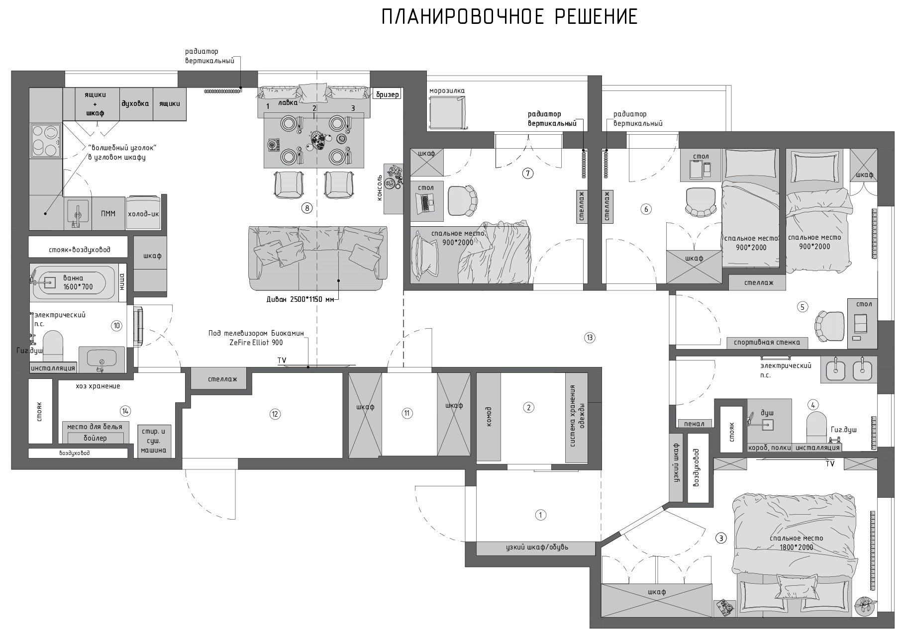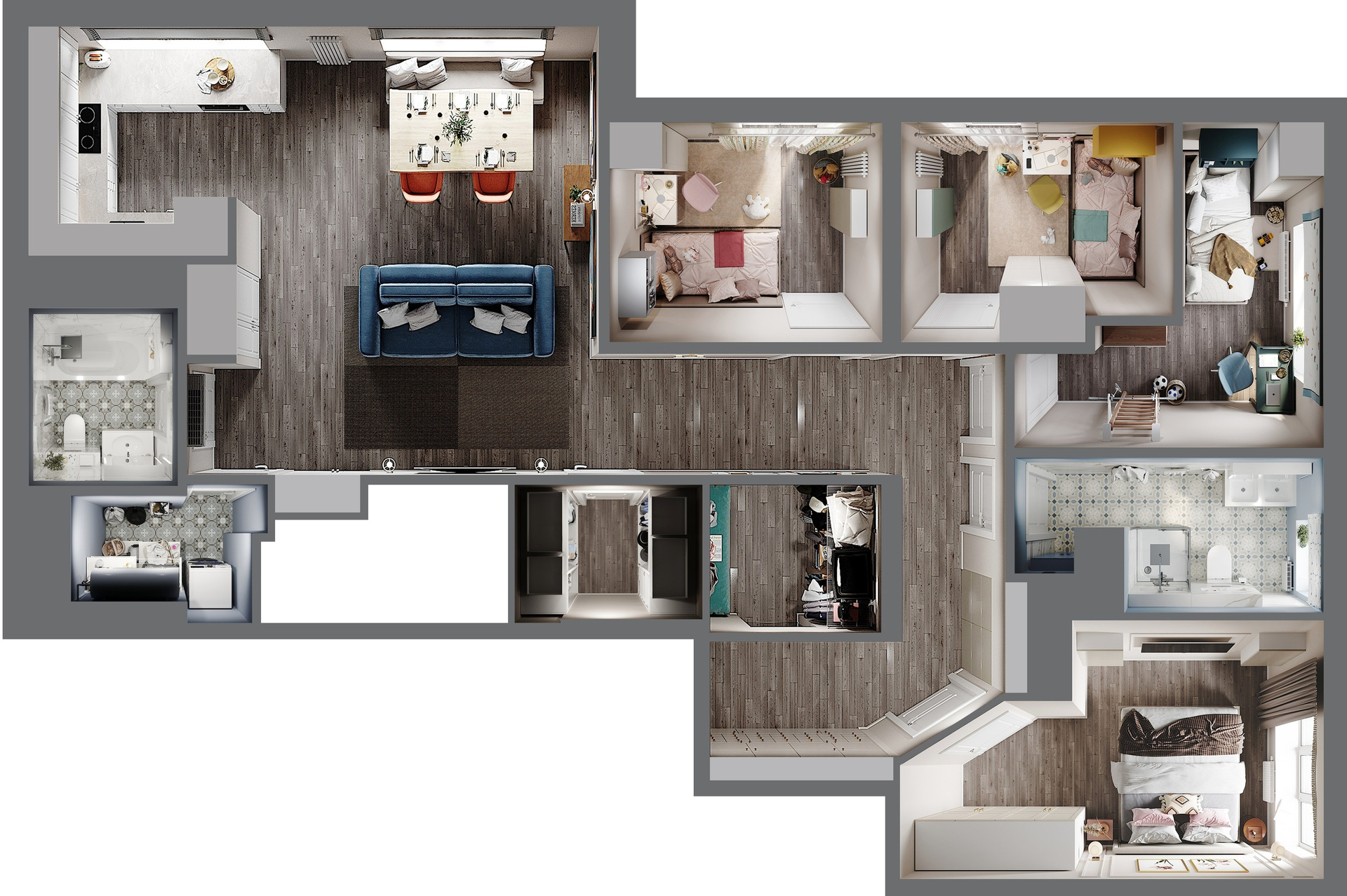 Передо мной стояла задача придумать план по объединению 2х квартир так, чтобы комфортно разместить всю семью — родителей и троих детей, каждому по своей комнате. При этом организовать очень много скрытых мест для хранения помимо индивидуальных шкафов в каждой комнате.