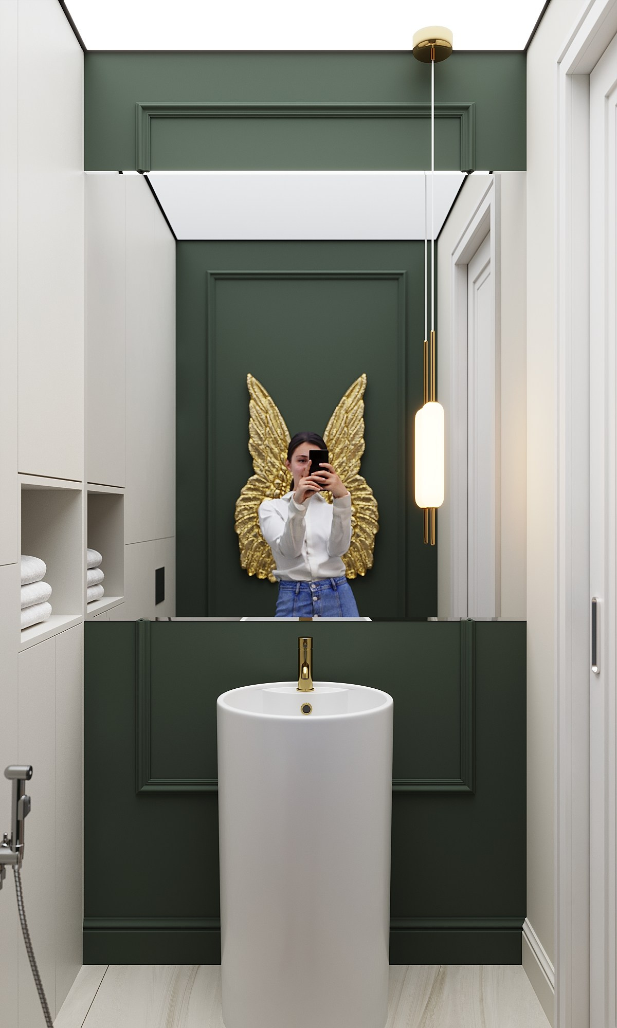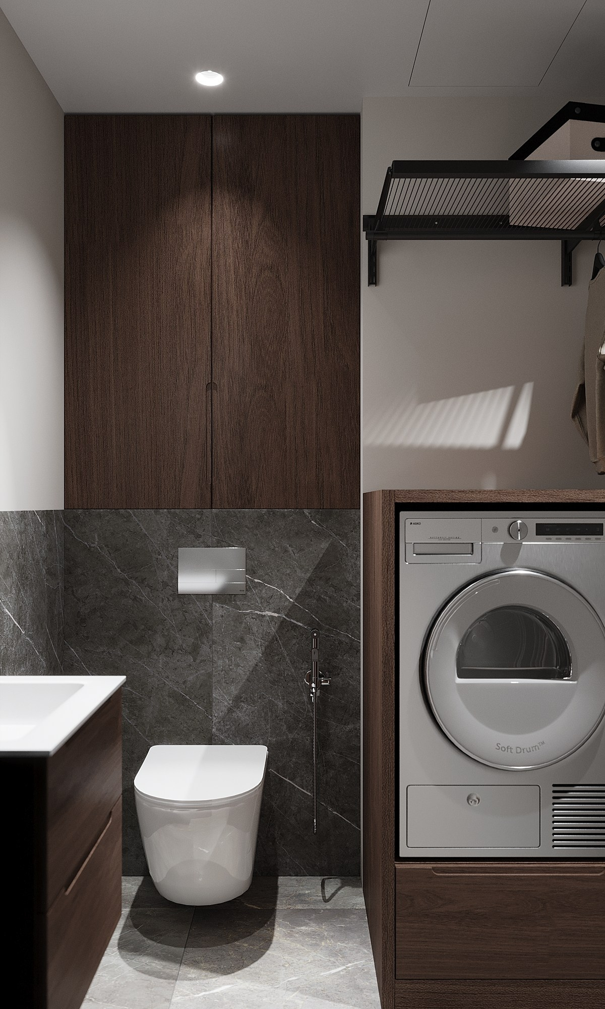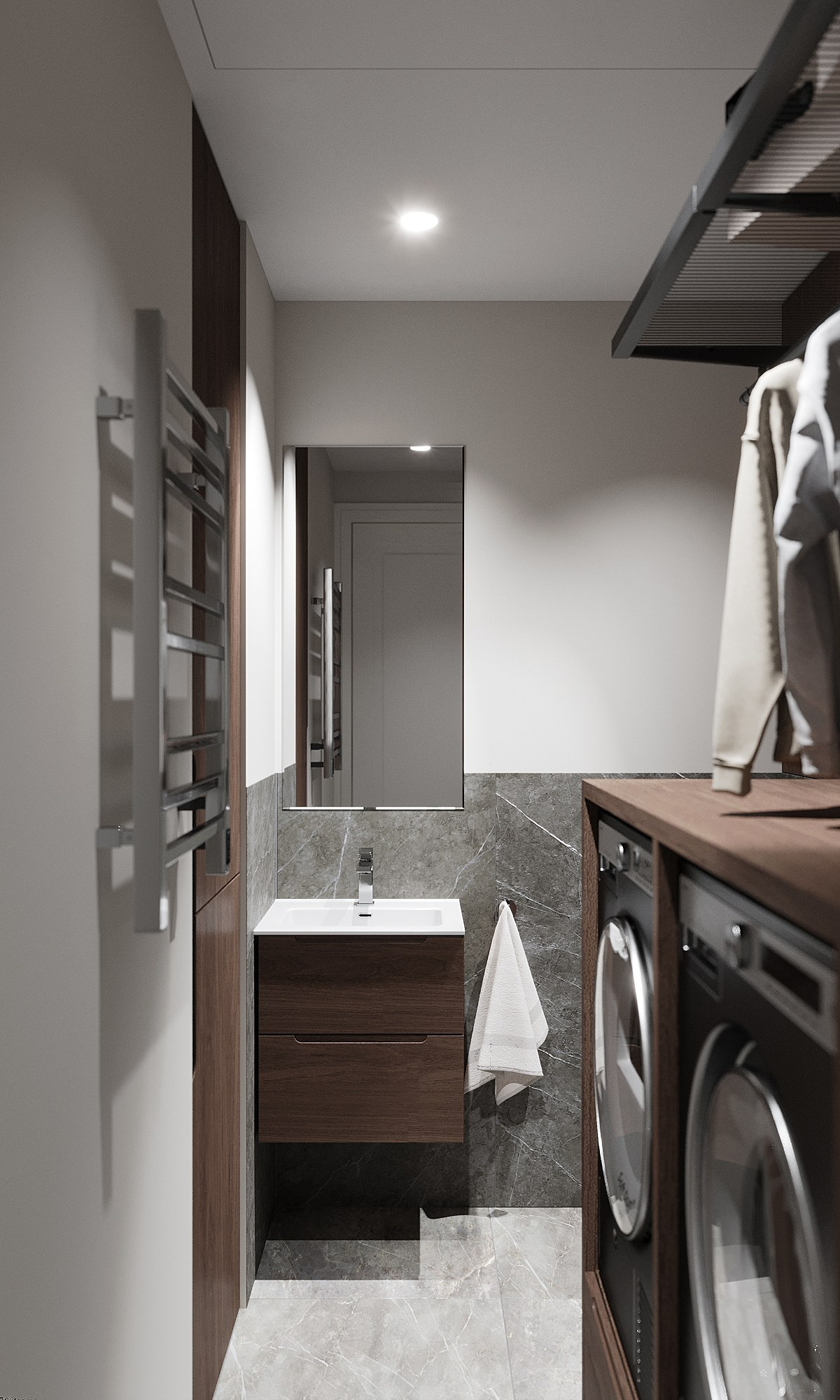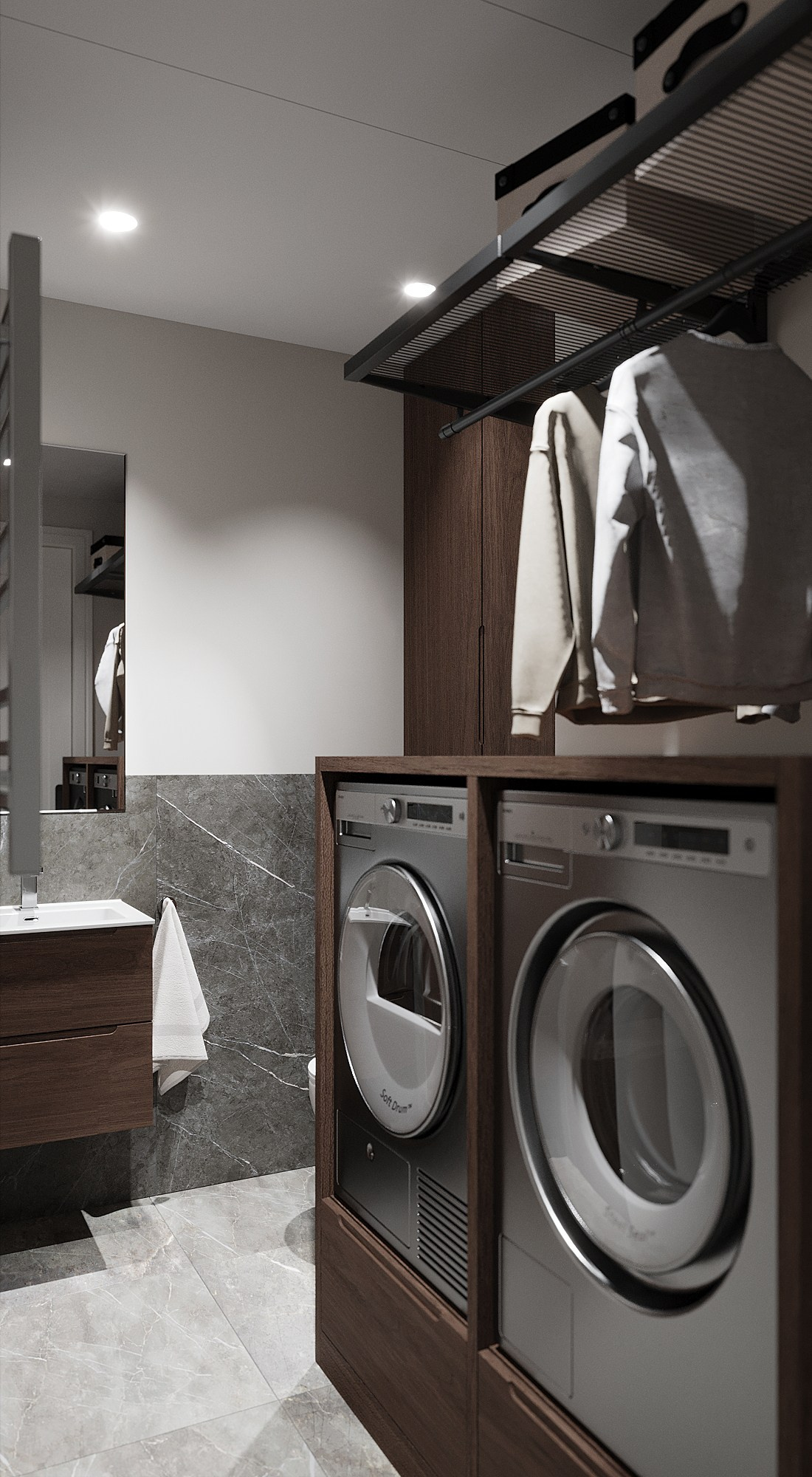 Также есть комплект санузлов, включая эффектный гостевой с зоной селфи, постирочная, а также много мест для хранения.