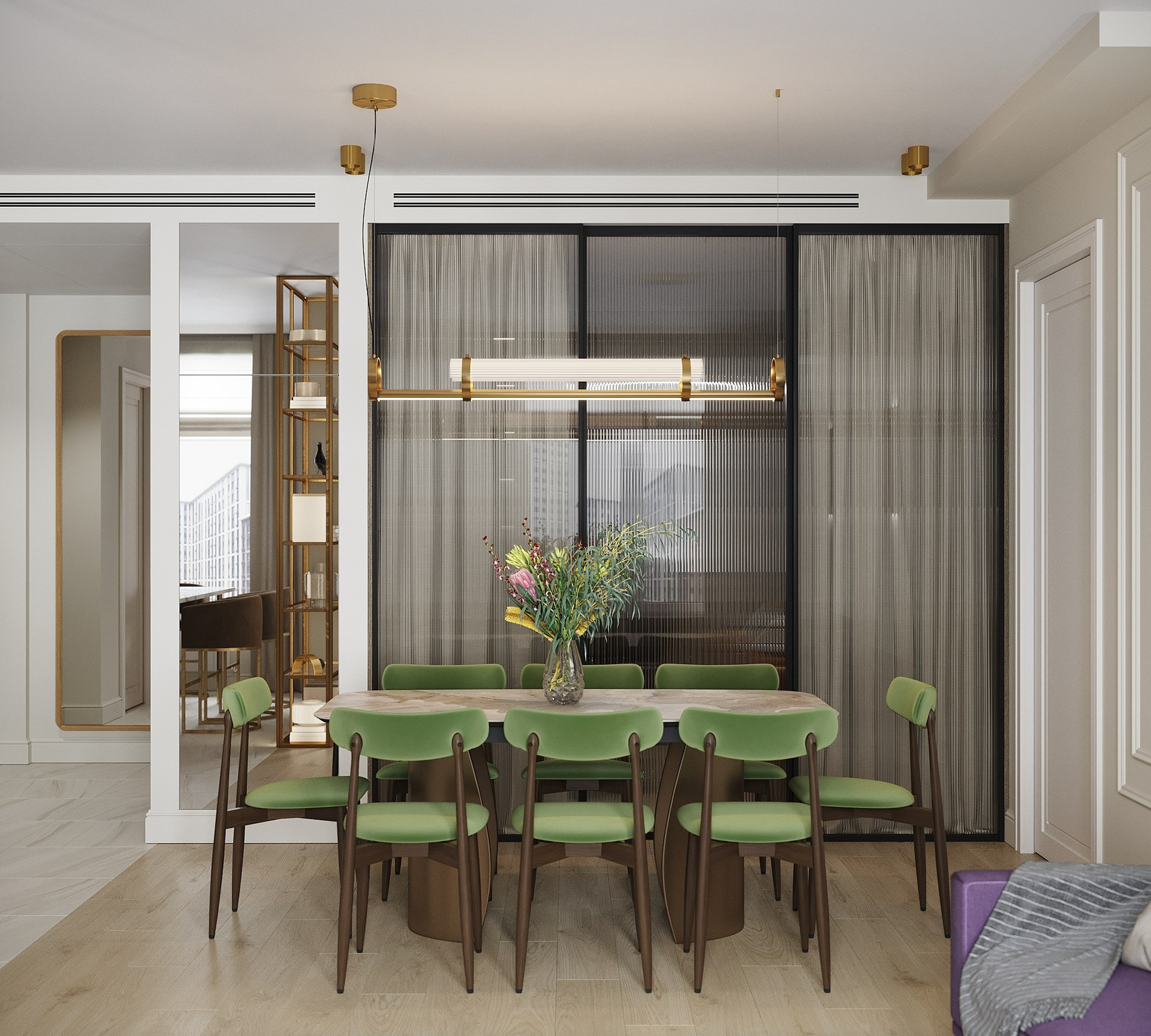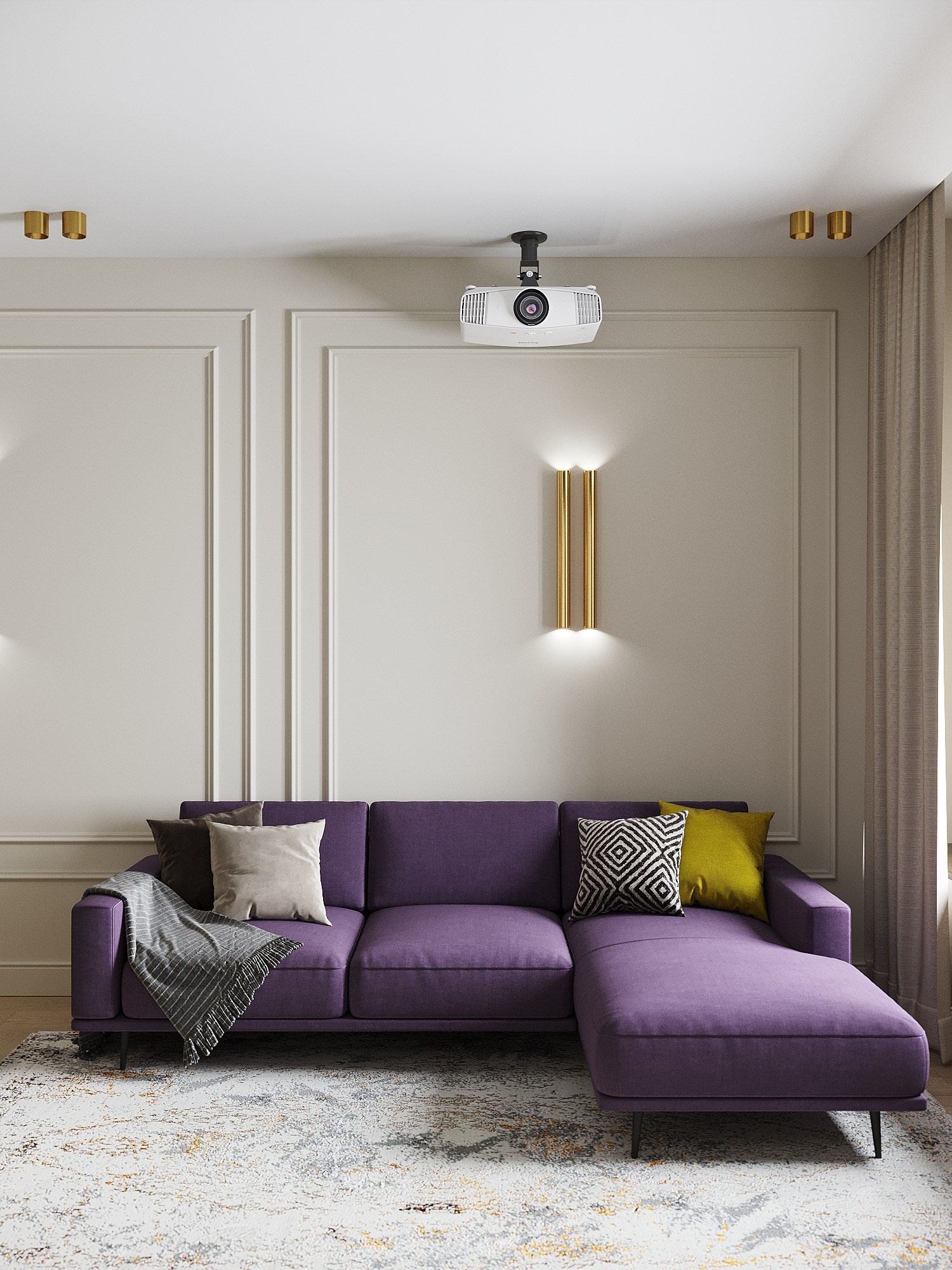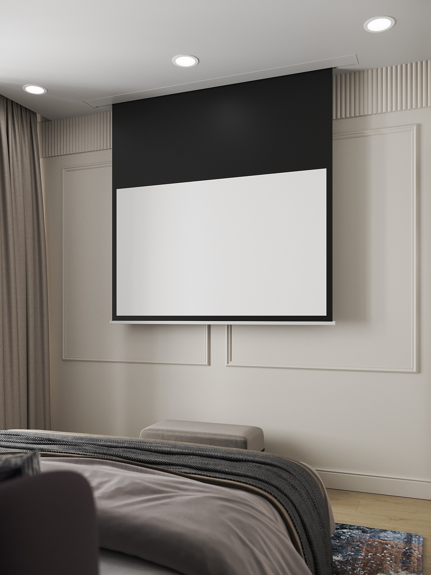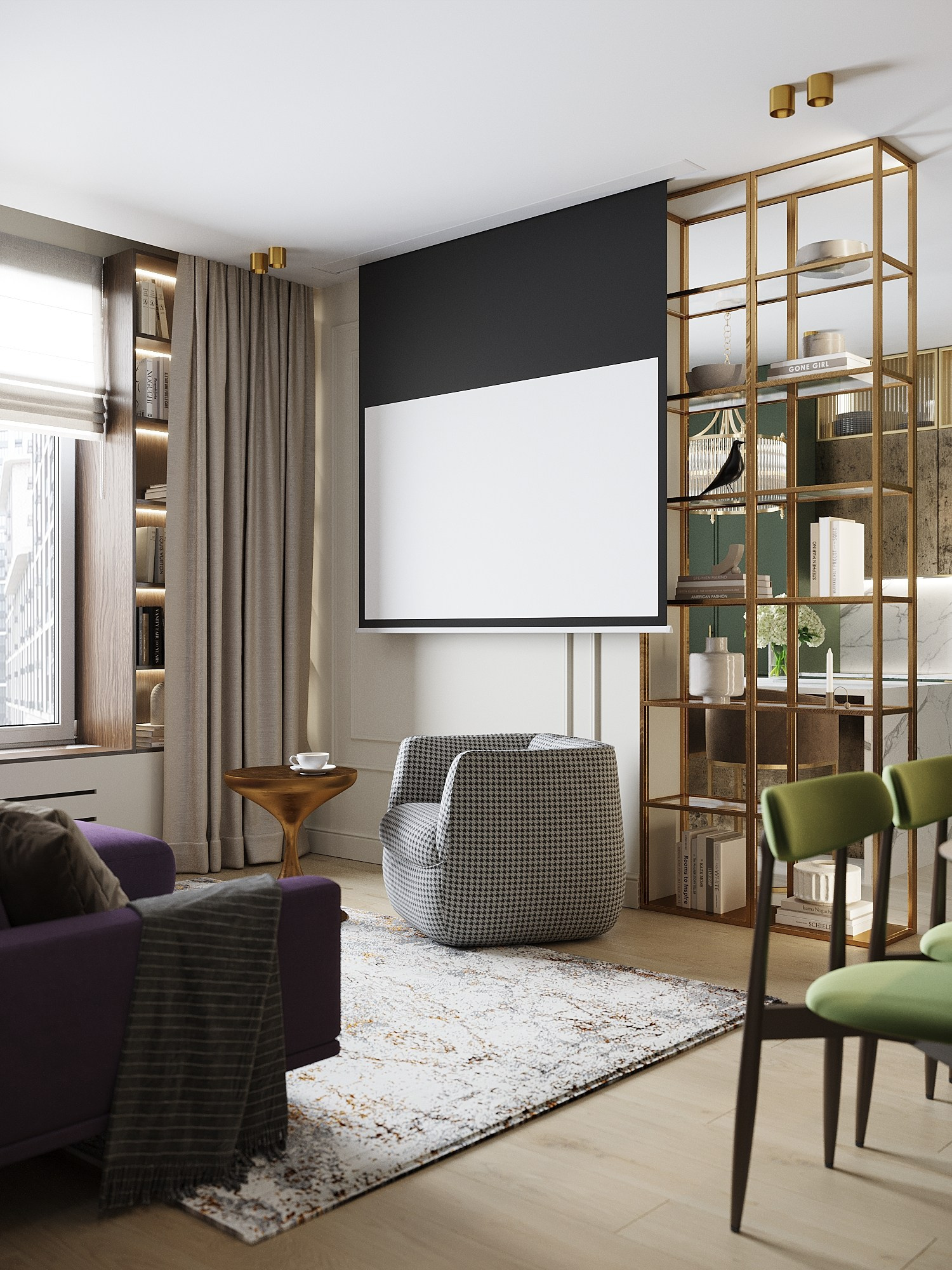 Также для семьи спроектирована большая кухня-гостиная с островом для завтраков и большим обеденным столом для приема пищи всей семьей и прихода гостей. Телевизор клиенты не смотрят, но иногда наслаждаются просмотром фильмов на проекторе, специально для этих целей встроили экран в потолок.