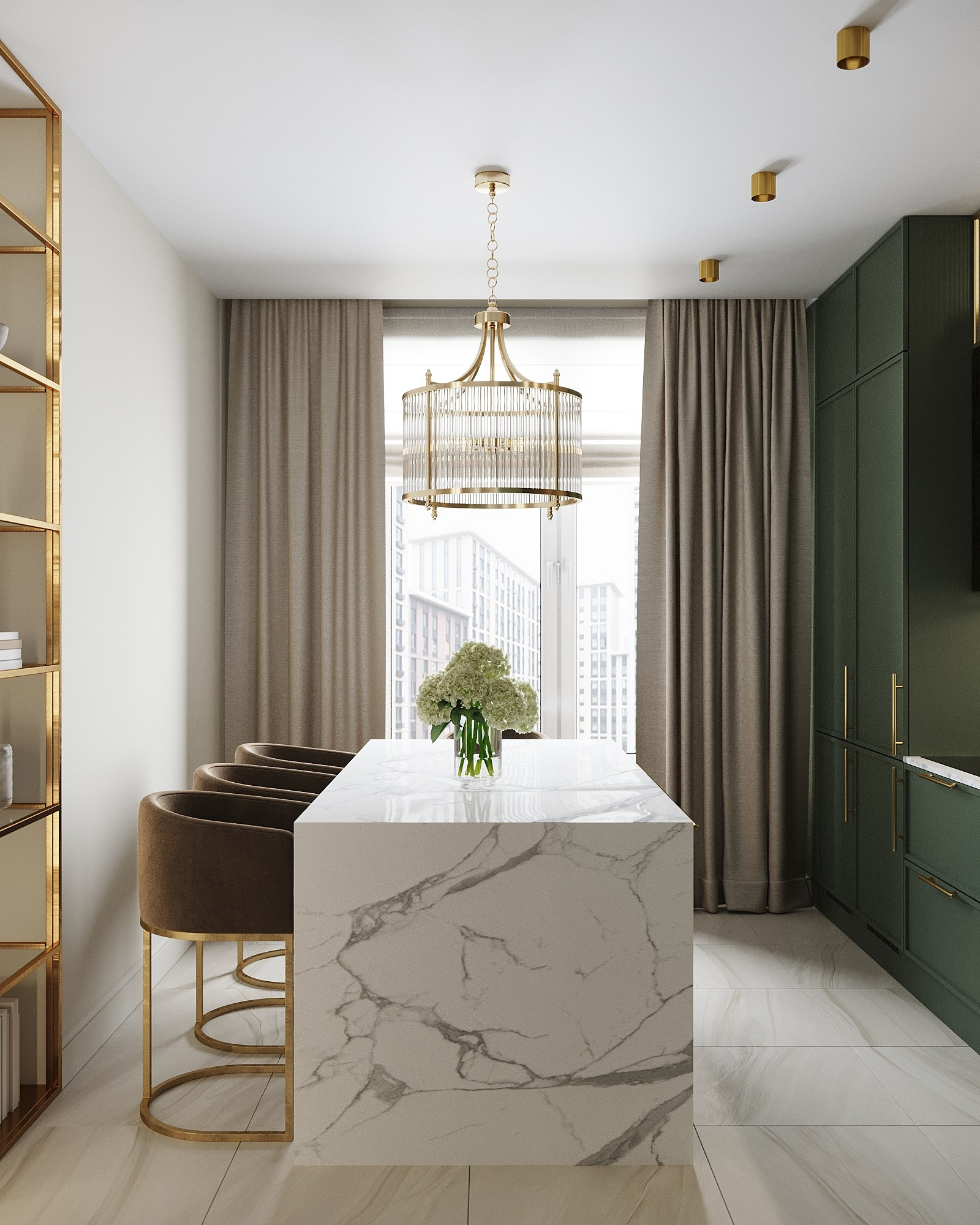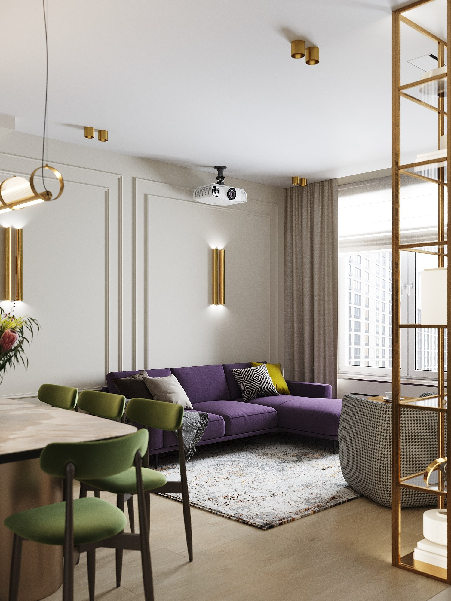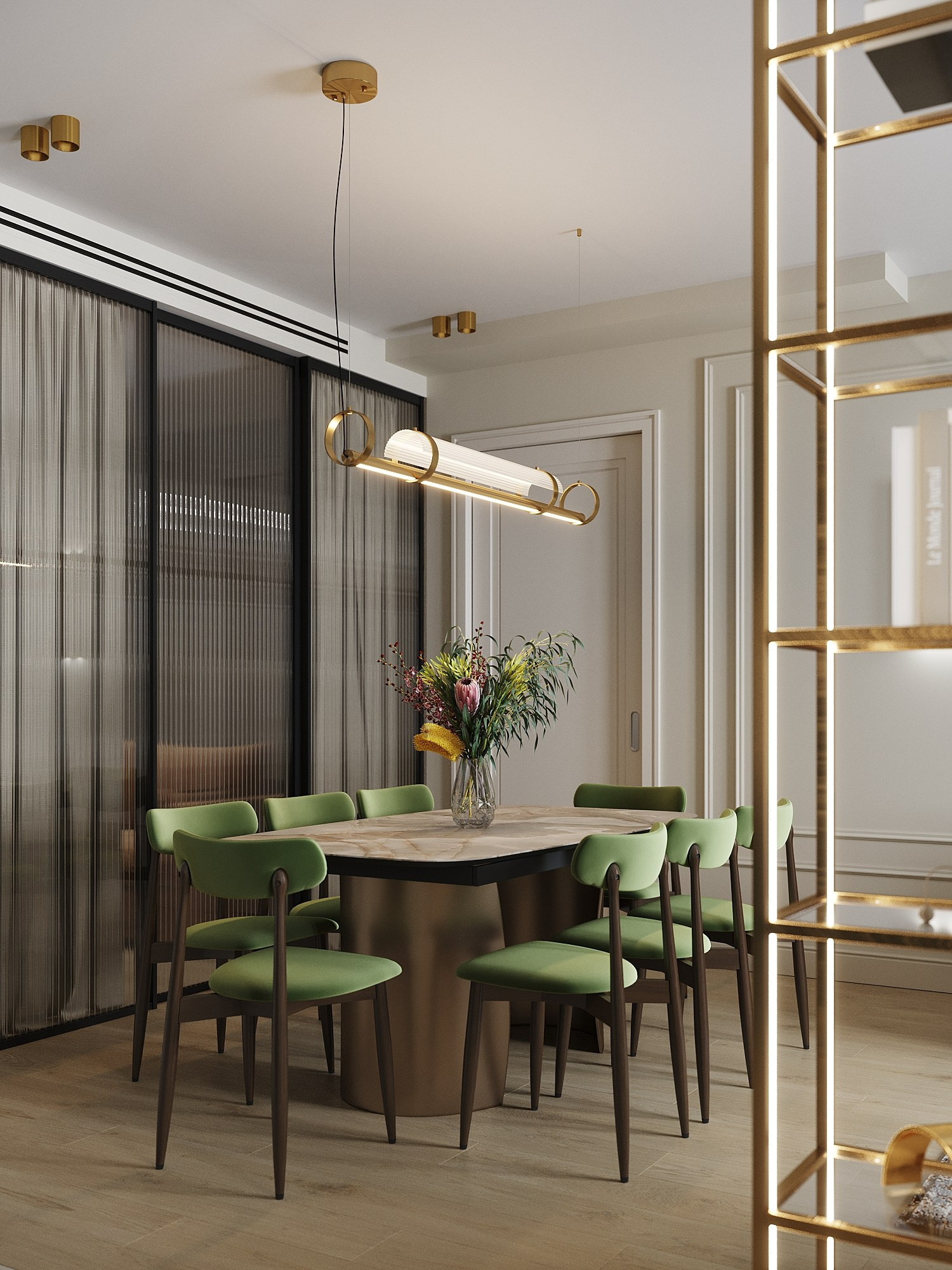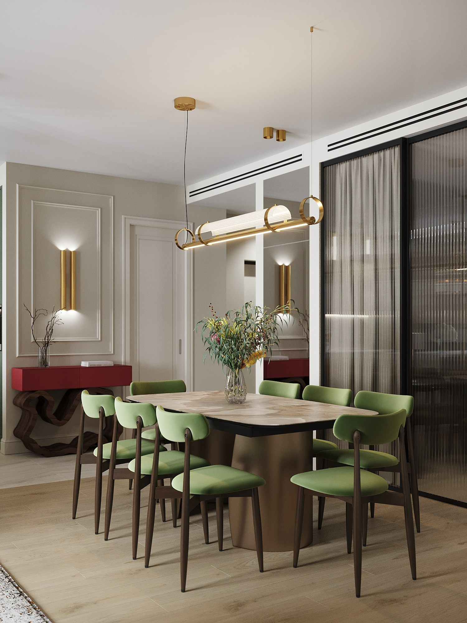 Также для семьи спроектирована большая кухня-гостиная с островом для завтраков и большим обеденным столом для приема пищи всей семьей и прихода гостей. Телевизор клиенты не смотрят, но иногда наслаждаются просмотром фильмов на проекторе, специально для этих целей встроили экран в потолок.