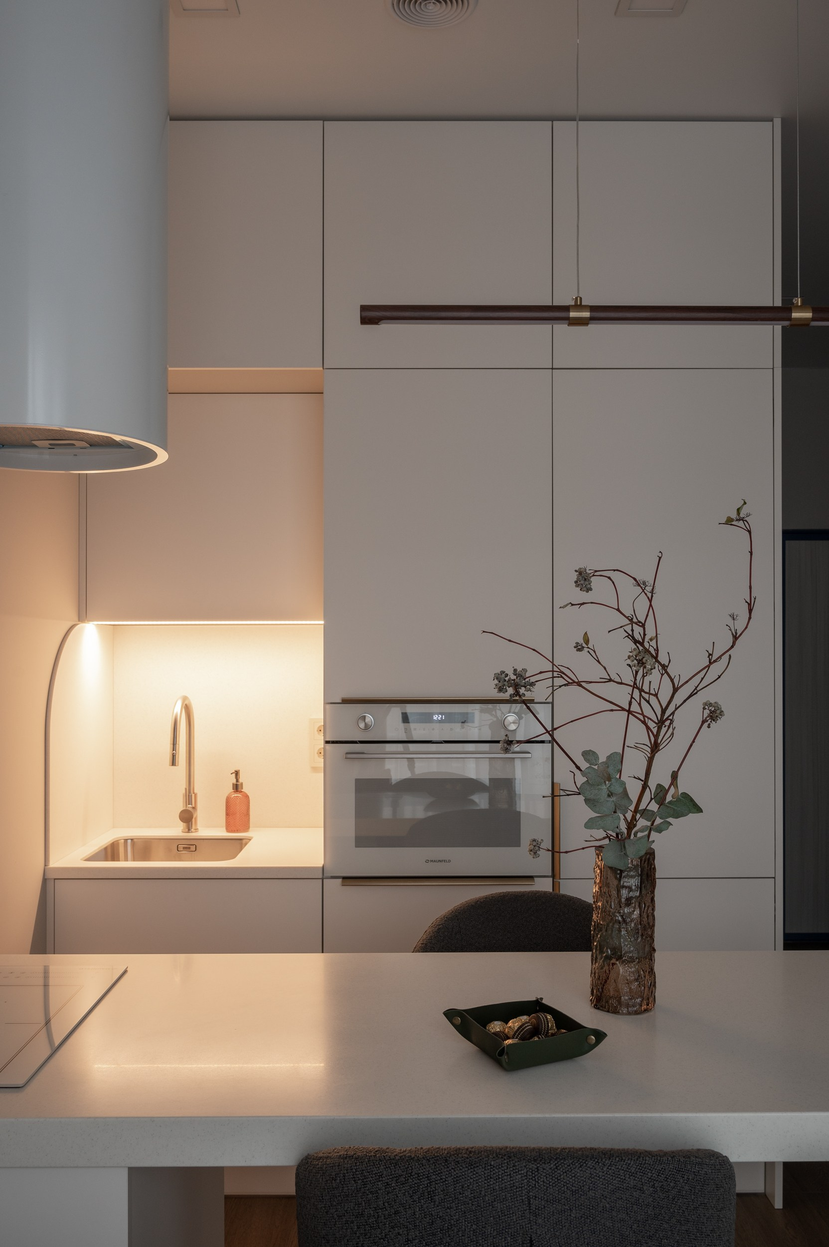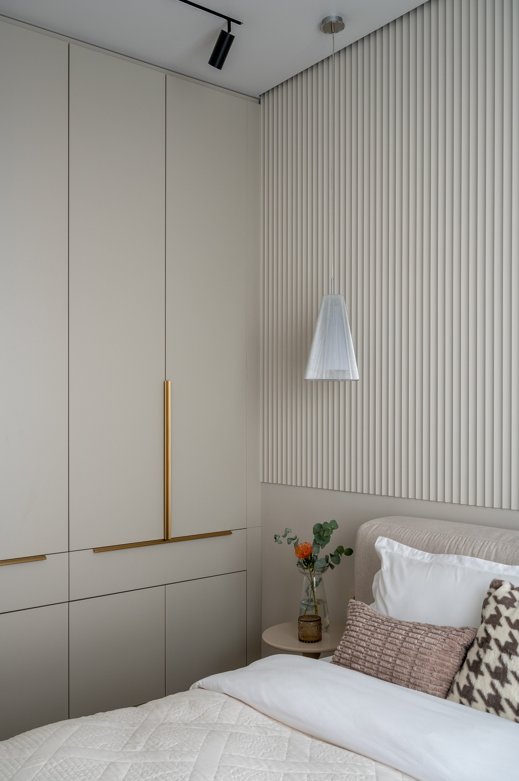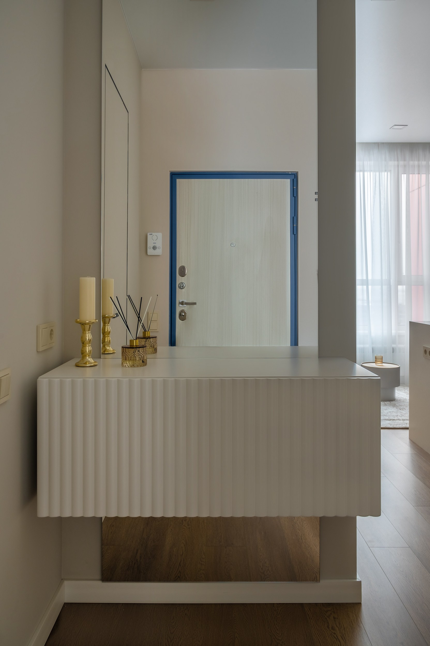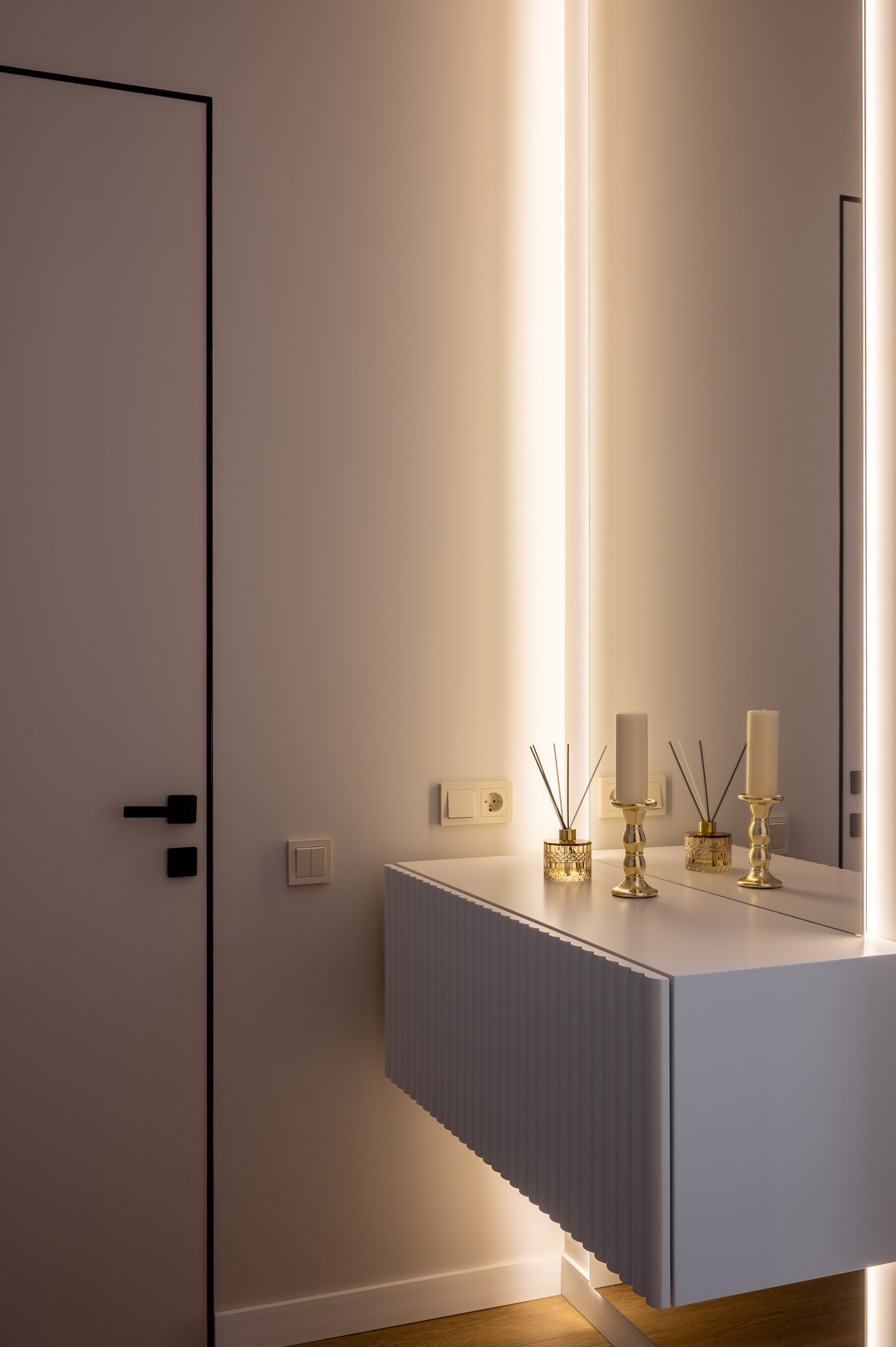 Маленькая милая квартира под сдачу. Моей задачей было улучшить планировку от застройщика — я добавила гардеробную, перенесла дверь в спальню, чтобы сделать огромный шкаф, и спроектировала нейтральную отделку, которая будет долго актуальной, легко восстанавливаться в случае повреждений и при этом нравиться очень многим людям. Как обычно, я добавила много видов освещения — и верхний уровень, и средний, и различные подсветки. Теперь в этой квартире не только функционально, но и очень эстетично.